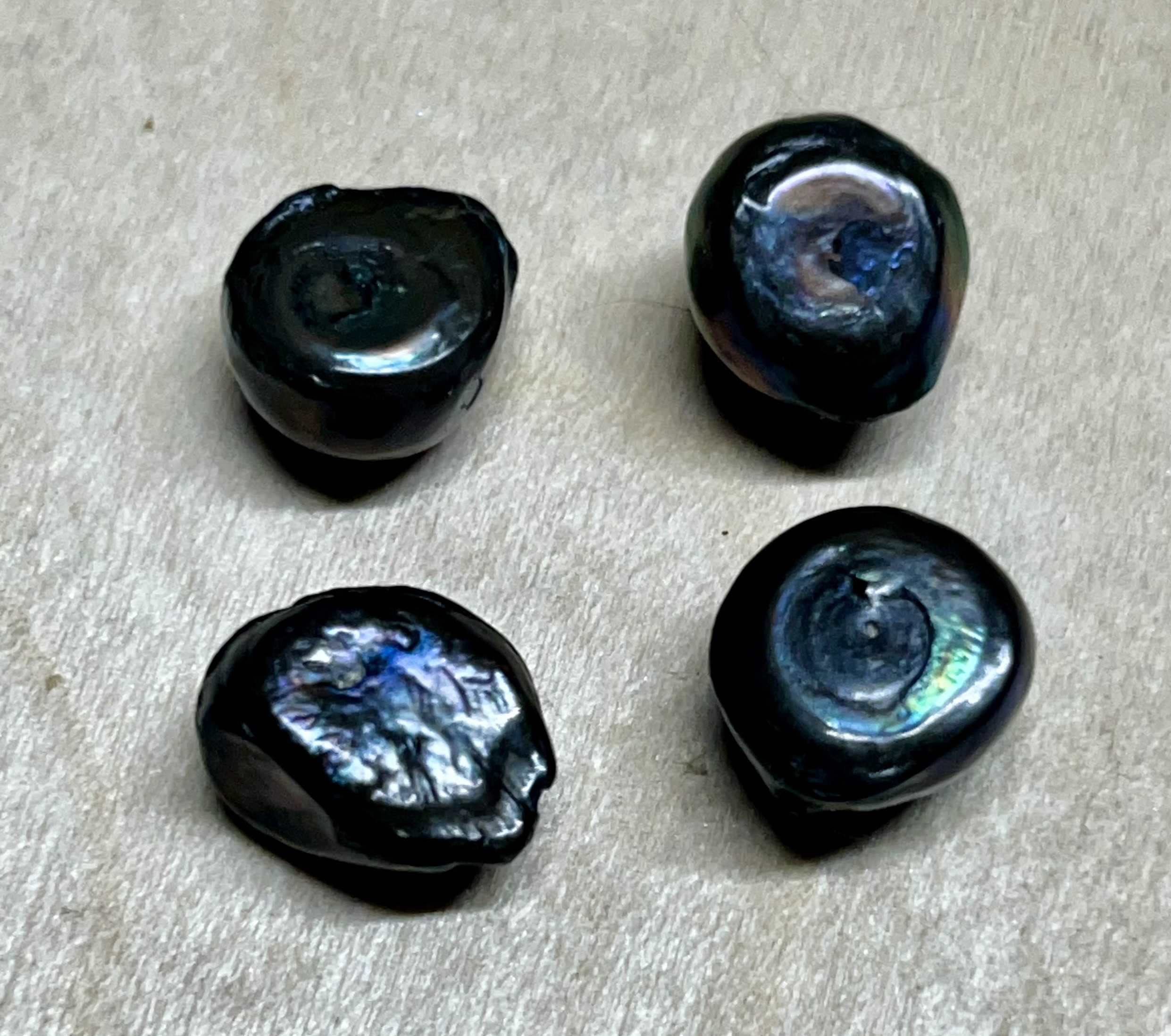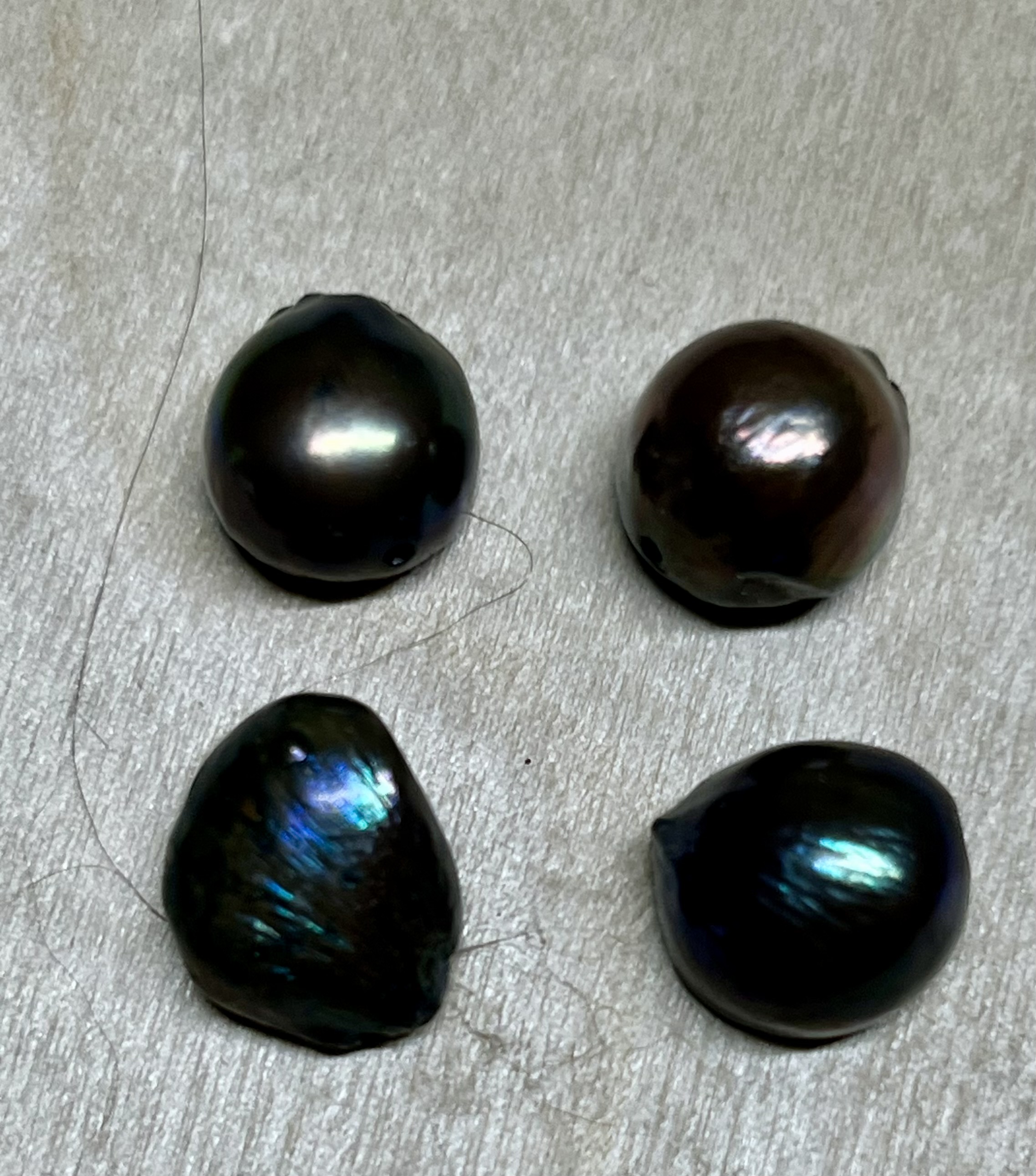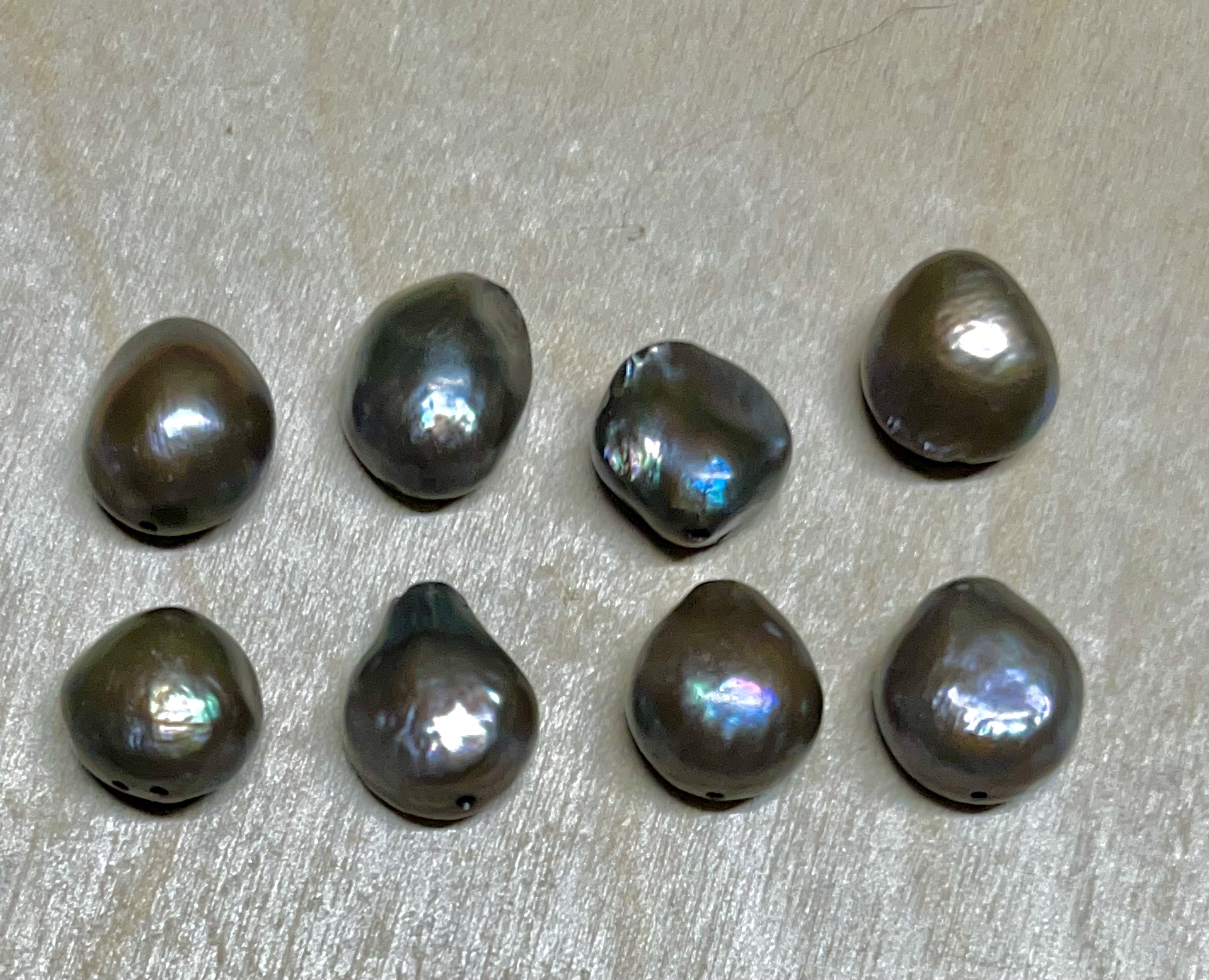 I’m not sure exactly what these particular pearls are. They are loose drilled pearls that range in size from 1.5 grams to 2.0 grams. In the photos I have kept the positions the same and flipped the pearls so that you can see both sides. I’ve also included some close up that follow the same layout out. In addition there are some loose pearls of a lighter grayish-bronze color. Their size range is approximately the same as the others(1.5 grams to 2.0 grams).