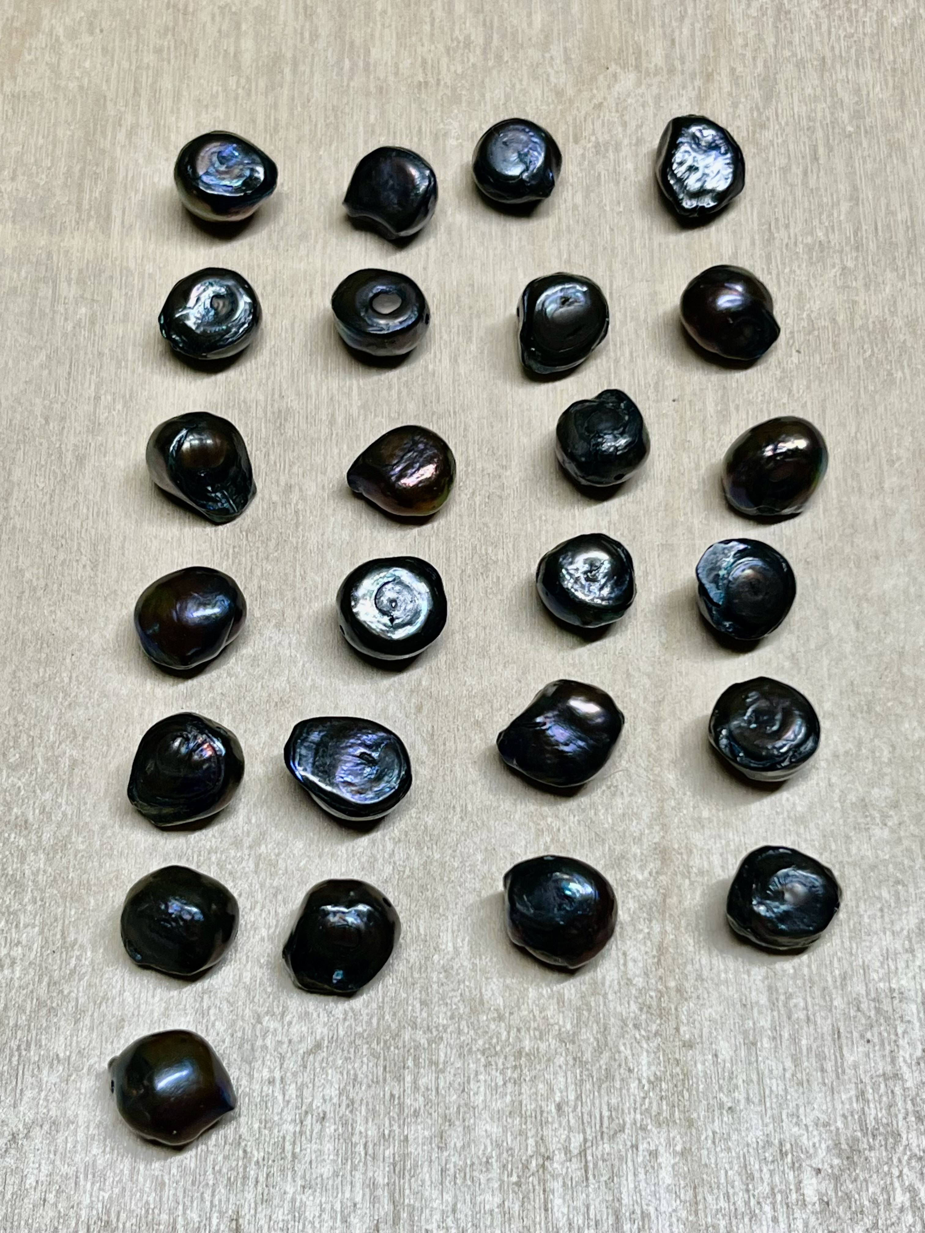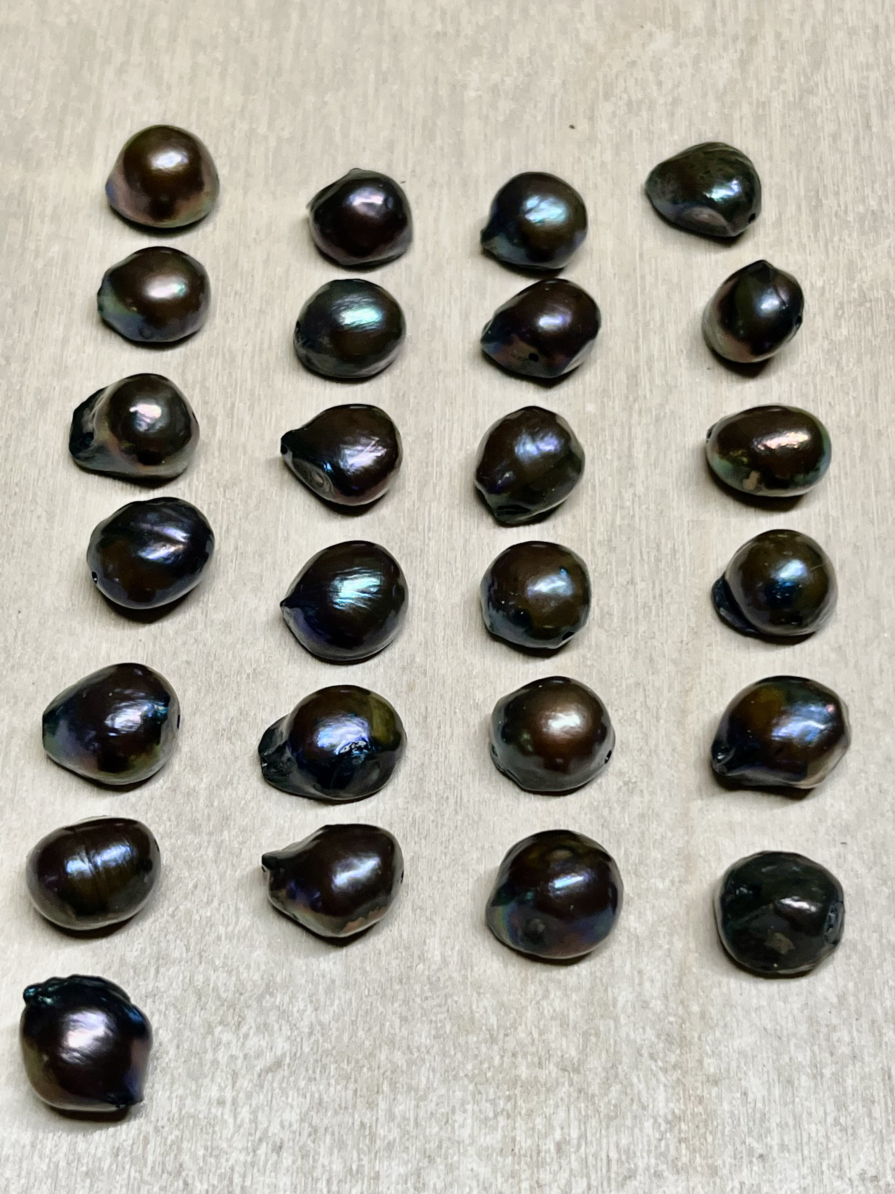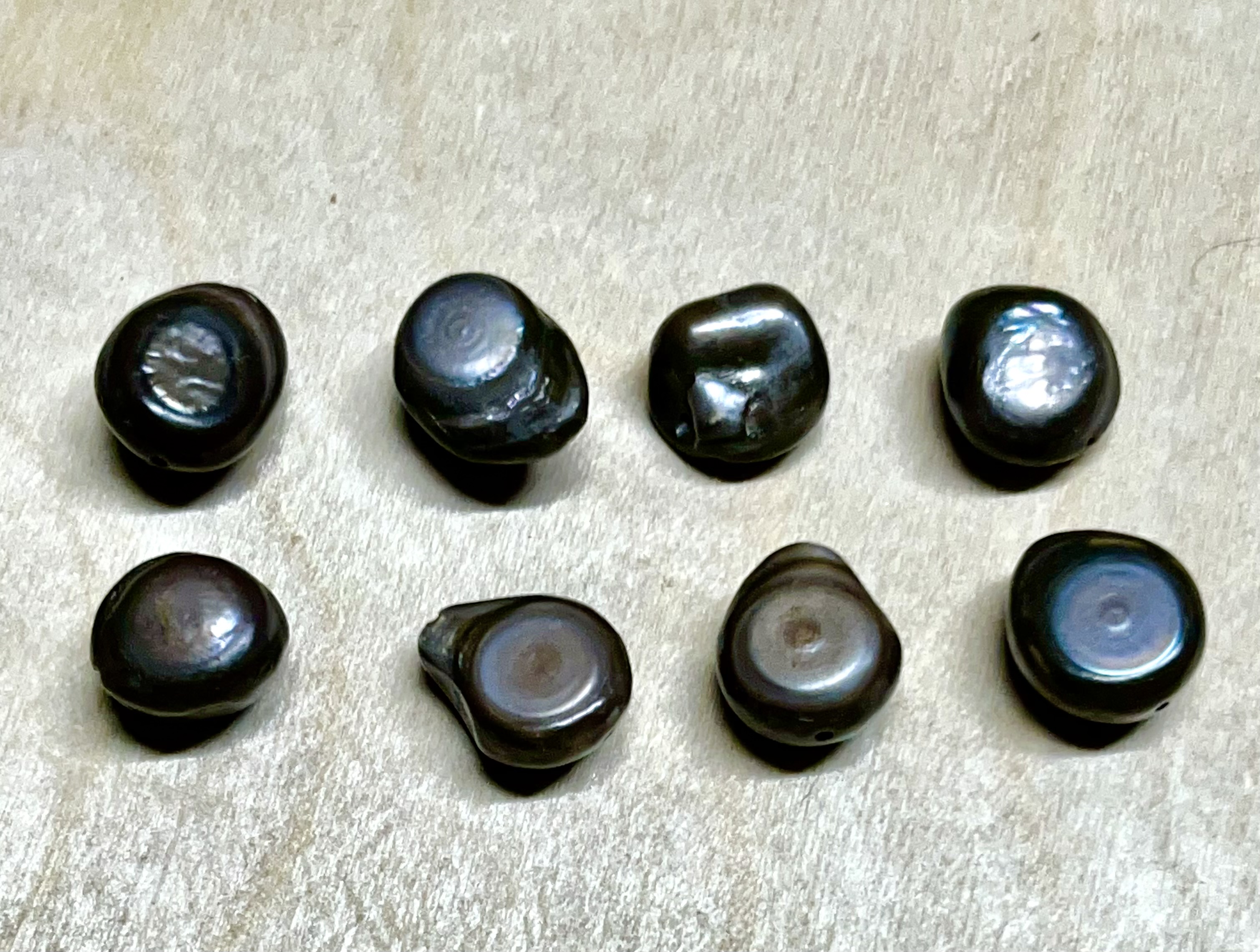 I’m not sure exactly what these particular pearls are. They are loose drilled pearls that range in size from 1.5 grams to 2.0 grams. In the photos I have kept the positions the same and flipped the pearls so that you can see both sides. I’ve also included some close up that follow the same layout out. In addition there are some loose pearls of a lighter grayish-bronze color. Their size range is approximately the same as the others(1.5 grams to 2.0 grams).