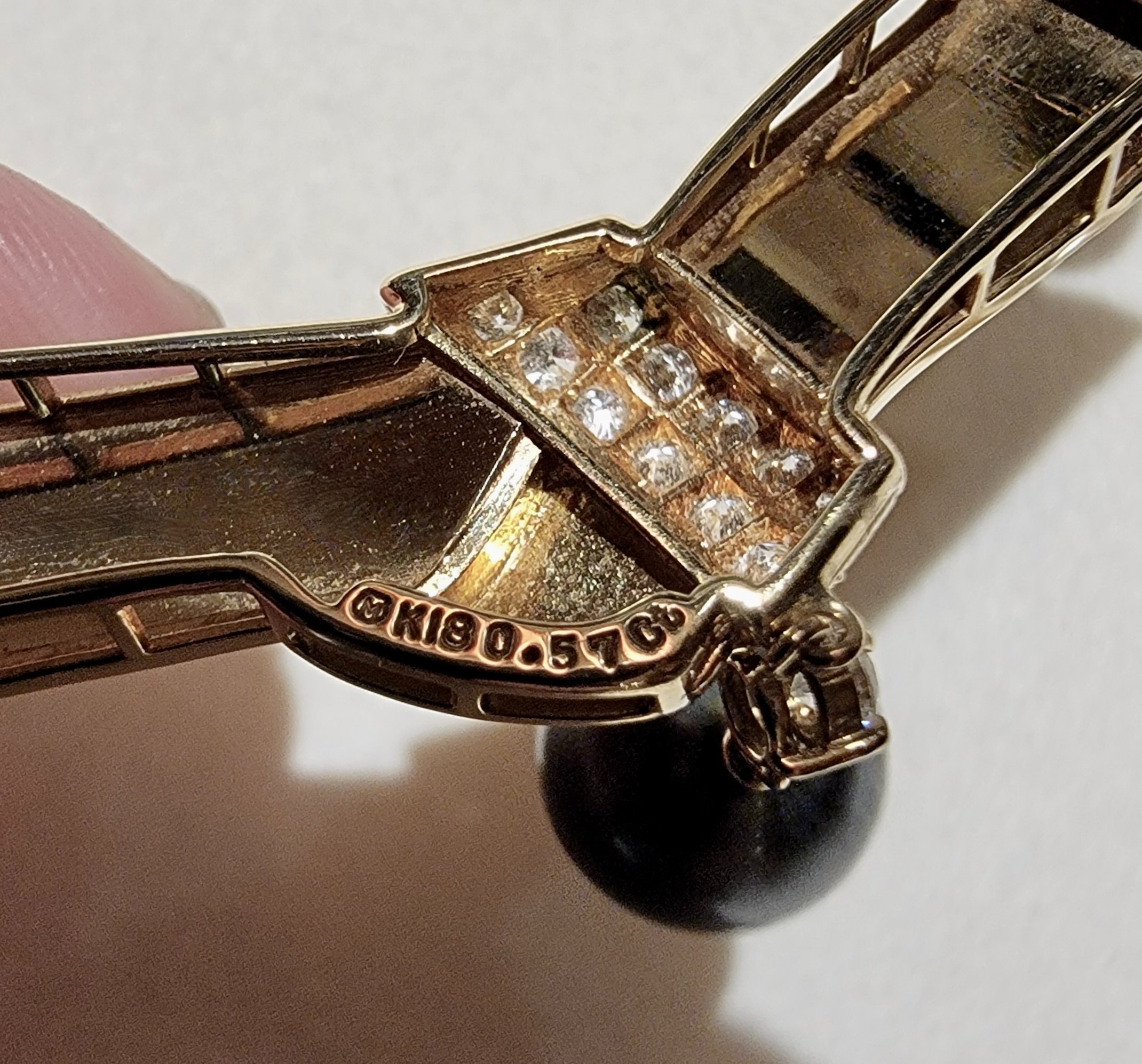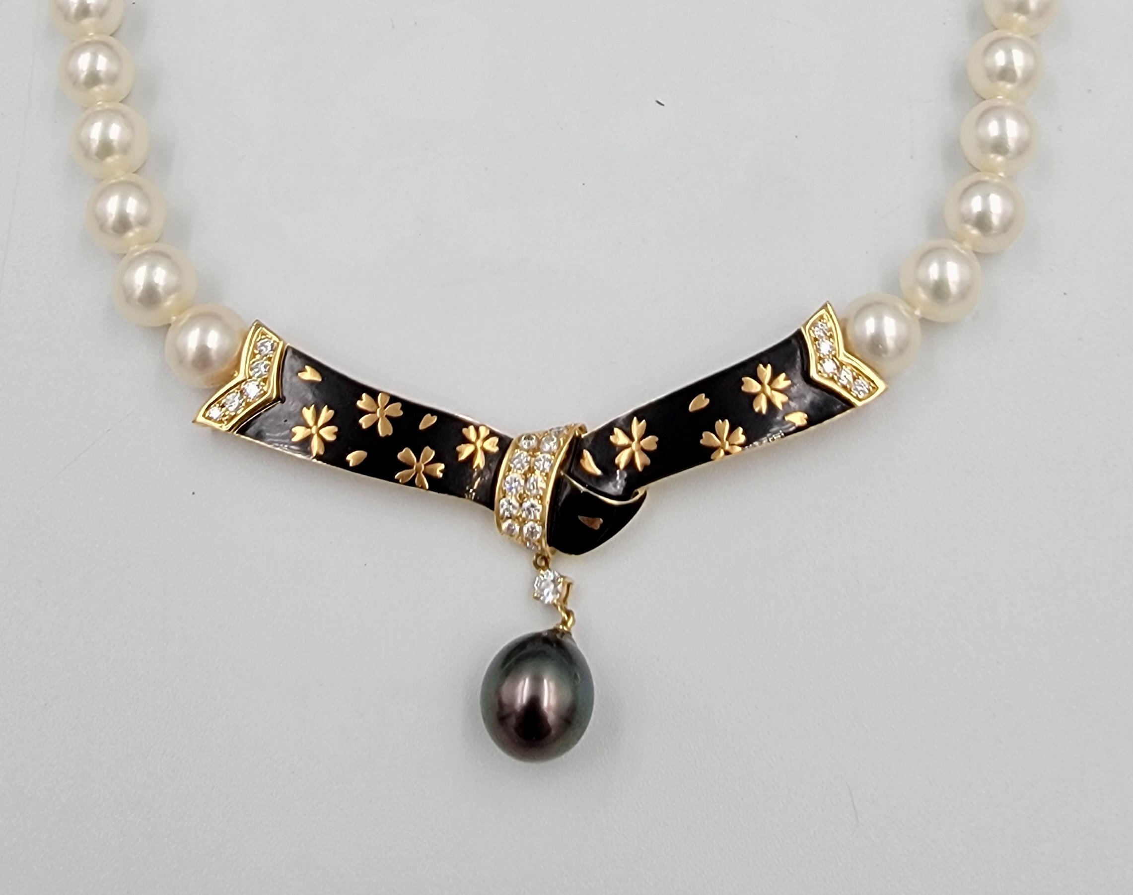 Hello all and happy Sunday. I have an identification issue and in desperate need of assistance from the Experts On All Things Mikimoto. I inherited this very lovely Mikimoto pearl necklace almost 3 years ago (see below!), and try as I might, I cannot find one iota of information on it (i.e., date, style line, origination, etc). I could understand if it was a vintage creation, but this one appears to be somewhat newer. I searched everything regarding "Mikimoto enamel" thinking perhaps it may have been part of an enamel line they created, but there was nothing. Maybe Japan? My search there was limited and their main store branch had nothing either. So at this point I'm thinking that Miki only made one and then thought the hell with it (kidding). I am praying someone here might have maybe seen this necklace, or maybe knows someone who has? I have often thought of contacting their NY office (I have to call and not email because their site will not allow the uploading of pics, which was probably done on purpose to curtail people like me from wasting their time begging for information. So I never called. My fingers are crossed and I am hoping the Mikimoto pearl experts here can shed some light on this or at least point me in the right direction, or in any direction for that matter. I cannot die and pass this task on to my 2 daughters -- they're ill-equipped and will lack the stamina. The necklace is 18k with diamonds, 8mm pearls, and gold designs embossed upon a black enamel background. Fully marked on the back. (Sometimes you can tell if the piece was created in Japan by the style font that was used when stamping the gold content, but this one appears borderline, so I'm not discounting it.) Anyway, you guys are great and I hope you enjoy what is remaining of the weekend!