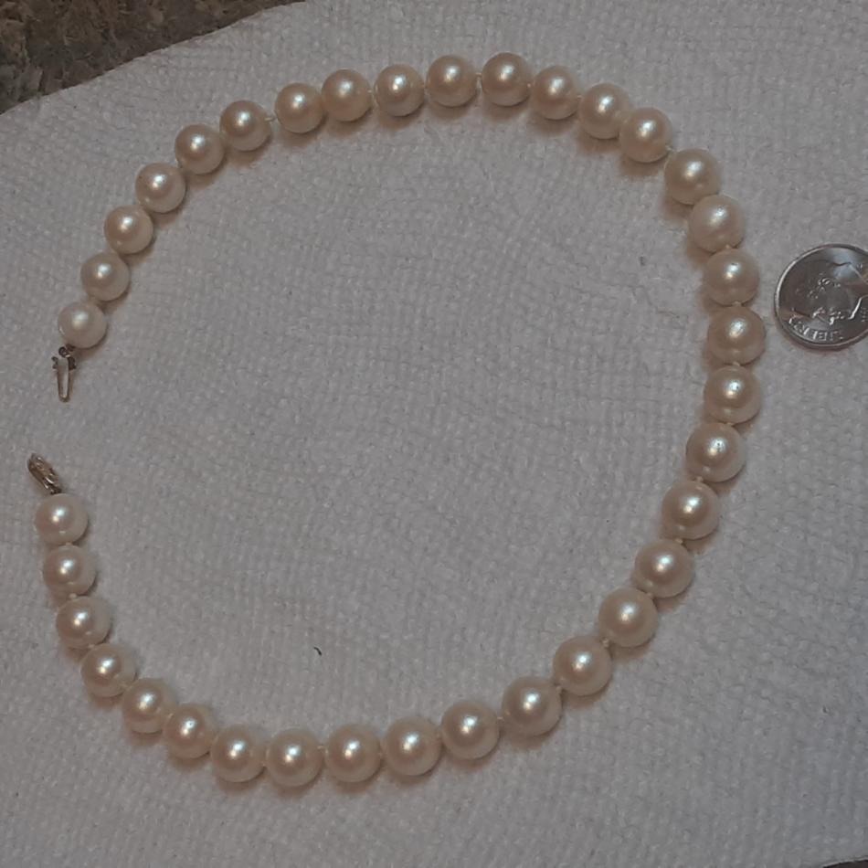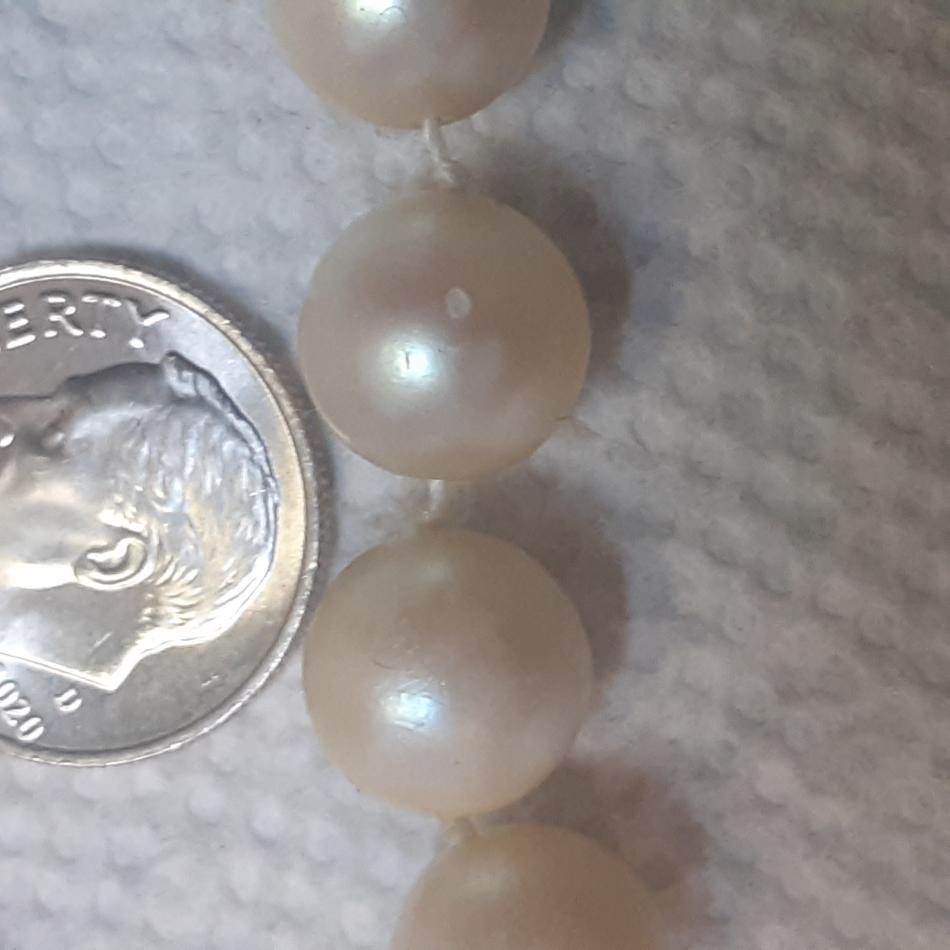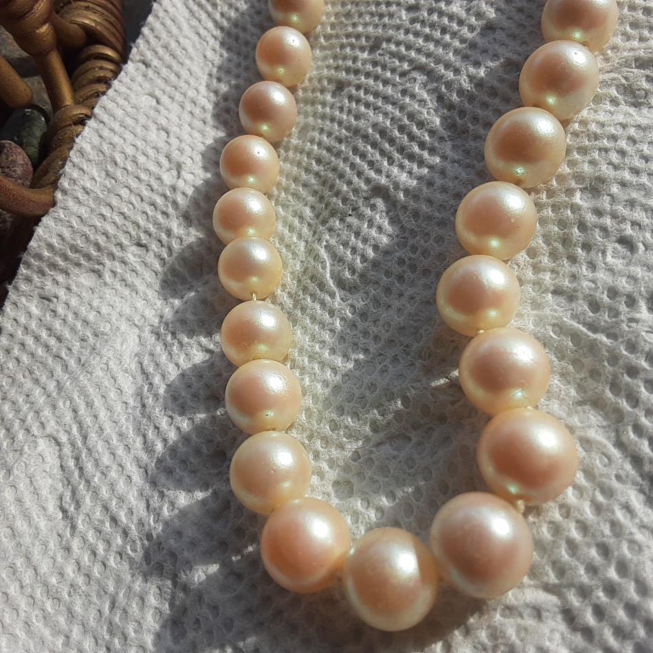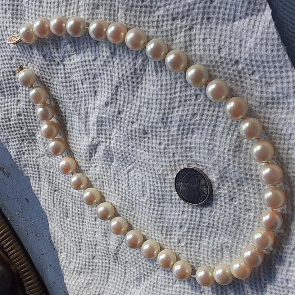 Picked this up at small town 2nd hand store a week ago, clasp says 14KG, I've gently cleaned them, they were very grubby, and yellowed, passed the tooth test, heavy and colder than any faux pearls l have, but not sure what kind, or quality. They were hanging up with a big display of vintage jewelry of all sorts, but I'm always straight to the Pearl's, lol! Seems some damage to one by clasp, and possibly some glue residue on several others as well. Will try to upload photos now, tia for any information!