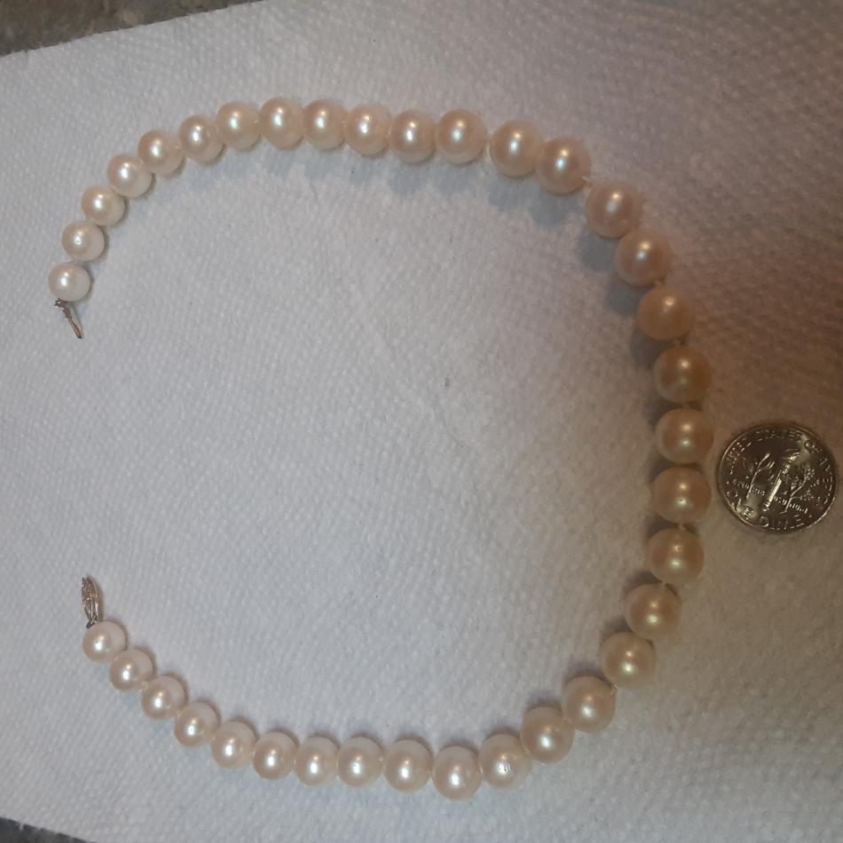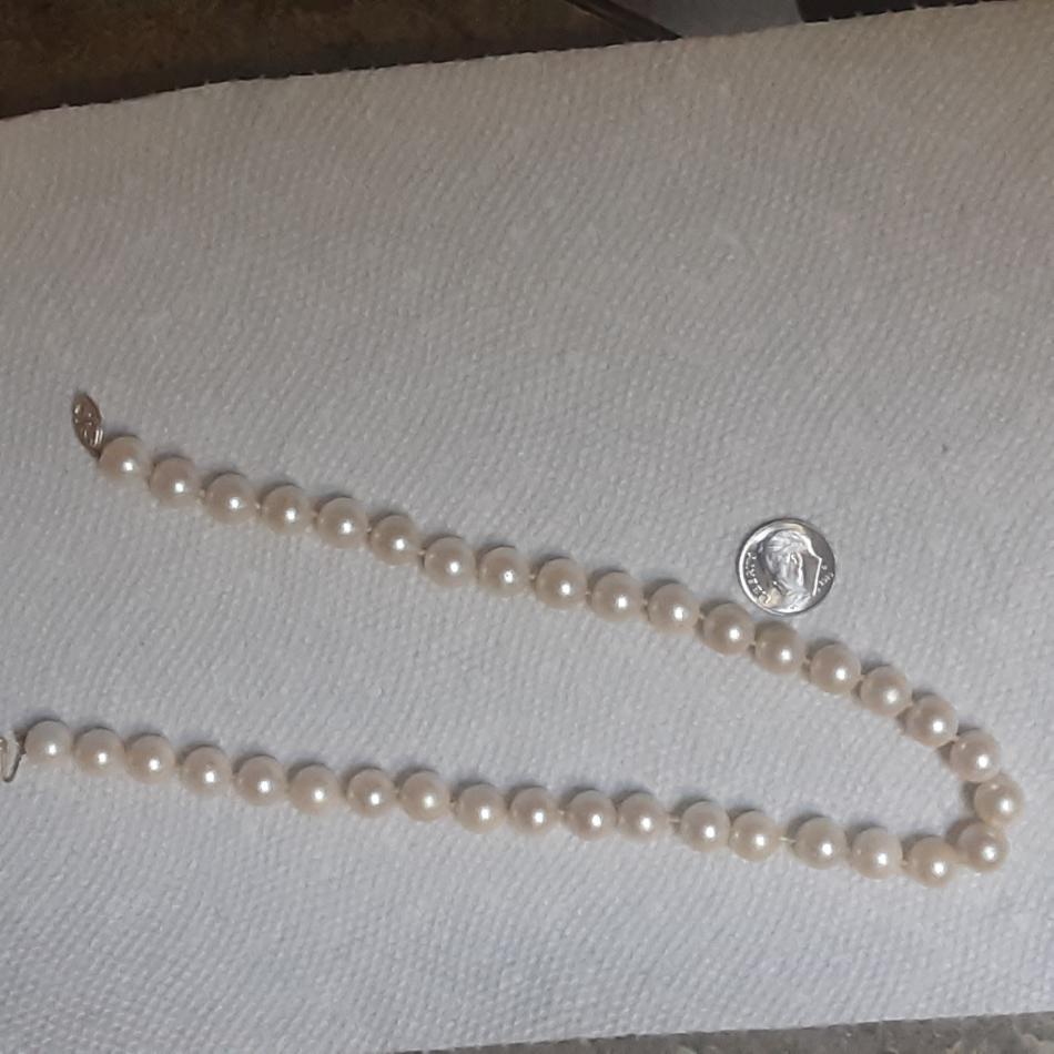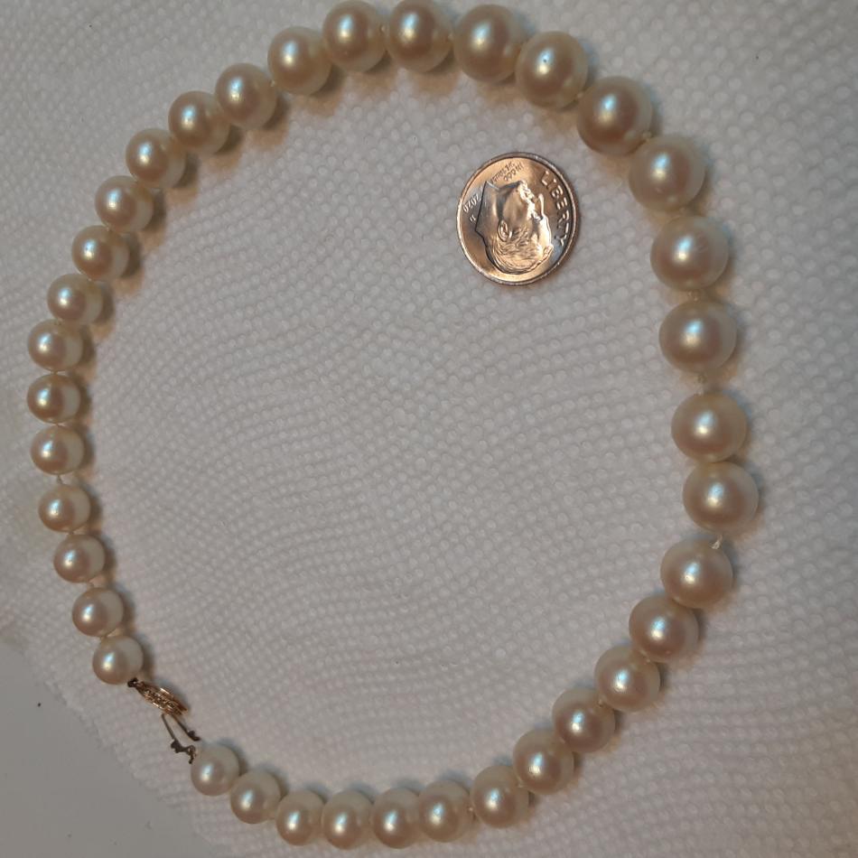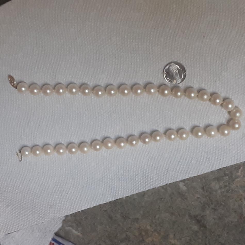Picked this up at small town 2nd hand store a week ago, clasp says 14KG, I've gently cleaned them, they were very grubby, and yellowed, passed the tooth test, heavy and colder than any faux pearls l have, but not sure what kind, or quality. They were hanging up with a big display of vintage jewelry of all sorts, but I'm always straight to the Pearl's, lol! Seems some damage to one by clasp, and possibly some glue residue on several others as well. Will try to upload photos now, tia for any information!