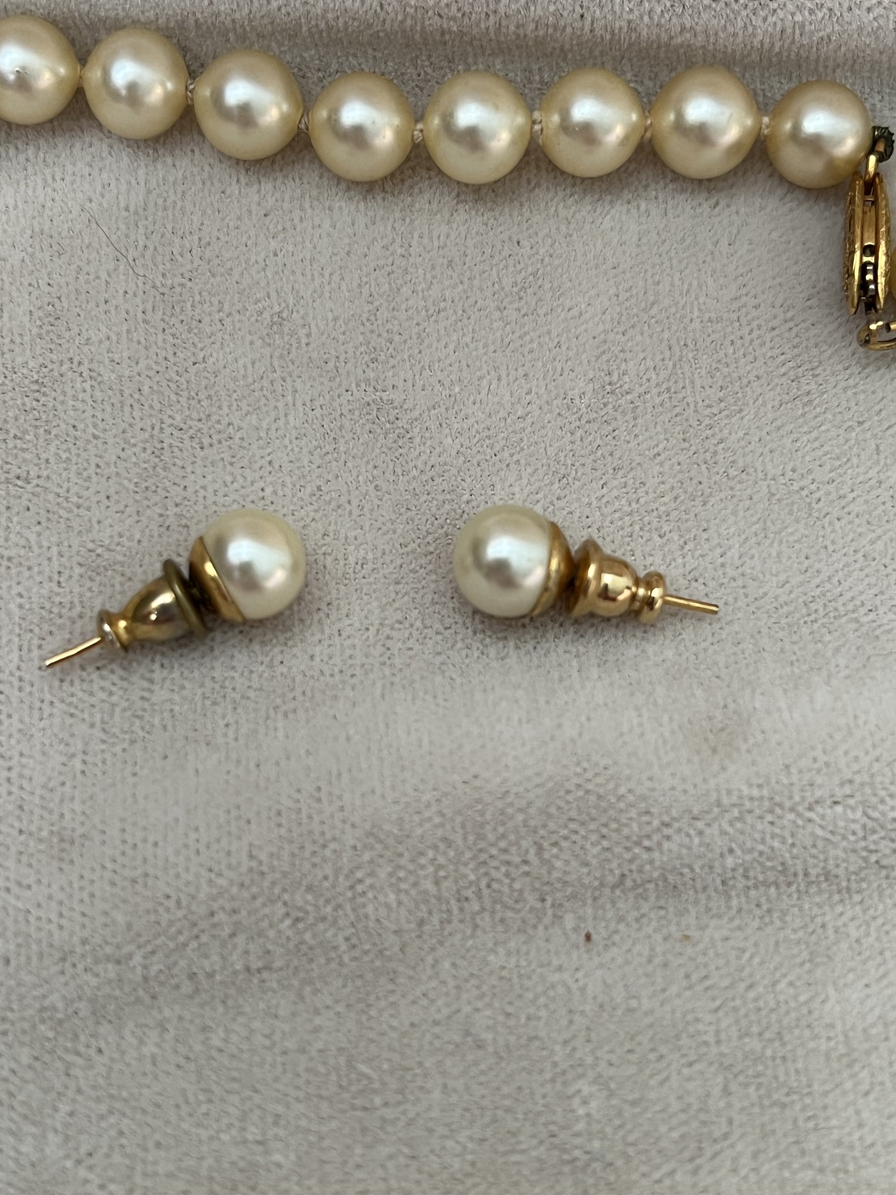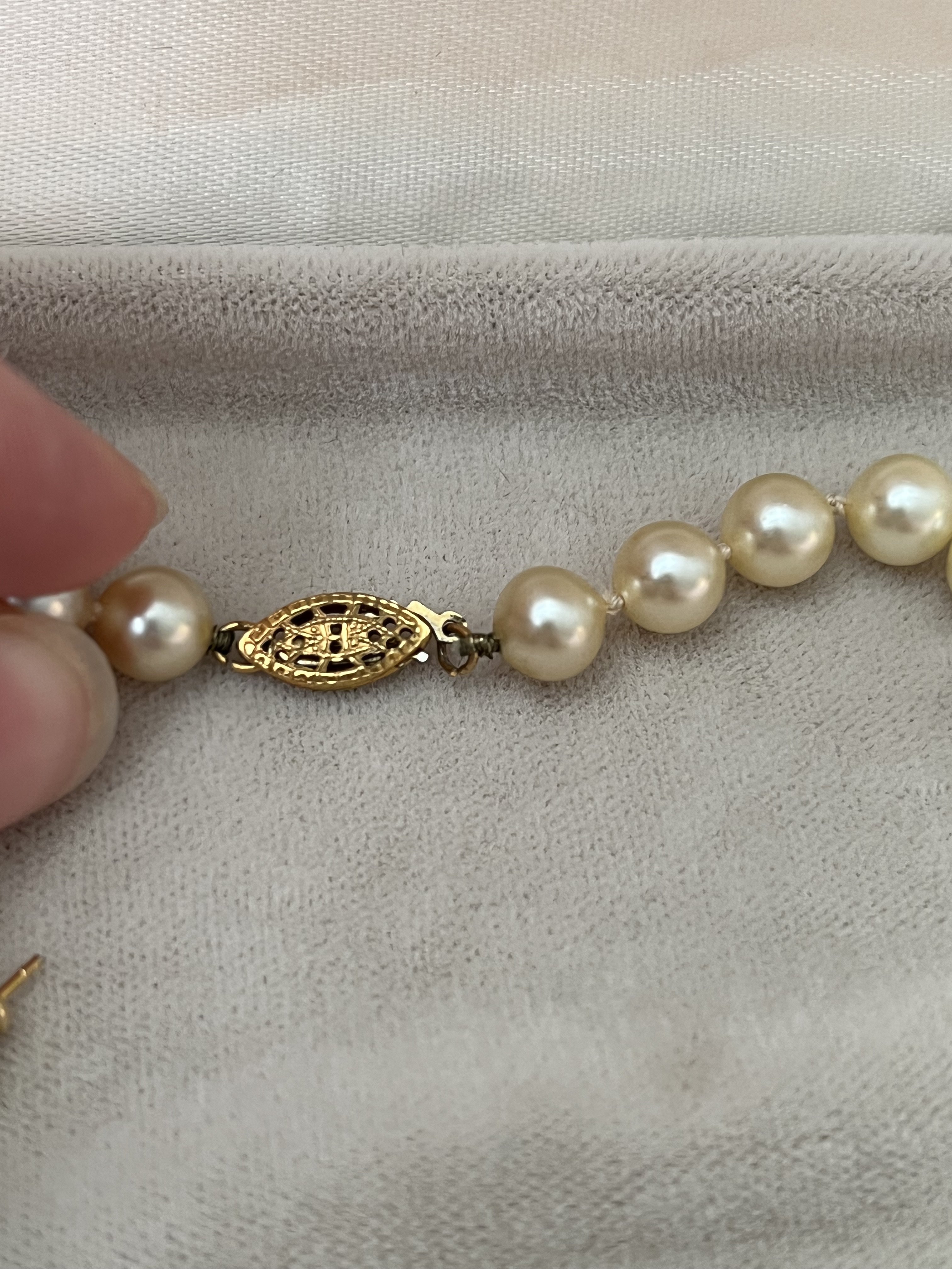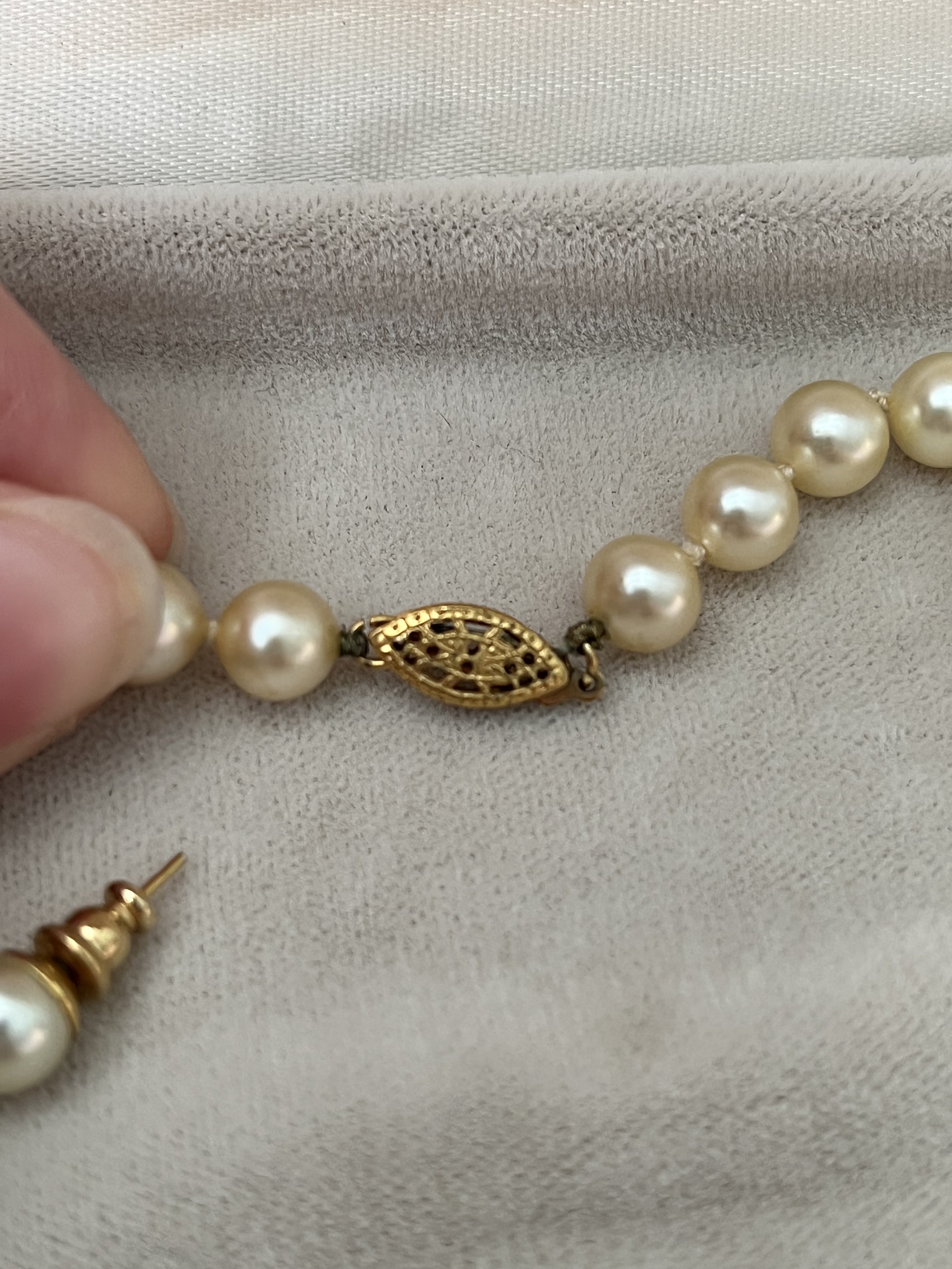 The necklace appears to be to be a very pretty strand of akoya pearls, well matched and lustrous. It's hard to say from the photos if the earrings are also akoya as many ladies by imitation pearl earrings, but if there is a metal mark indicating they are karat gold then they are likely akoyas also.