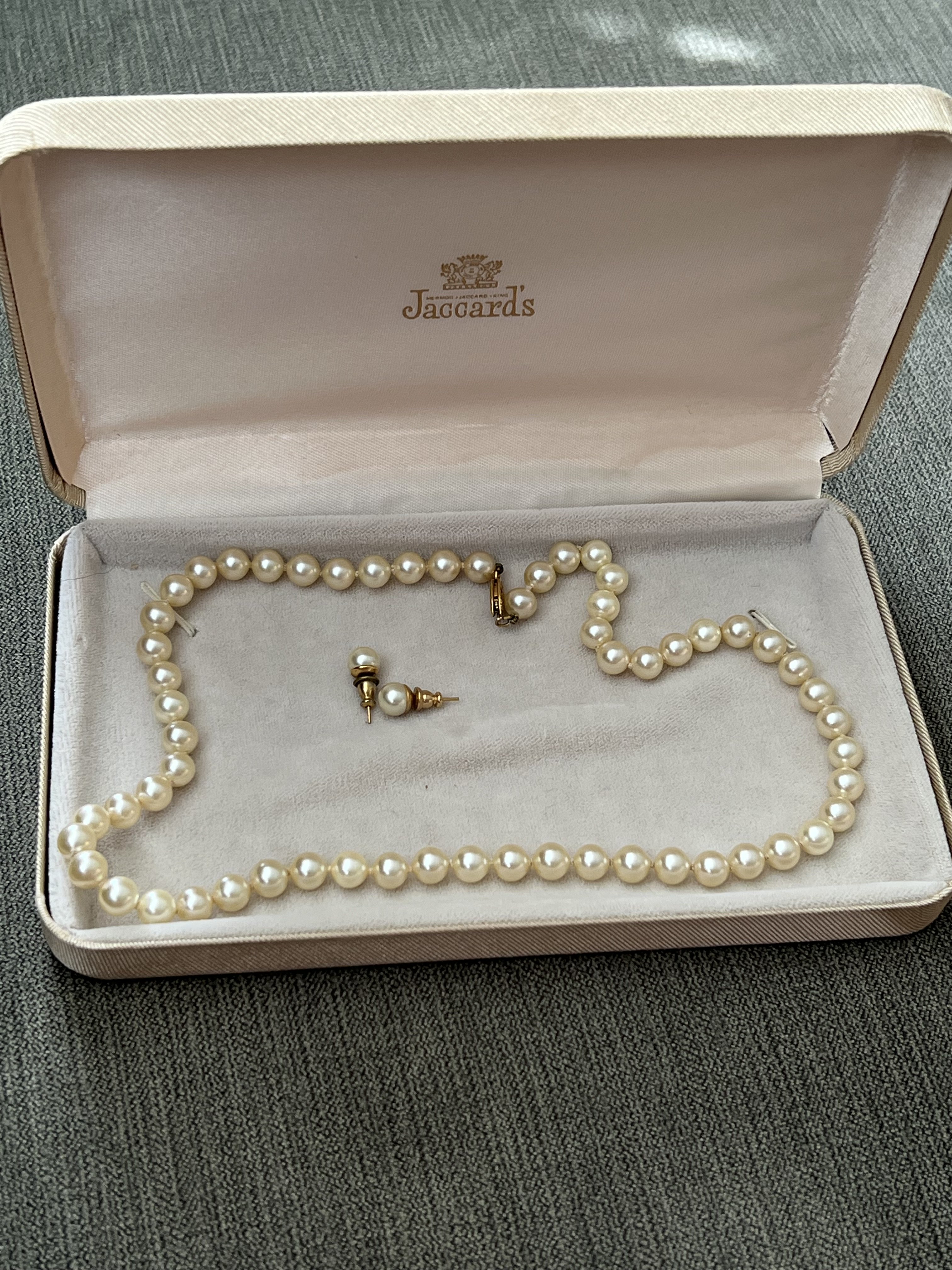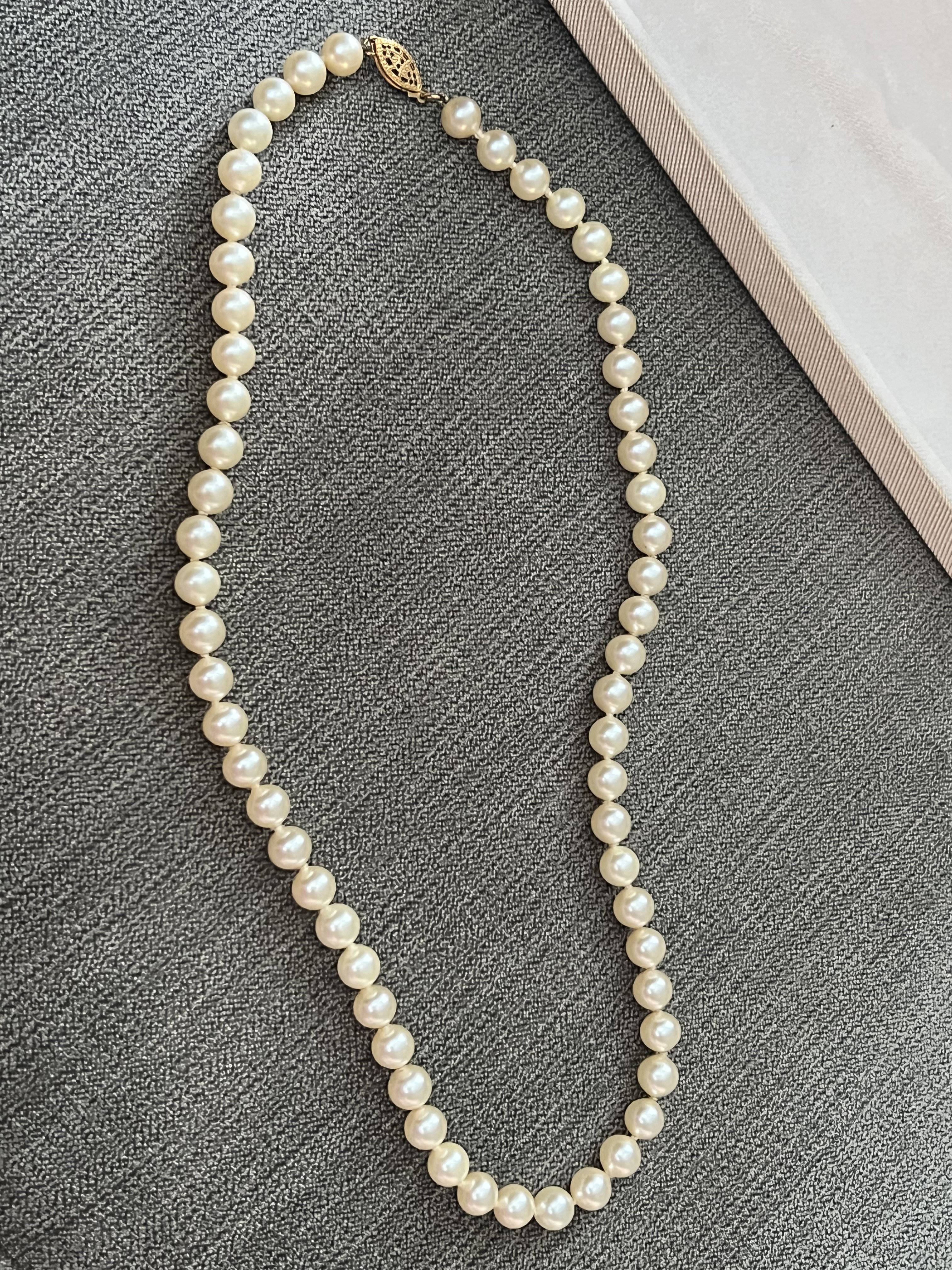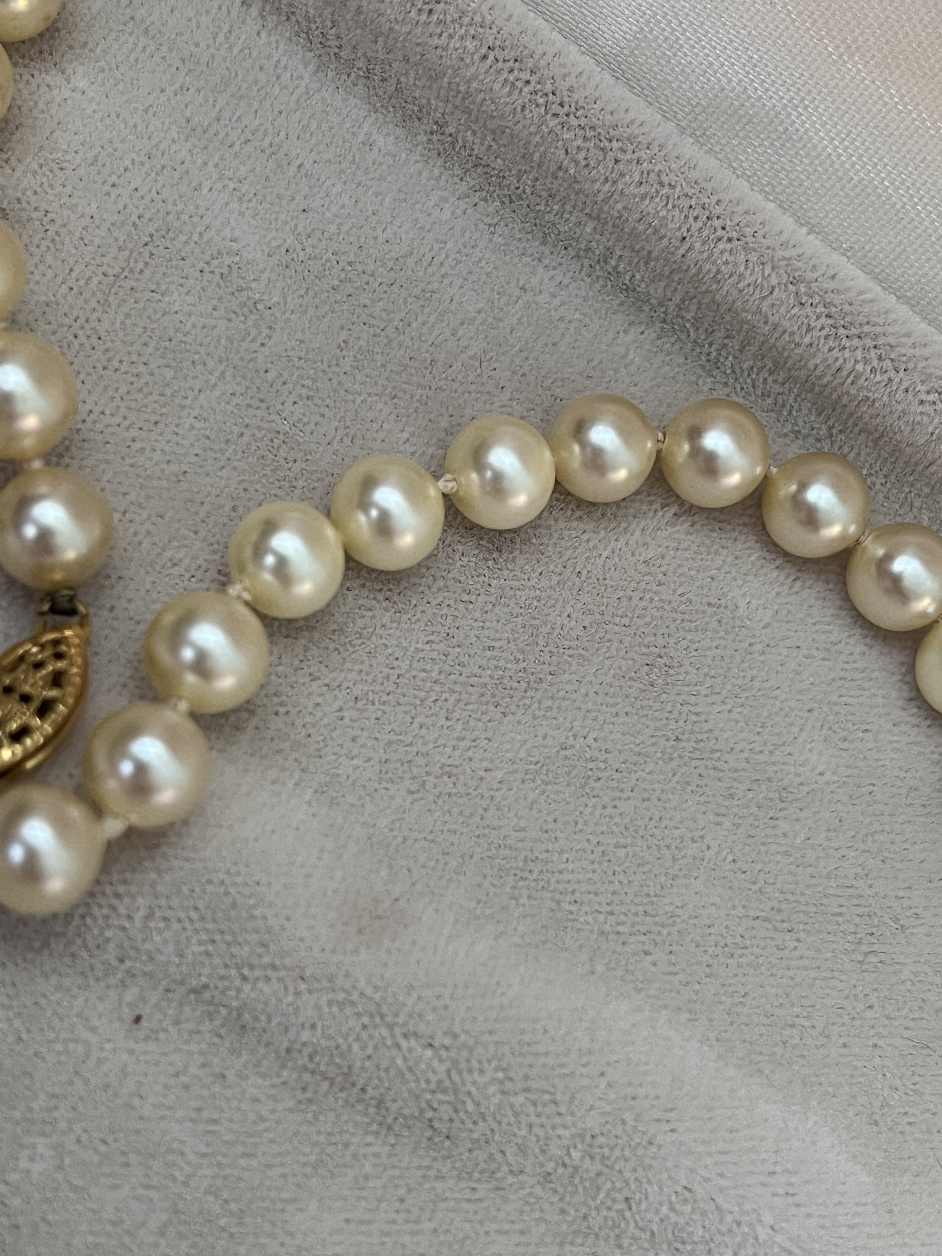 The necklace appears to be to be a very pretty strand of akoya pearls, well matched and lustrous. It's hard to say from the photos if the earrings are also akoya as many ladies by imitation pearl earrings, but if there is a metal mark indicating they are karat gold then they are likely akoyas also.