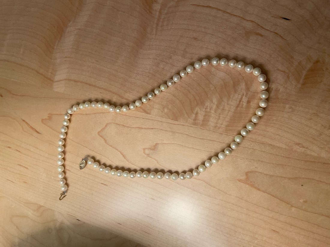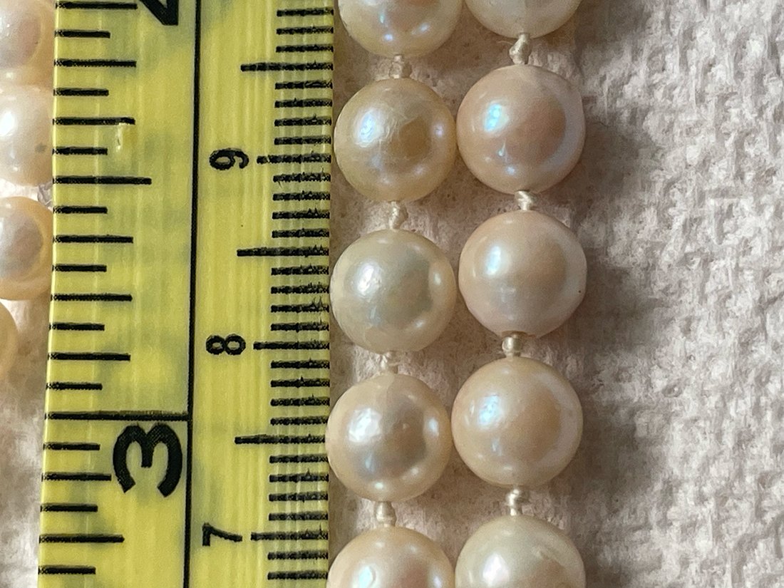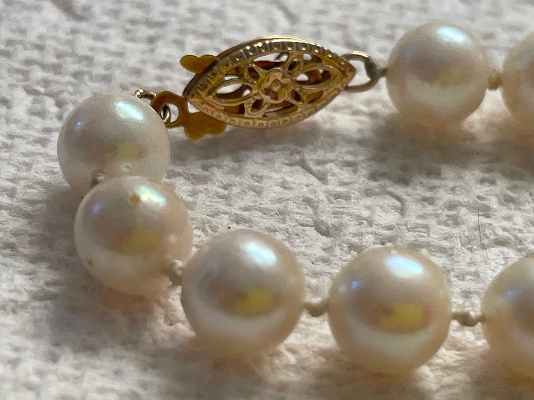 I have two strands of pearls that originally belonged to my grandmother. Her jewelry box was full of lovely real items as well as costume pieces, usually side by side. She had some very nice pearls, most of which went to another relative but I have a pair of small Mikimoto studs that were hers, too. I don't think these strands are anywhere near as nice as the studs (the quality is obvious even to my untrained eye) but I'm curious to at least identify the type of pearl.