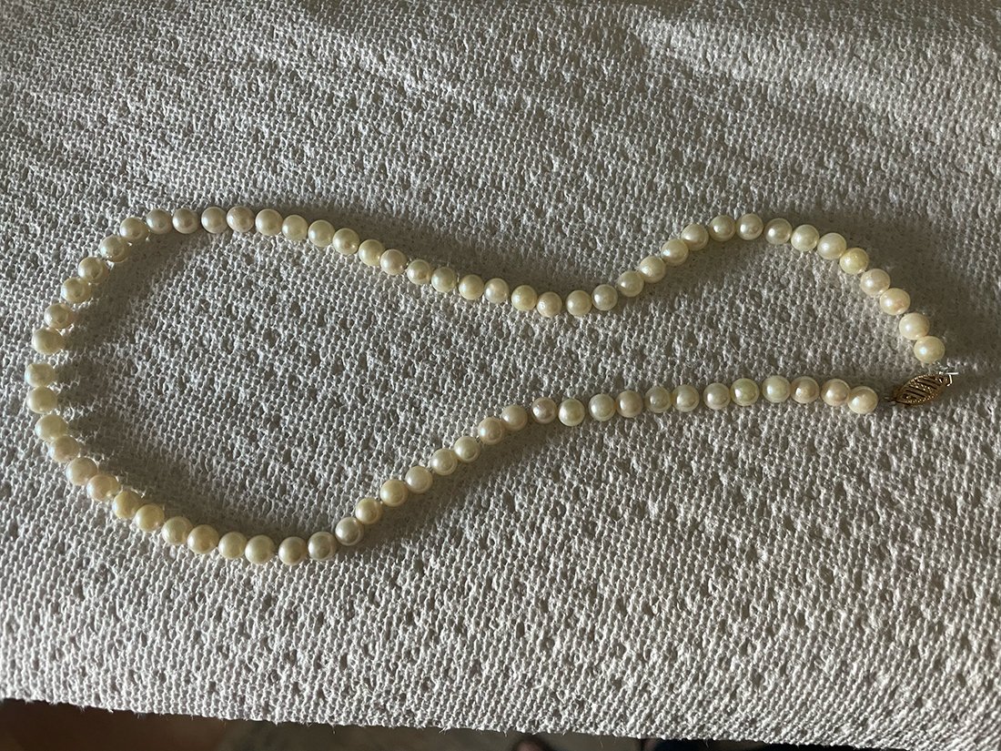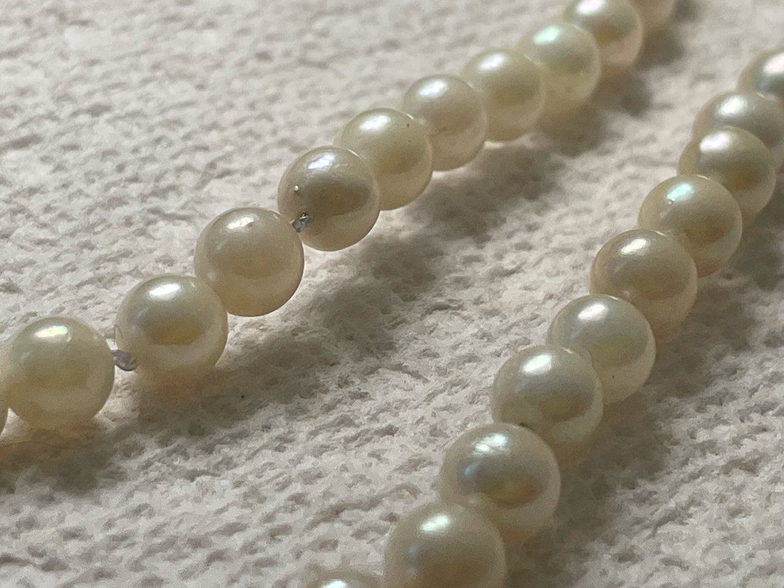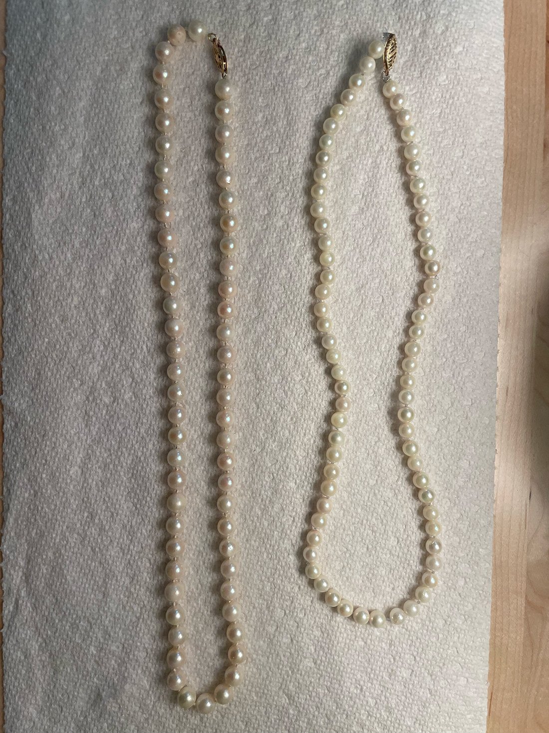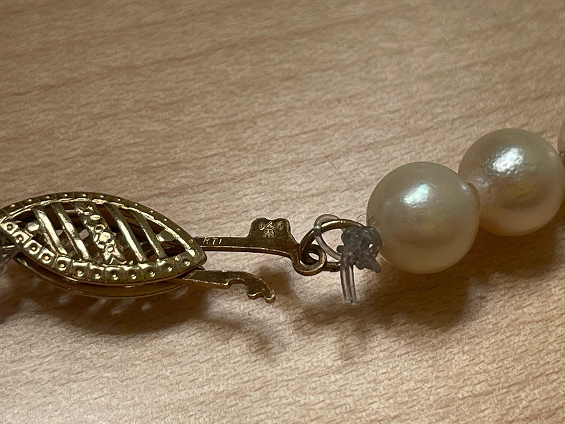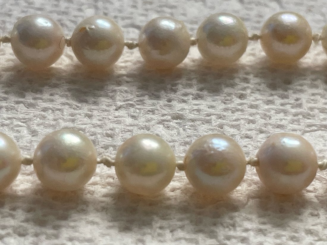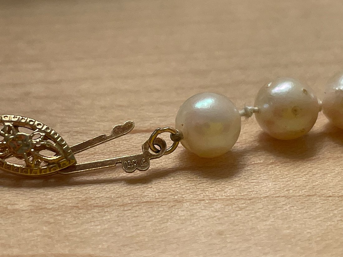 Both have 14K markings on the clasp. Both are cold to the touch and warm up after a few minutes. The smaller of the two was re-knotted very poorly in fishing wire (my grandfather's handiwork, I'm guessing). The larger, non-fishing wire strand seem to have more damage or imperfections.