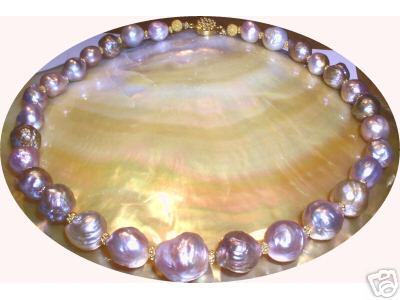 a really fascinating thing about these pearls besides their huge size and beauty is that they are nucleated with thinly nacred akoya pearls! That is, clam shell beads were put into the akoya as usual, then when they were removed they were actually drillled, then rejected for sale I presume, then put into the freshwater mussel!