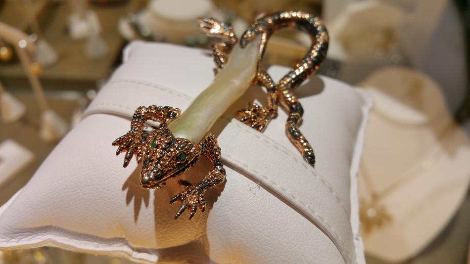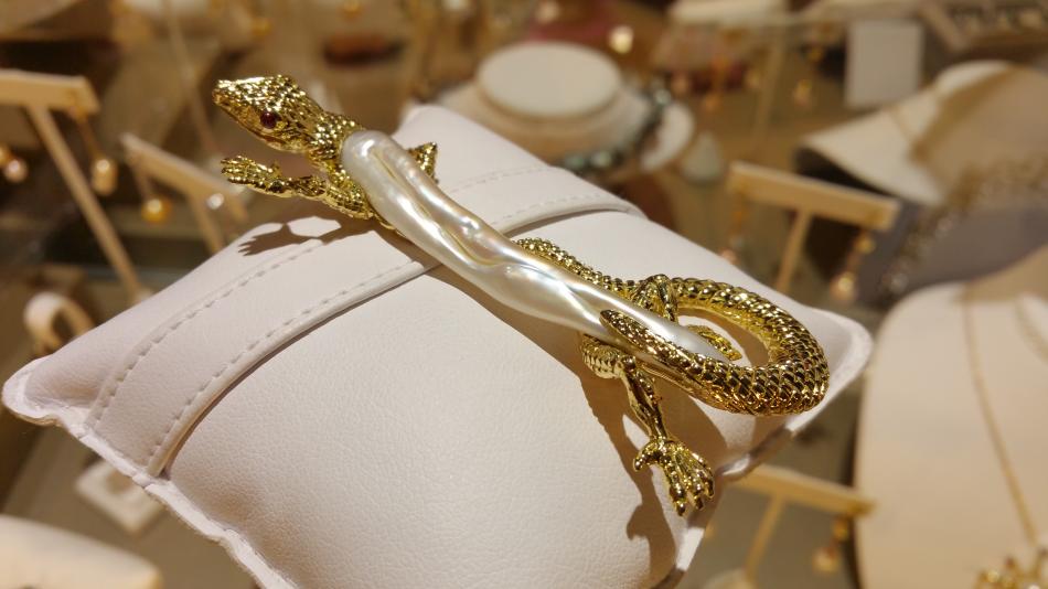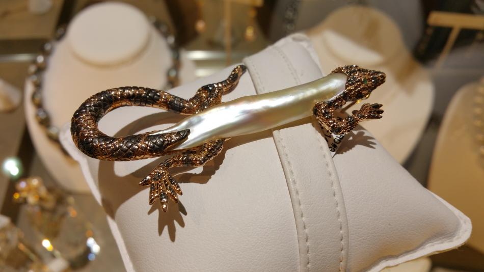Here is a lizard with amazing details - multi-colored gold, gemstone eyes and a lovely pearl body. The lifelike texture of the skin makes you want to run your fingers over its bumps.