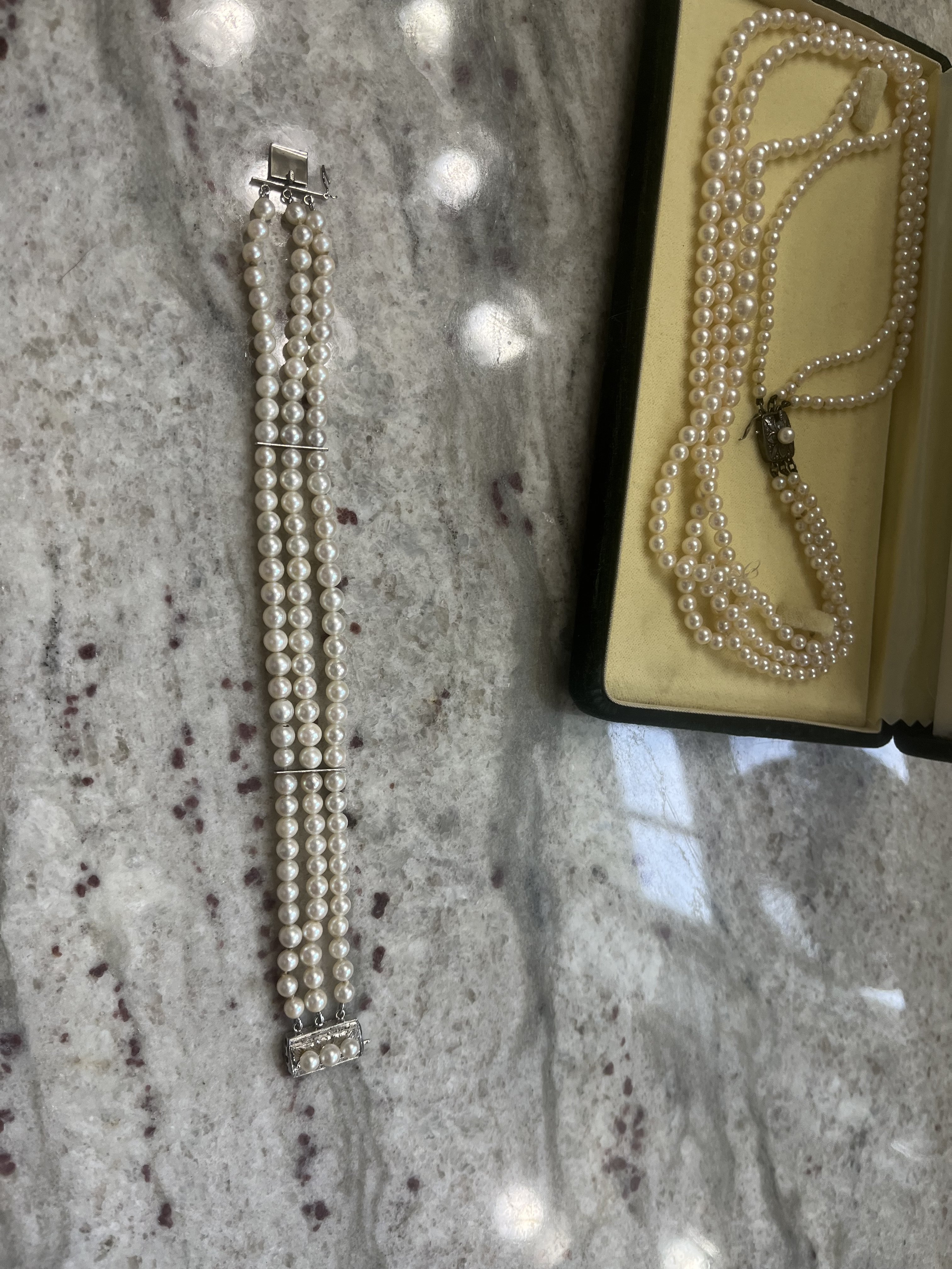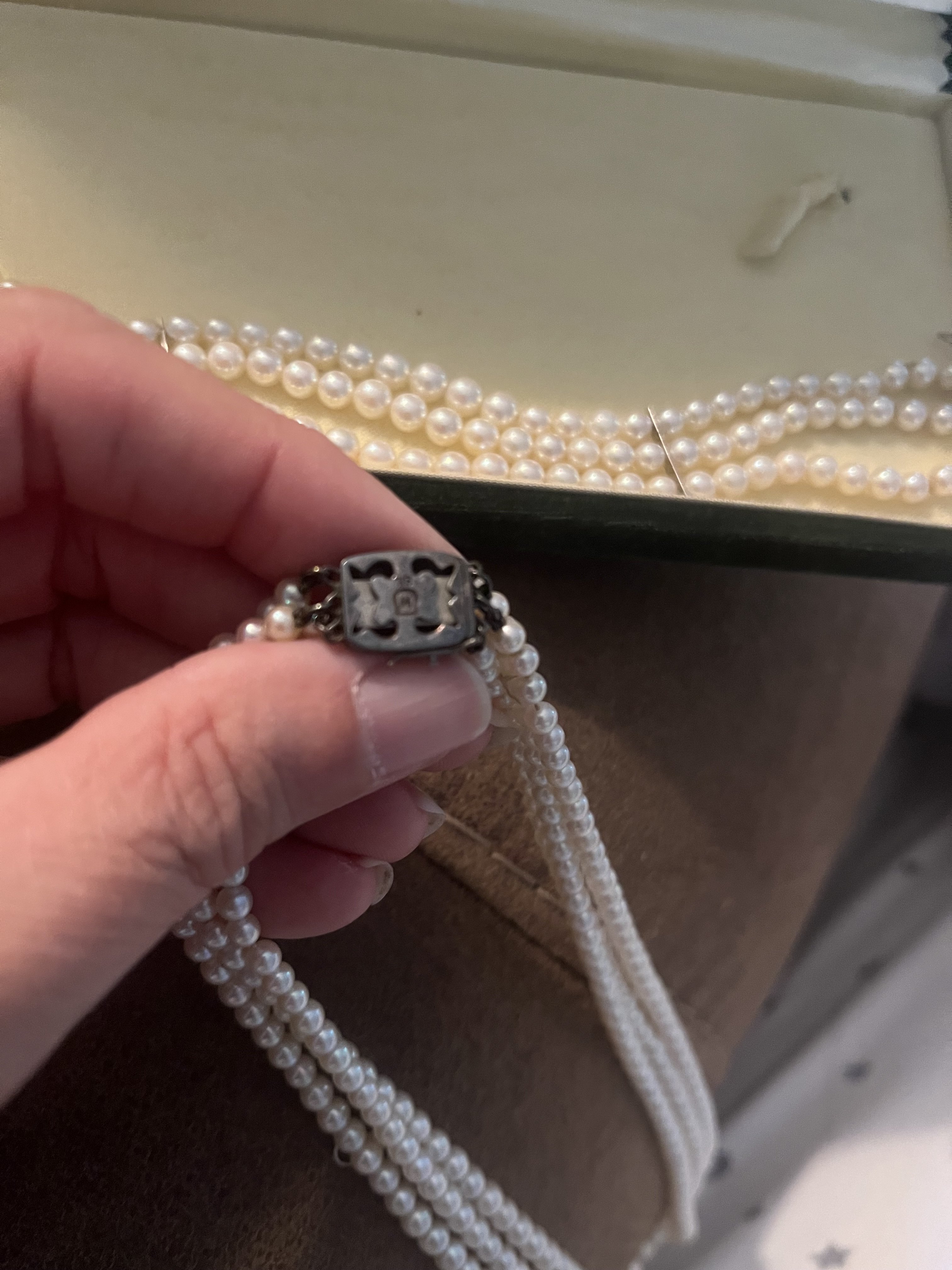 A triple strand bracelet was in the box and indicated with the last two pictures. The clasp is difficult to read and do not a) have the Mikimoto logo stamp and b) the clasp hasn’t aged like the necklace. How can I tell if this is real?