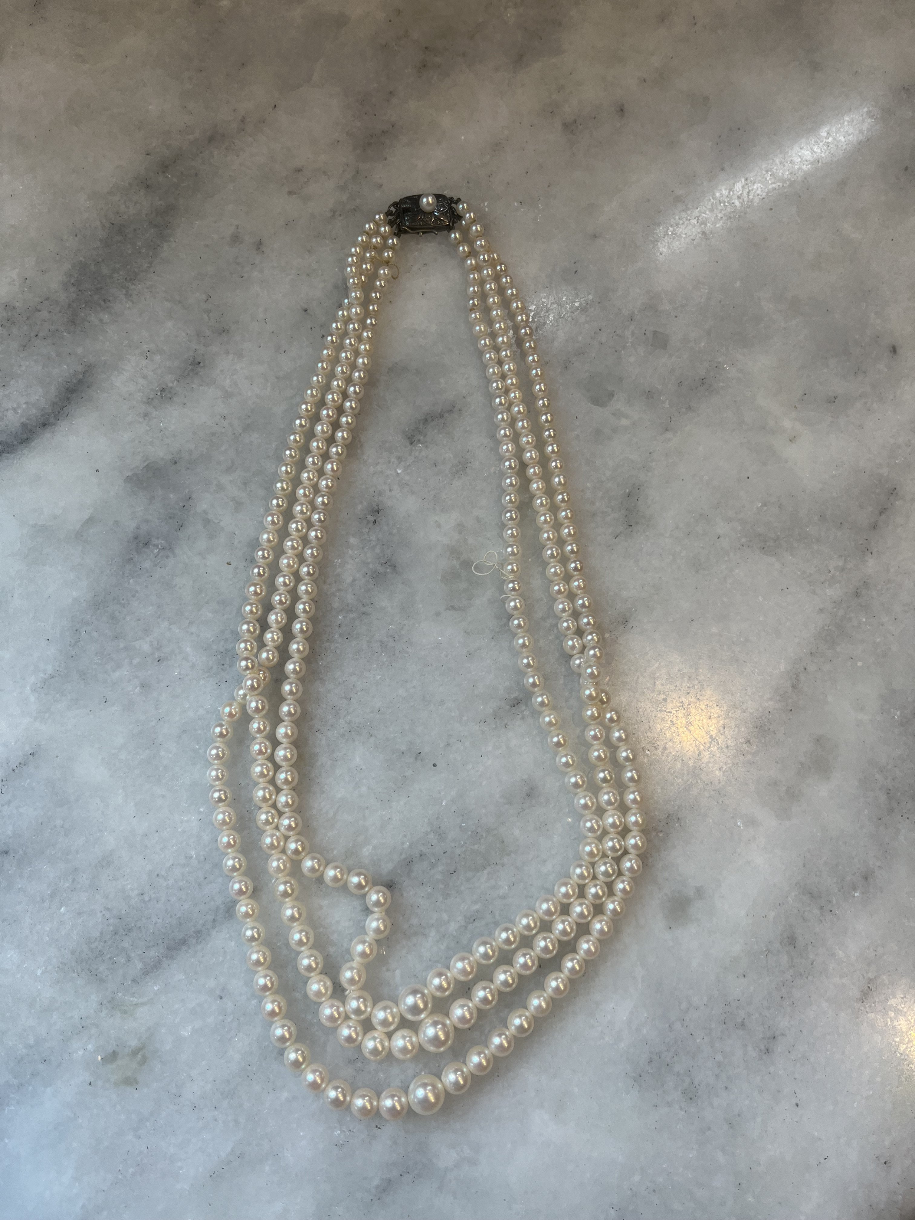 • The fact that the clasp is tarnished and the pearls need restringing will be off-putting to anyone who doesn't want to have to pay to restring them. Restringing can be expensive-- some years ago I was quoted $78 by a local jeweler to restring a single strand 18" necklace; a triple strand could easily run several hundred dollars at a regular jeweler.