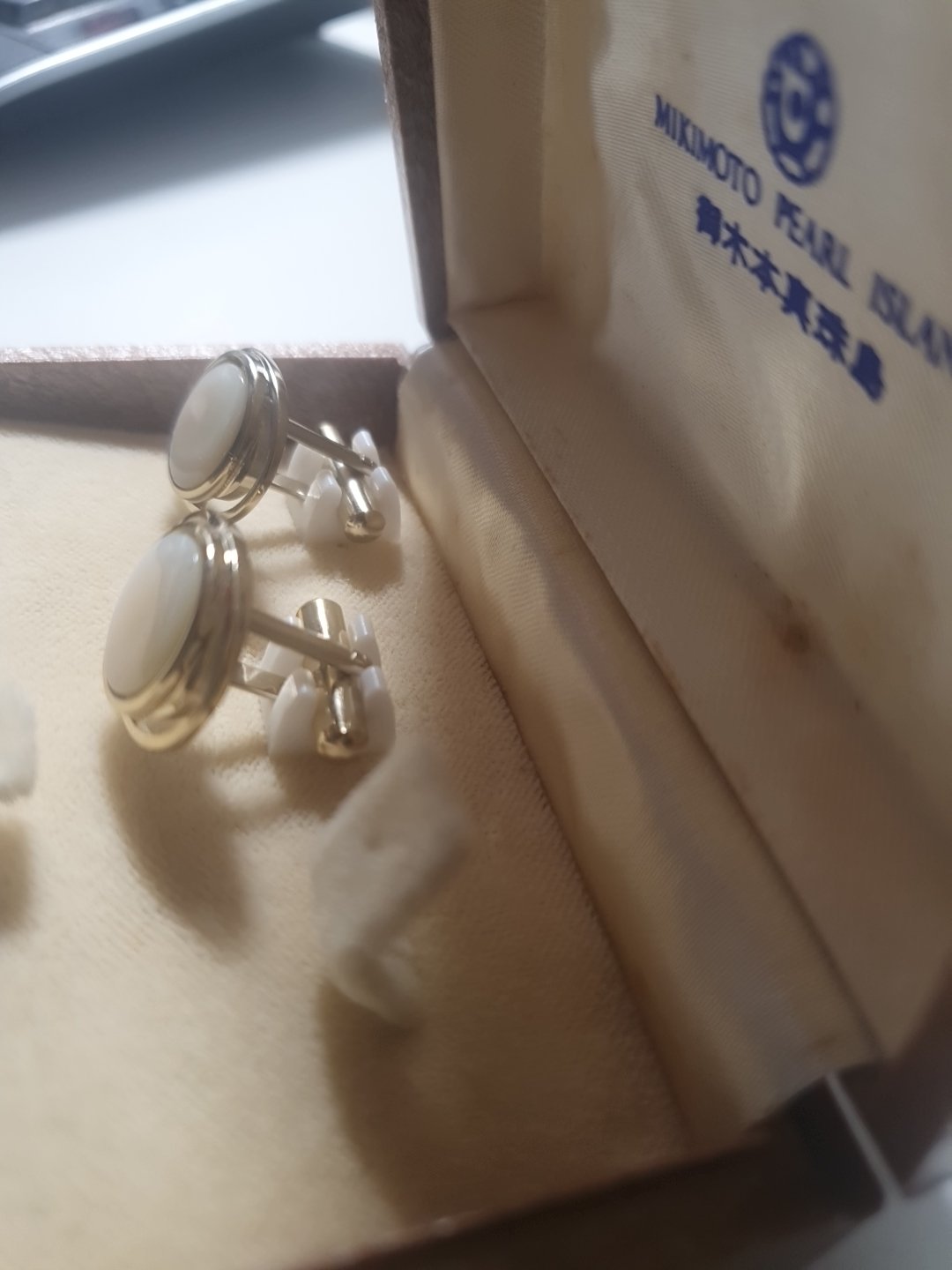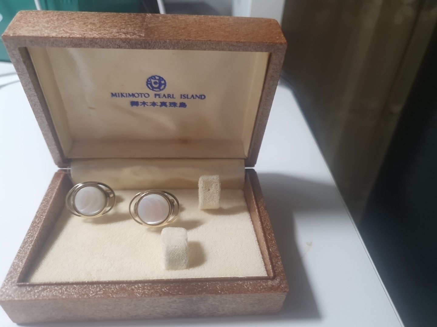 As to the cufflinks, do a search on eBay for similar mother-of-pearl cufflinks. But if they have no markings, they may be base metal.