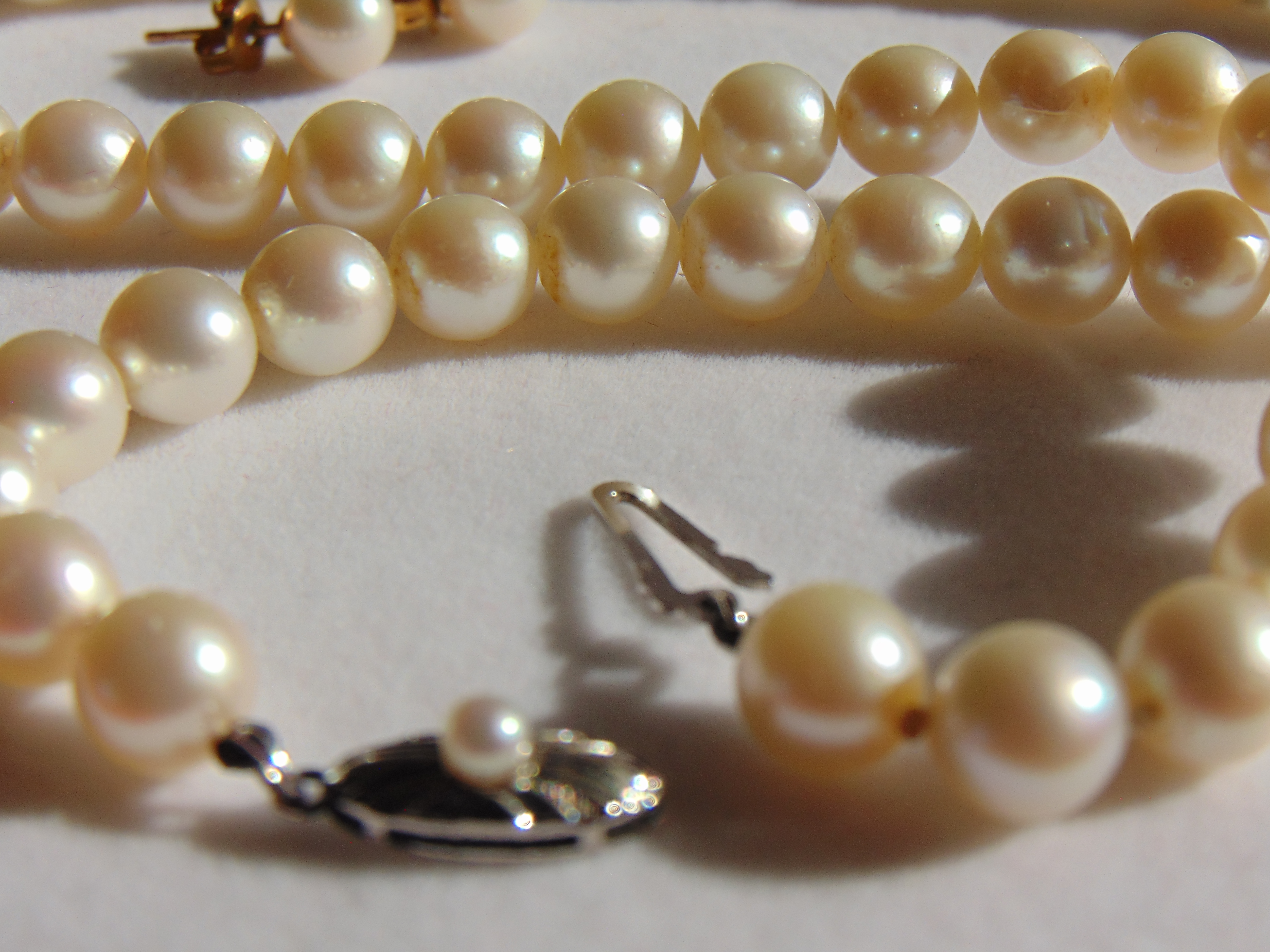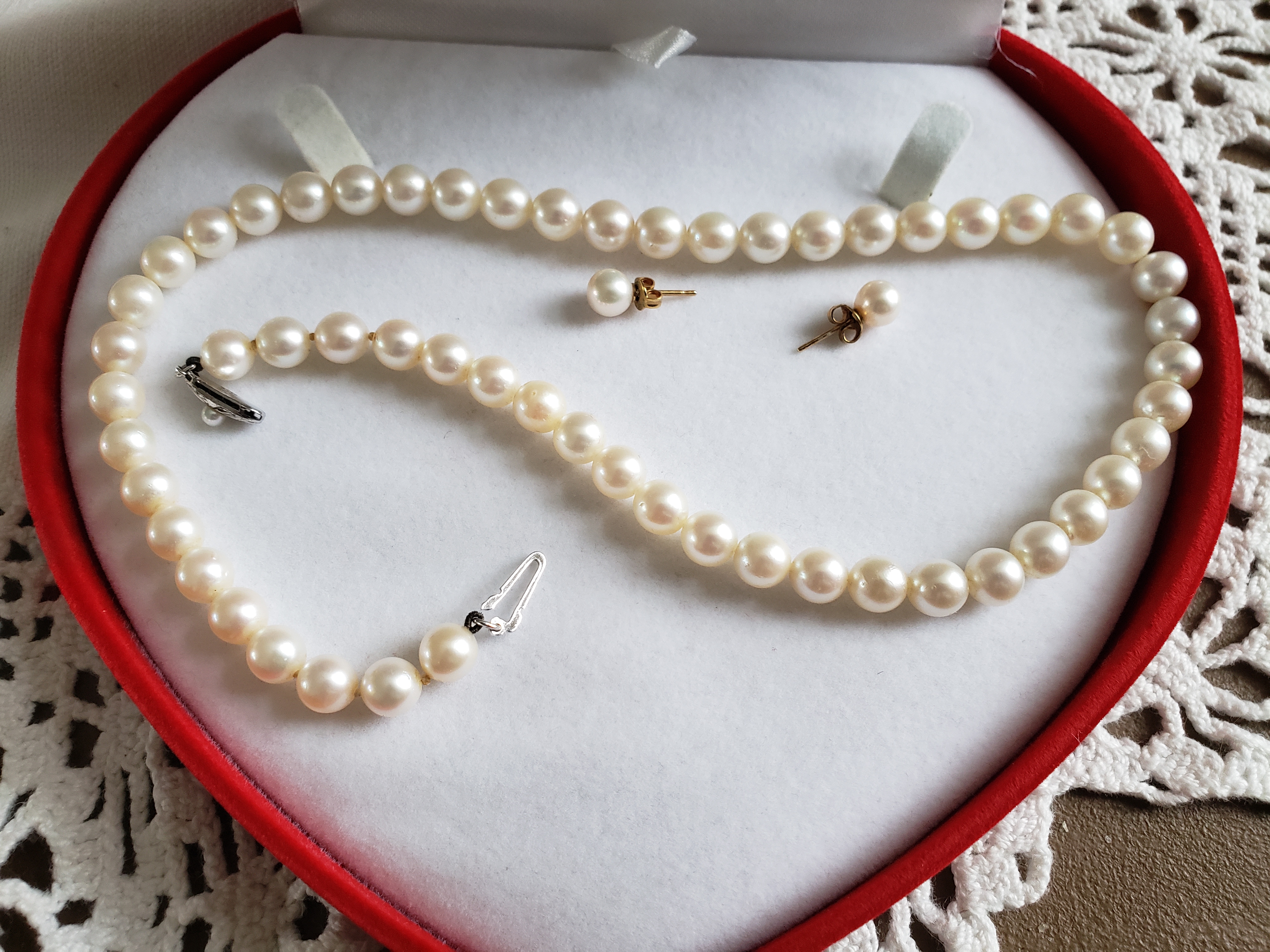 I was nine years old in 1960 when I went with my mother and father to Mikimoto Island in Japan. (My dad was in the Air Force stationed at Tachikawa Air Force Base in Tokyo.) We drove all day to get to the island where we saw women diving for oysters and saw where the pearls are taken from the oysters, and made into jewelry. While we were there my mom bought this necklace. I don't remember what she paid for it, but I do remember it was a big, big deal. About 20 years ago she gave the necklace and earrings to me. Between mom and I both it hasn't been worn for more than a handful of times. I don't remember if the earrings are matched, or if my mom bought them separately, but the color sure is close.