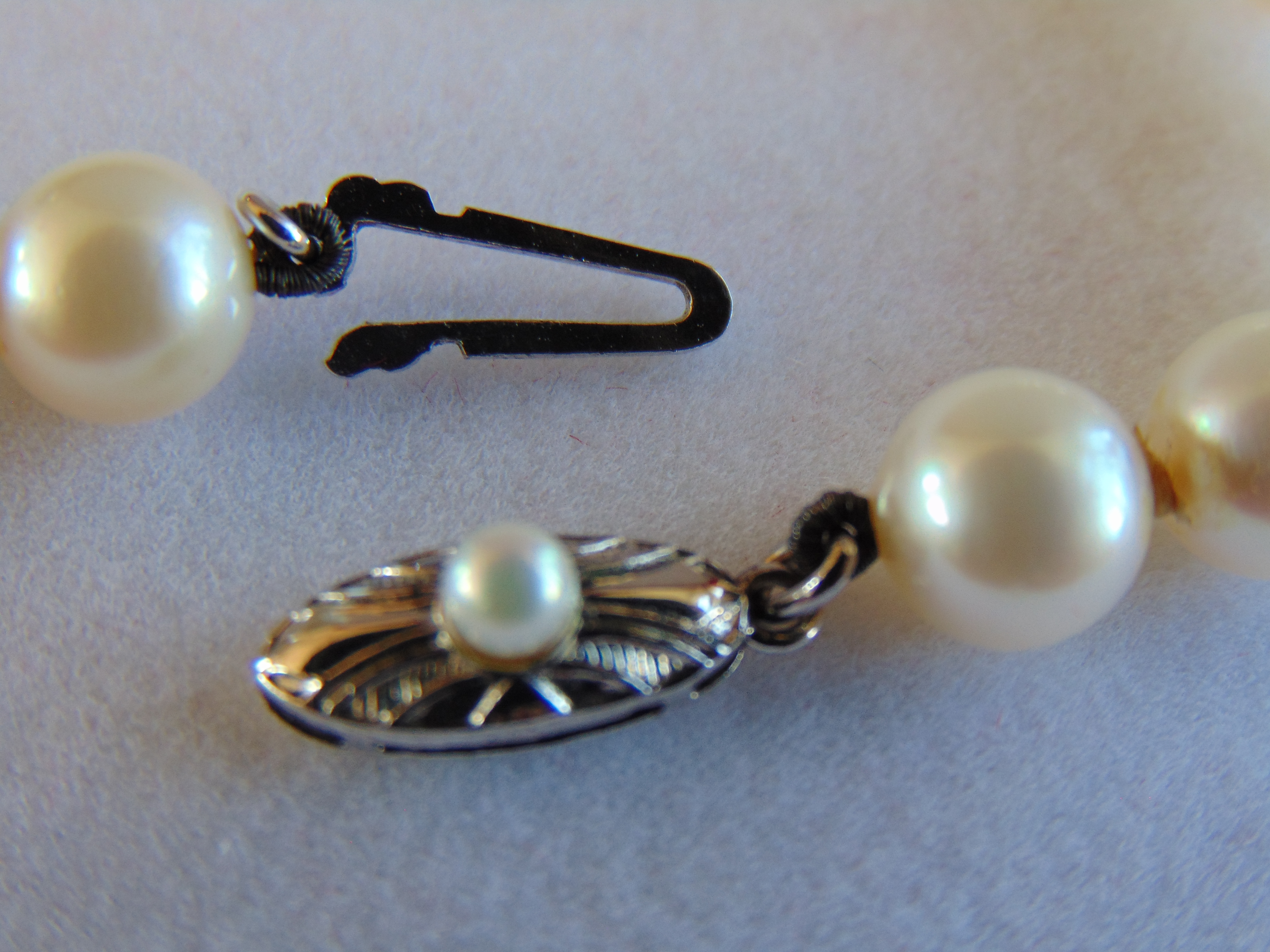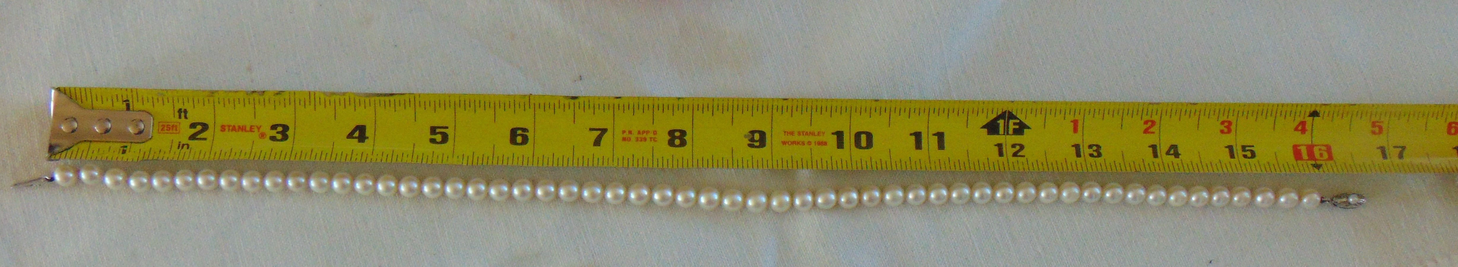 The necklace is 16" long with a stamped clasp. It is strung with the original silk string and there's a knot between the first three pearls (see photos). I used a rudimentary caliper to measure them and every pearl is consistently the same size, about 7 mm.