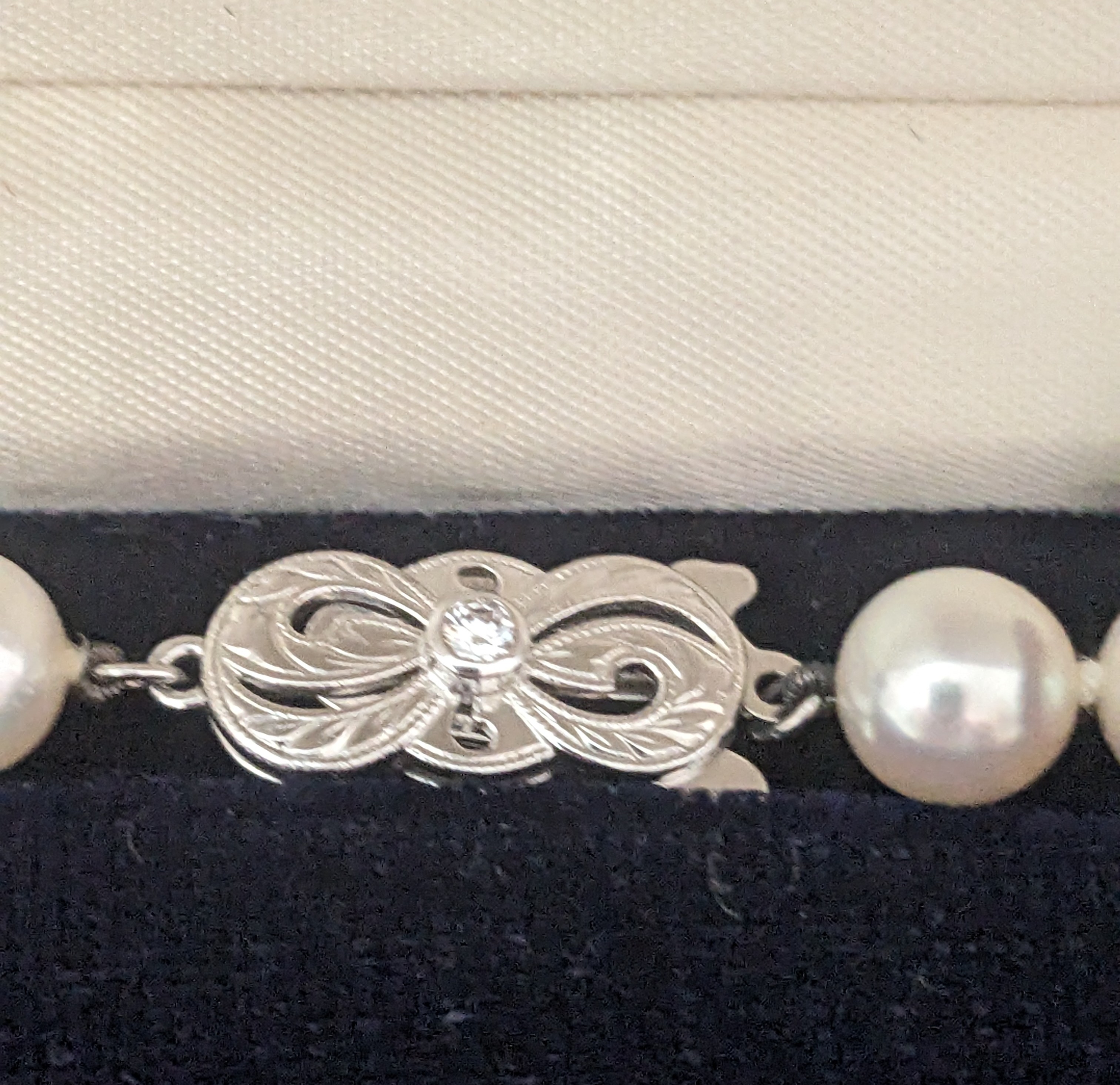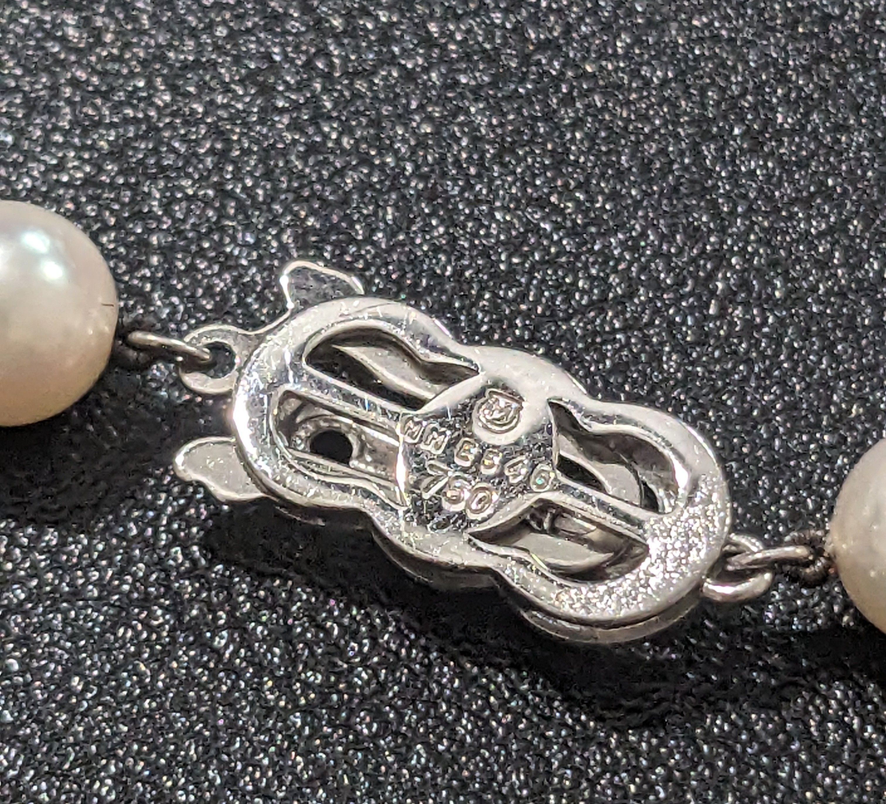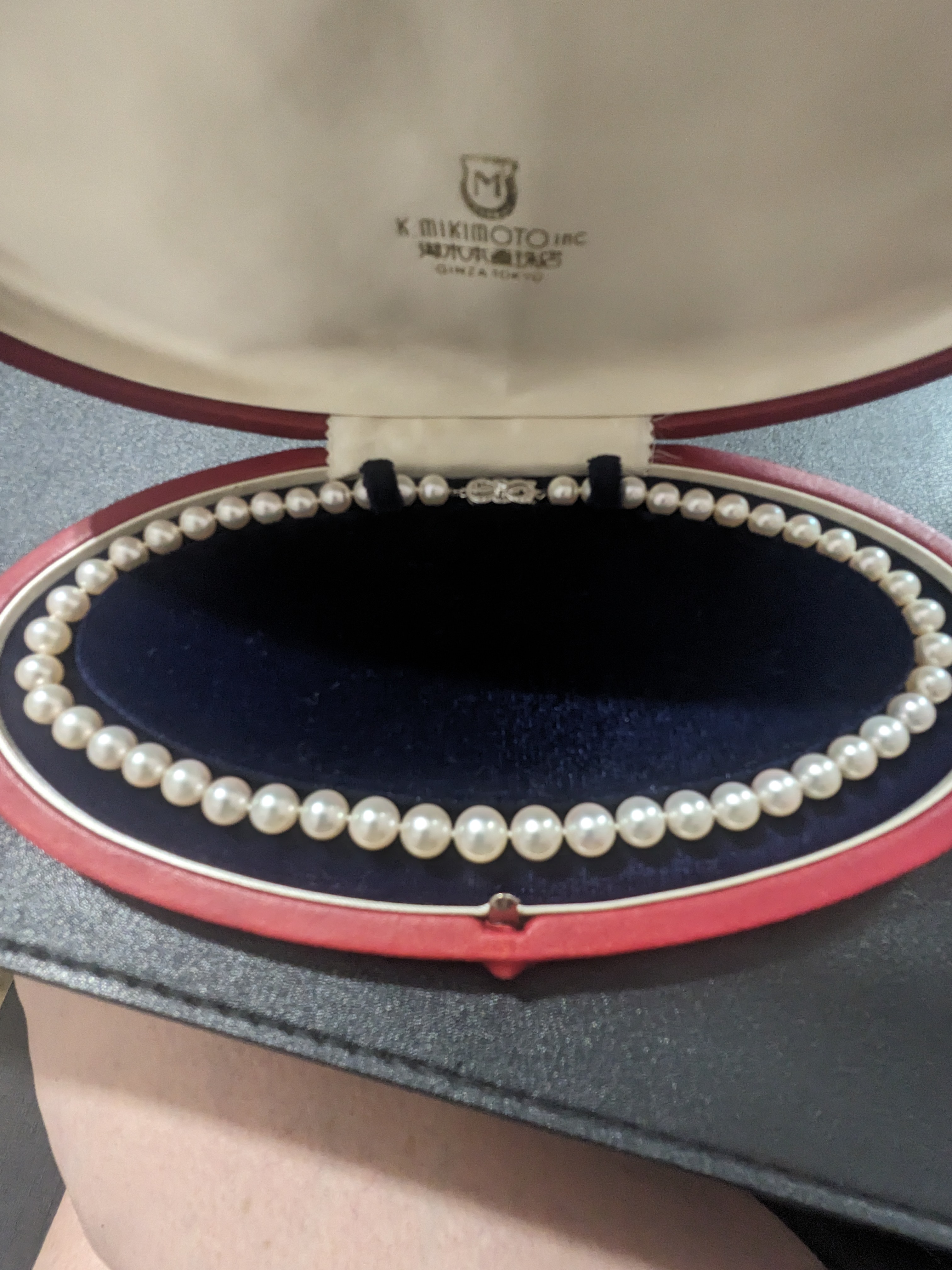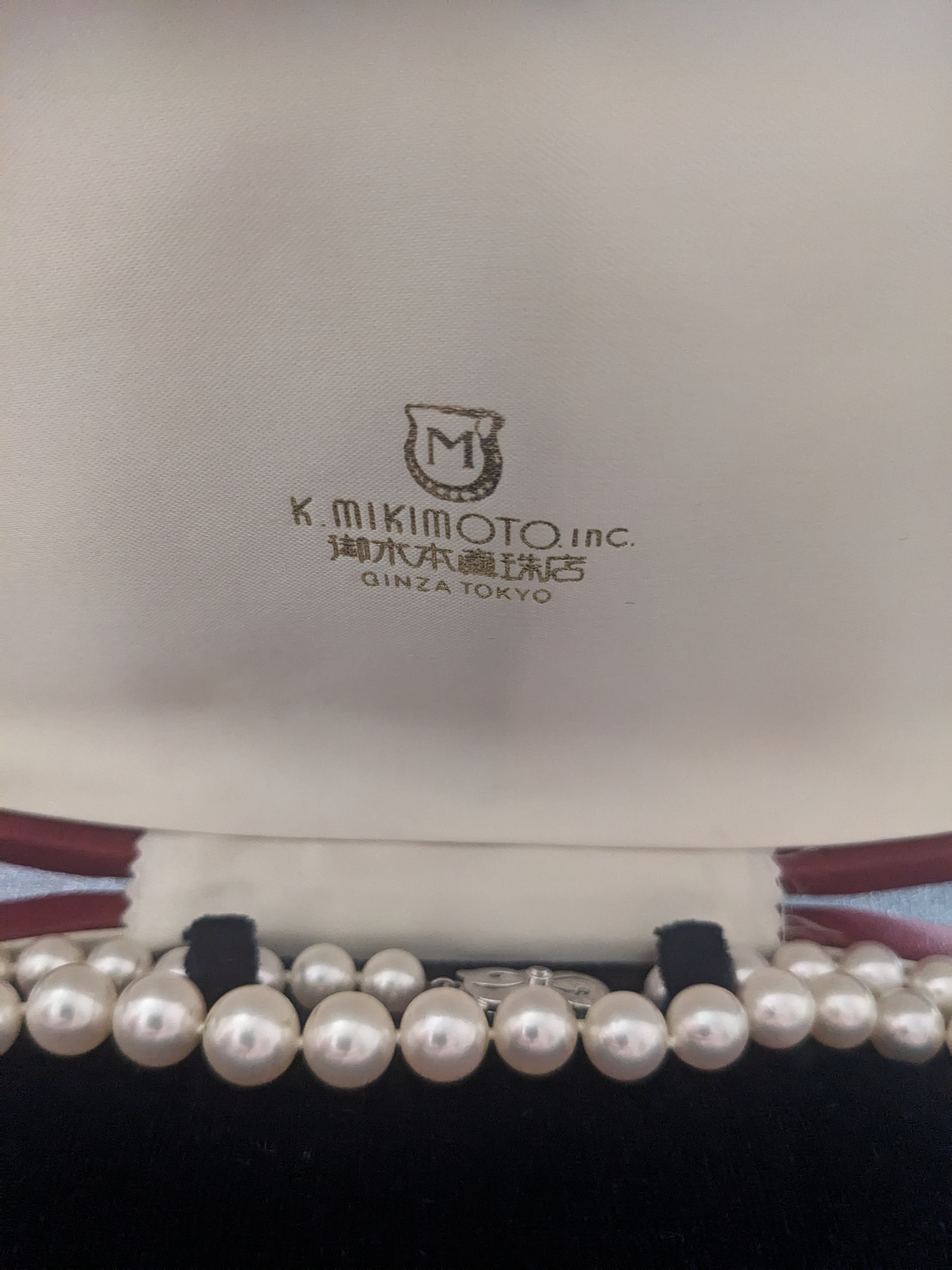 I recently got these pearls at an estate sale - they came in the case which was in the box pictured. I have never seen a Mikimoto necklace with a serial number actually on the clasp (nor am I familiar with a clasp that has a diamond rather than a pearl). The biggest pearl in the center is a 9mm and the smallest is a 7.5mm. Can anyone tell me if these are authentic, or anything about them?
