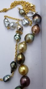 The Fiji keshi pictured earlier in this thread, from back in September, are finally done. Wire wrapped in 18kt yellow gold by Catherine at Stephen Vincent Design. The three pearls above it are also Fiji pearls pictured earlier in this thread. The big golden drop is a South Sea from PP, with the 18kt gold bail also designed by Catherine.