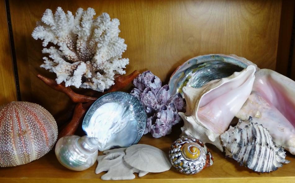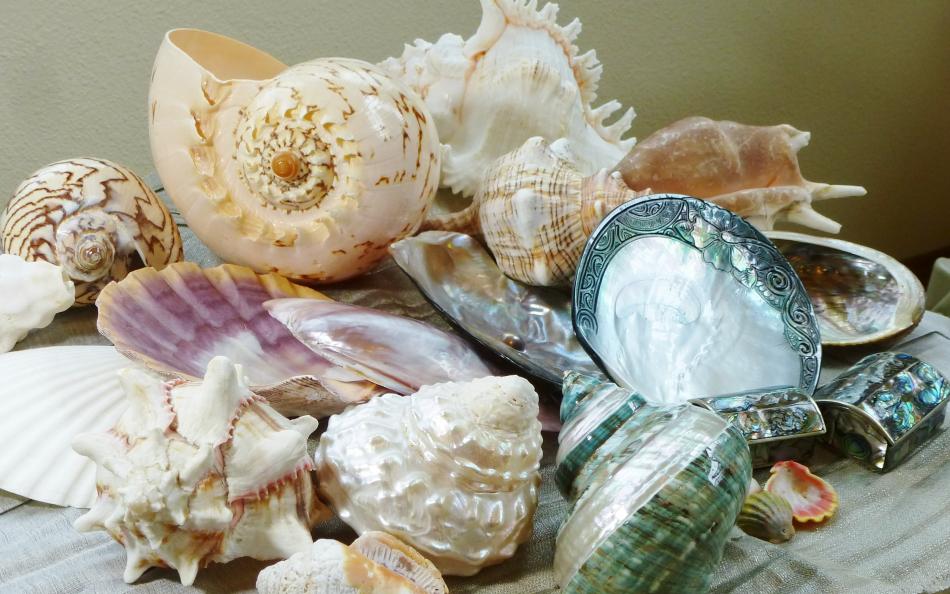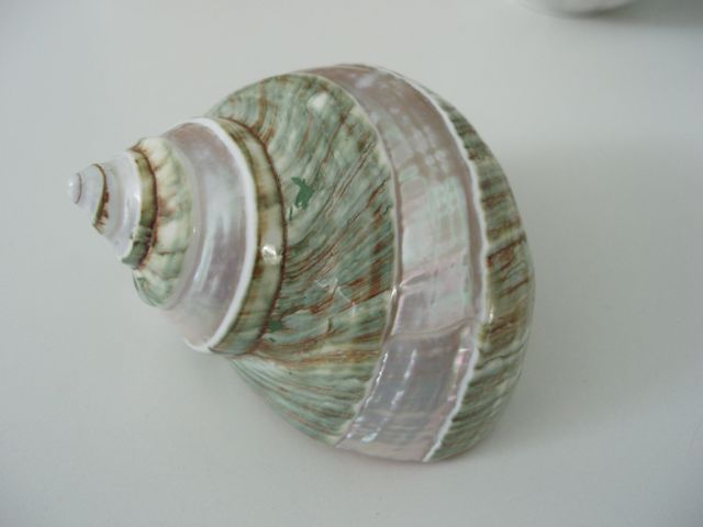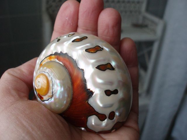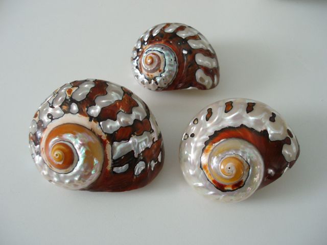 I took a shot of my little family of Turbo sarmaticus shells. The close-up is of the one I got first. I was on holiday in Fish Hoek, South Africa, way back in '88 and came across a little shop with shells. I had never seen these turban shells before and was charmed.