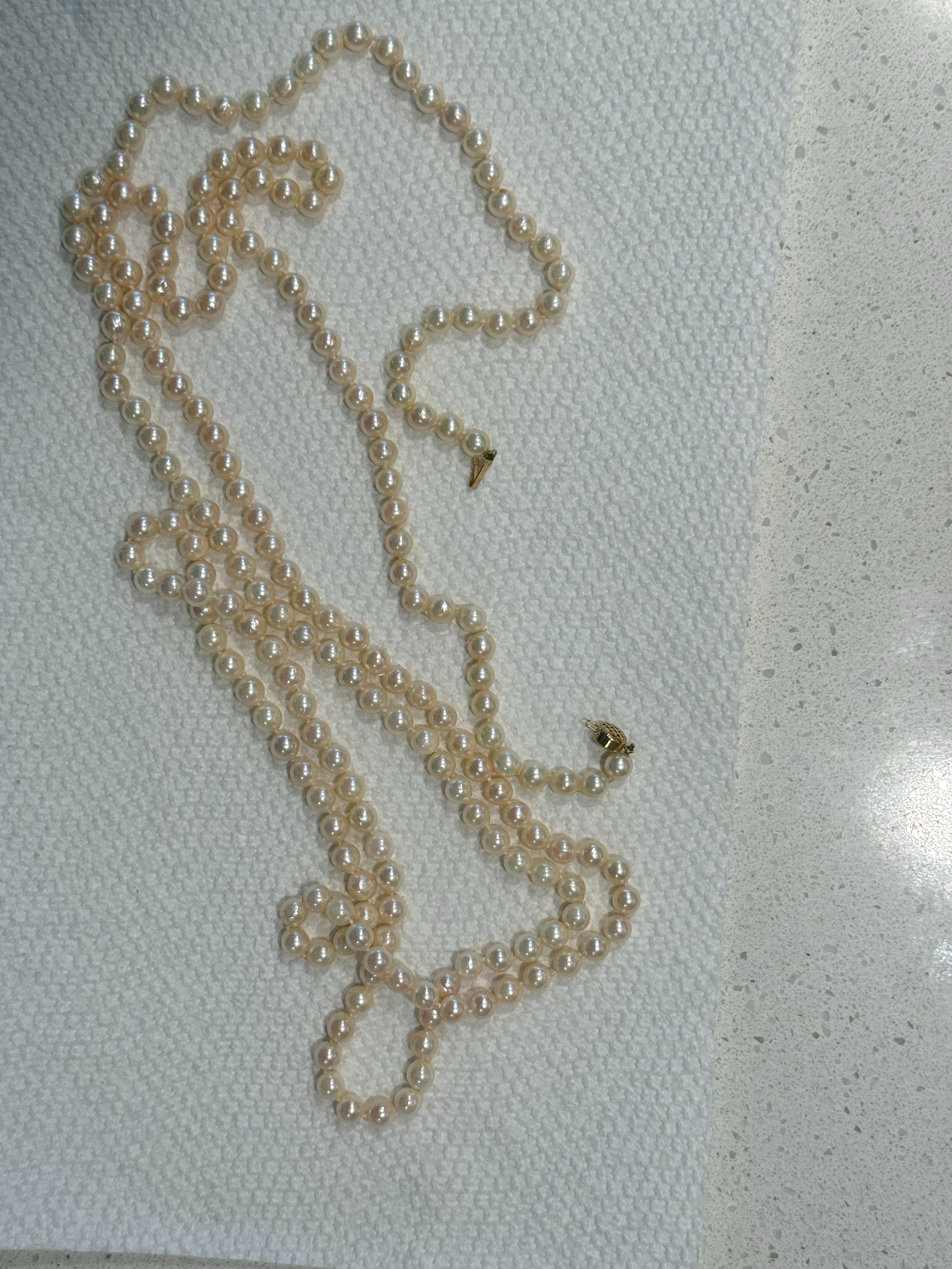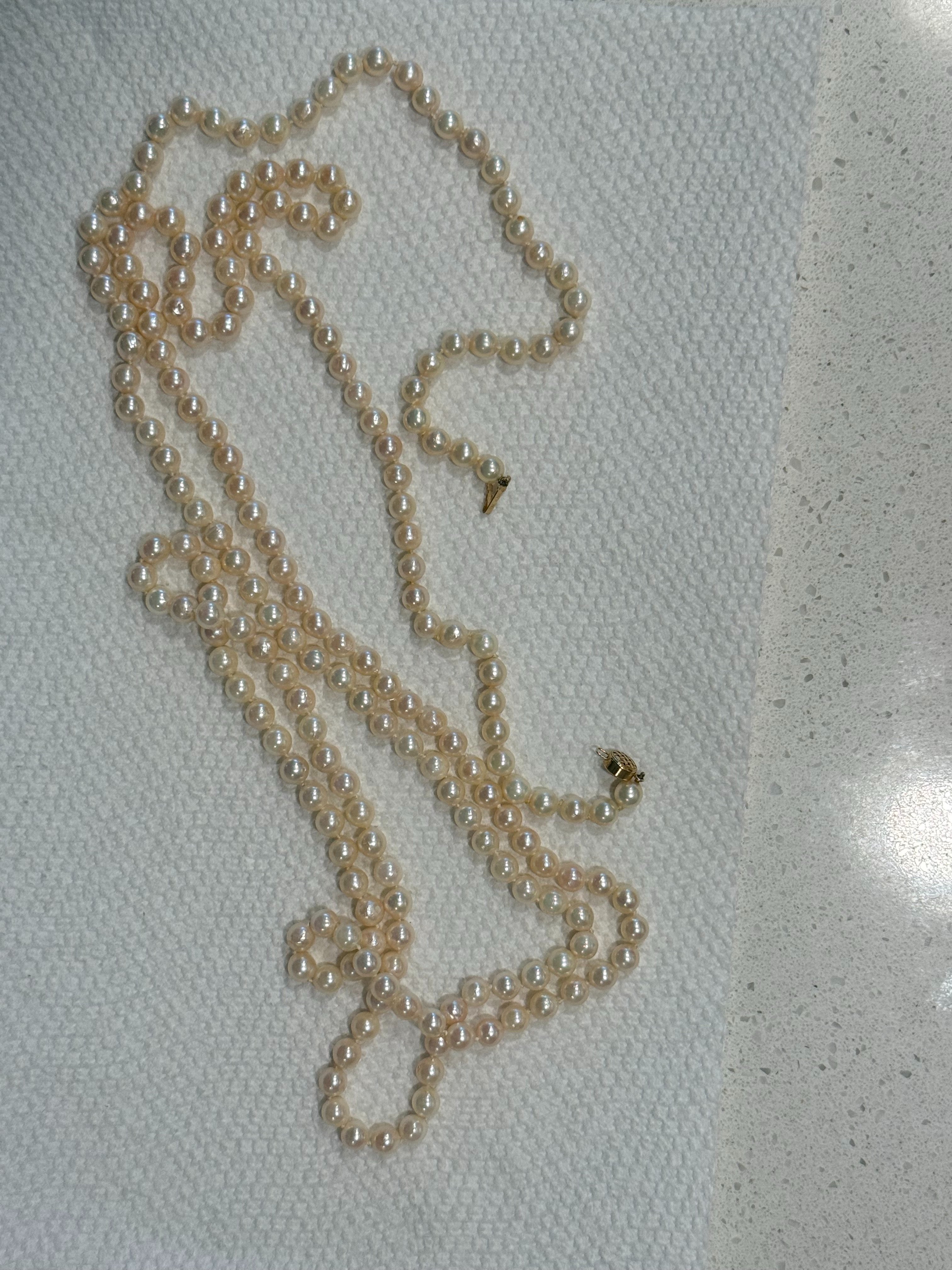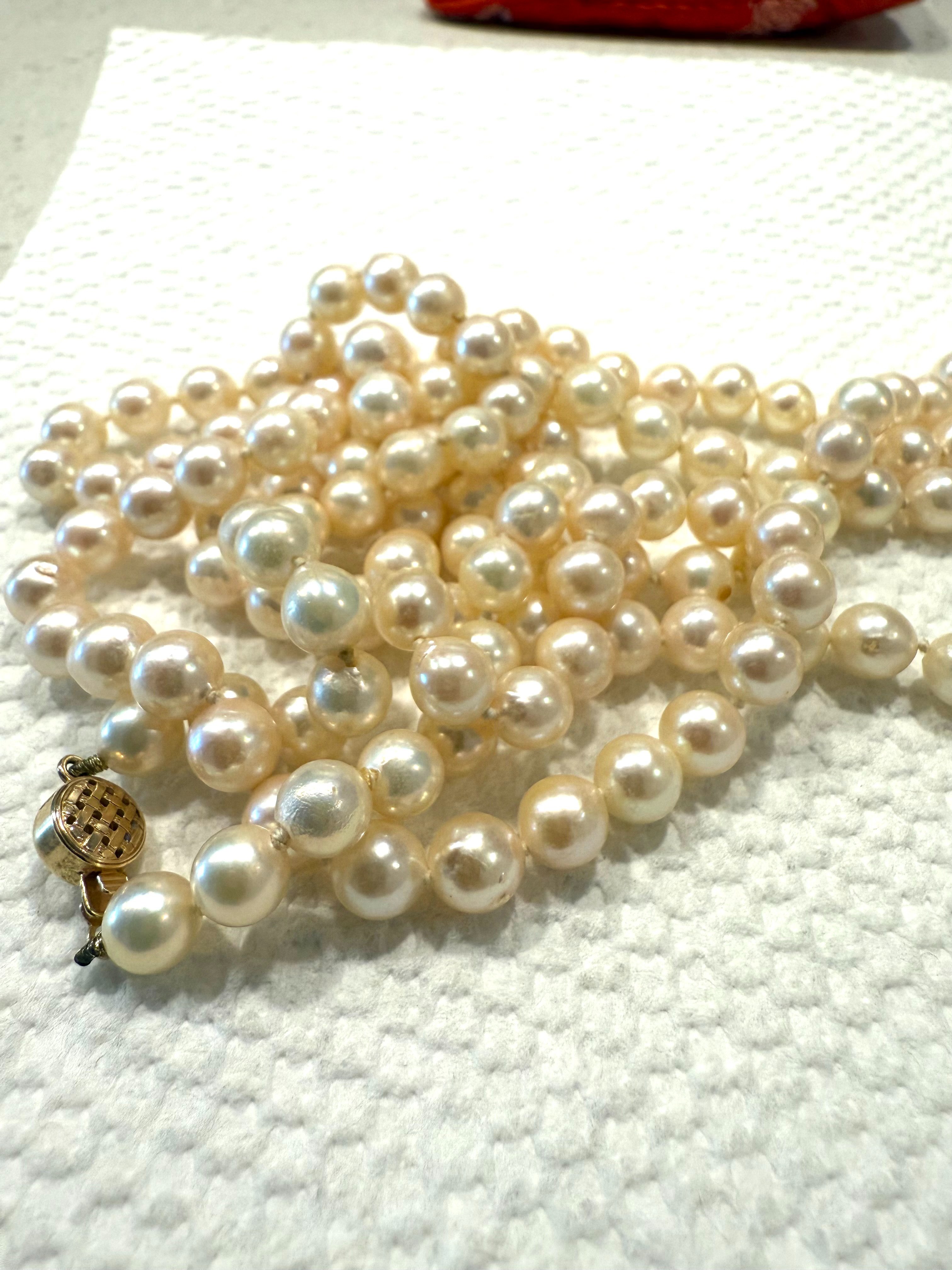 These pearls were passed to my mom from her Aunt a few years back.. Looking for a range of value and the name of the Jewelry maker. We think they are Japanese. They are beautiful and clean. Slightly pink hue but I don't know enough to know if that is good. Any guidance is appreciated. Approx Value?