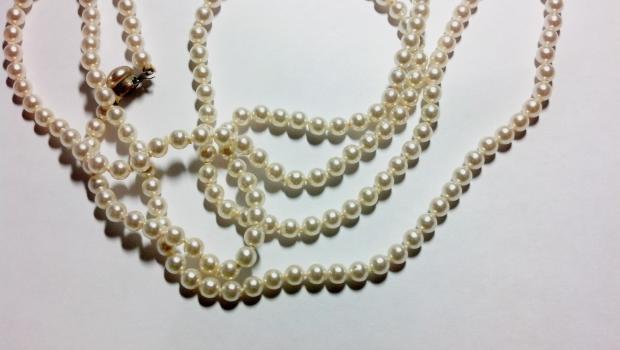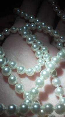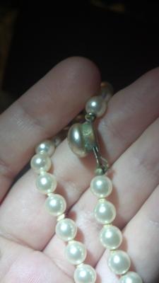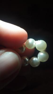 I did the classic thing and bought these on ebay, they were labeled as "real" pearls, I figured they were probably cultured or low-quality since I got them pretty cheap. The clasp makes it clear that this necklace is old, it has 207 pearls on it total. I do like the necklace!! Obviously when I received them they were... dubious. They fail the tooth test, and have some questionable marks around some of the drill holes, and they're not very heavy. However, the surface is not even, many of them are not perfectly round, and the pearl on the clasp is an odd color and shape - it definitely could be a real flat pearl, but it also fails the tooth test. I'm wondering if they could be some sort of ... cultured, coated pearl? Quite sure they're not valuable, but they also don't seem to be the typical fakes. Anyone have an idea how old these might be, or how they were made? There's no signature on the clasp. It seems to have corroded as though it was plated copper. The string definitely appears old, and the knots are tight and worn, making it obvious that they aren't simply new plastic pearls restrung with an old clasp. Below are some pictures I took with my cell phone camera (bleh) under a bright flashlight.