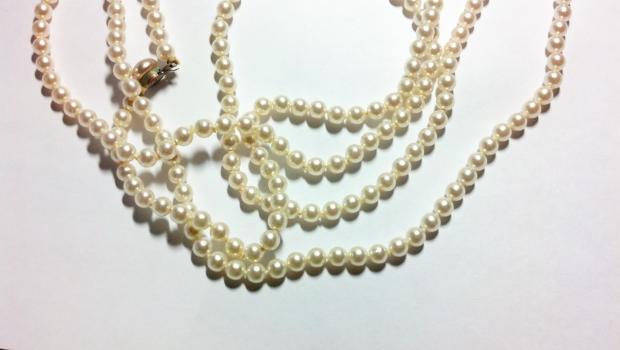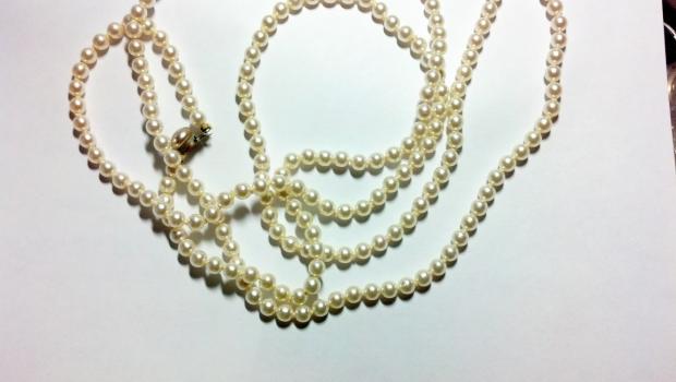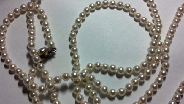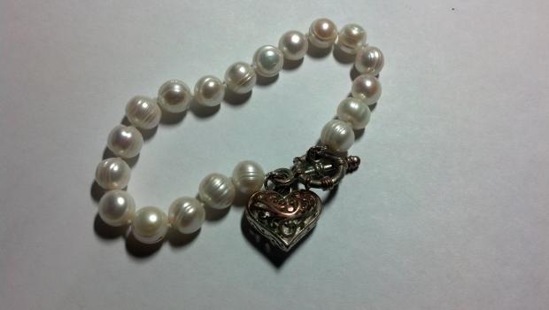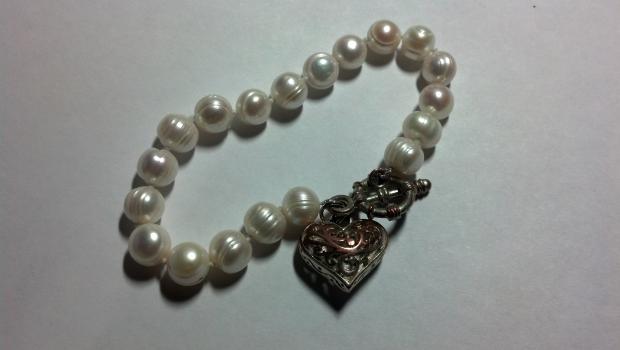 later edit... I read more posts and pulled out my ott light (which is supposed to give "natural" light). I also changed the settings around on my digital camera so that they came out more accurate, although they still vary somewhat in their luster depending on the angle. I'm also adding a picture of a bracelet I bought years ago, definitely fashion jewelry, as you can see the plating has rubbed off the clasp from wear! I want to re-string these since the pearls are so big I can't get the toggle undone. Any ideas about clasps and re-stringing material would be appreciated. I know they're not valuable, but I love how strange the shapes are! Photos are still a tad dark, sorry, just couldn't make things brighter in here.