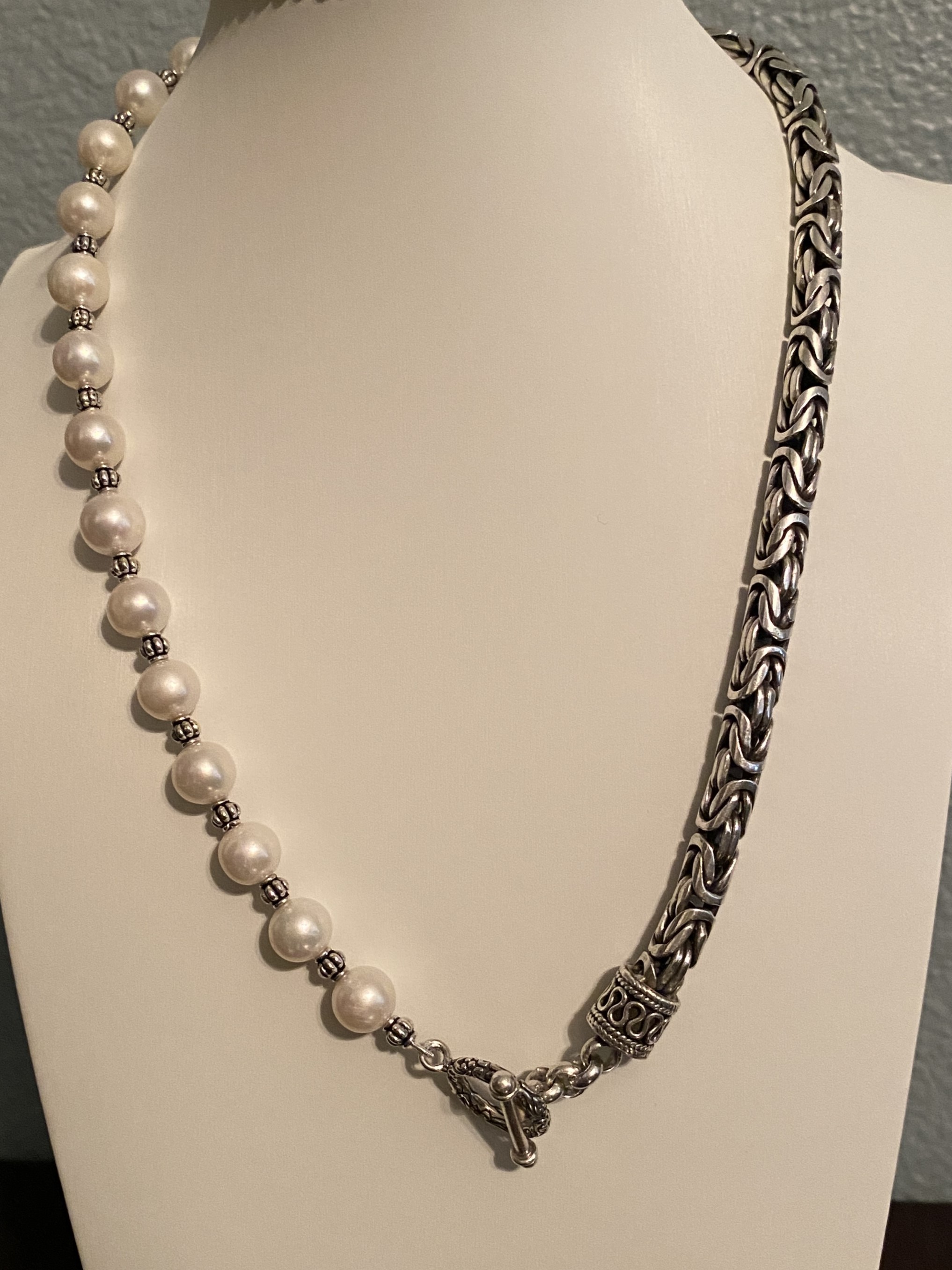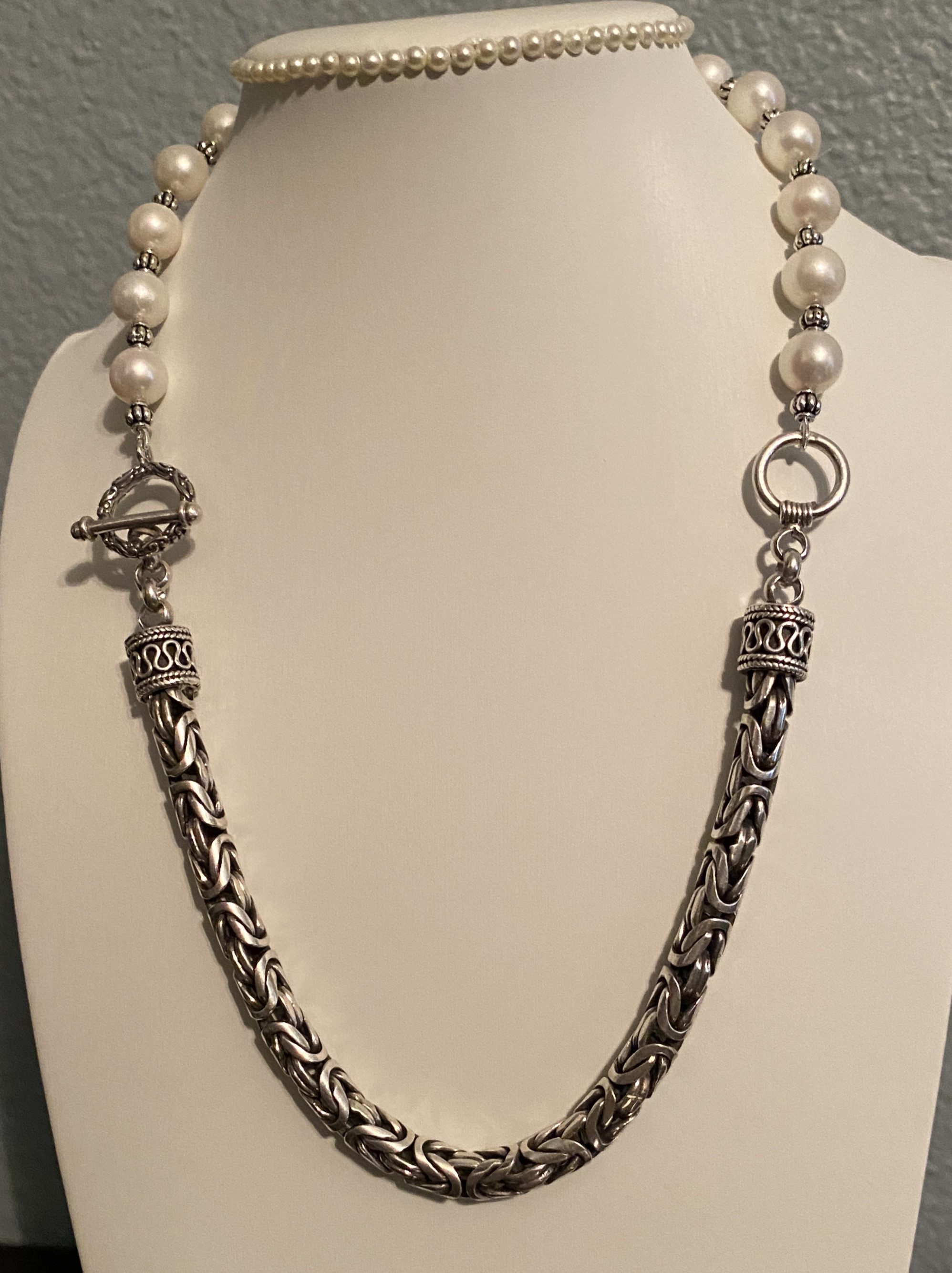 My 2nd Byzantine bracelet arrived (remember, the first one was stolen/misplaced in the USPS mail). This one, thankfully, arrived safely. It is more substantial than the first one, being 6mm in diameter. For this reason I decided to use a heaver 9mm FW pearls and some Sterling Silver accent beads to help bring out the silver between the pearls and off-set the heavy silver on the other side. I did have to order a 2nd toggle clasp but was happy to find one in a Byzantine style. It is a fun, quite different look. It could go for man or woman, but it is only 18" long. I took a picture of the two toggle rings so you could see the back of the necklace. Of course, it can be worn in many ways. I think I like the "Halfsies" way best.
