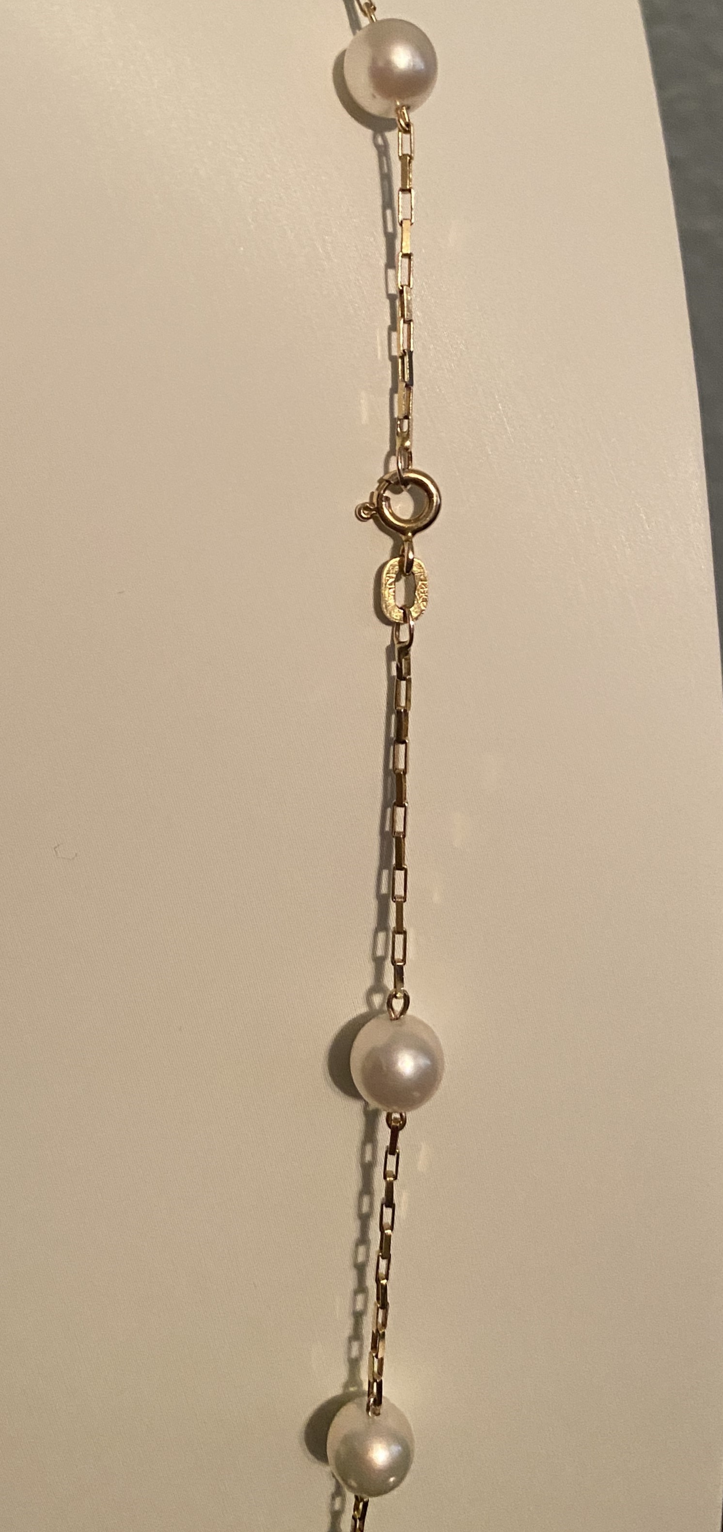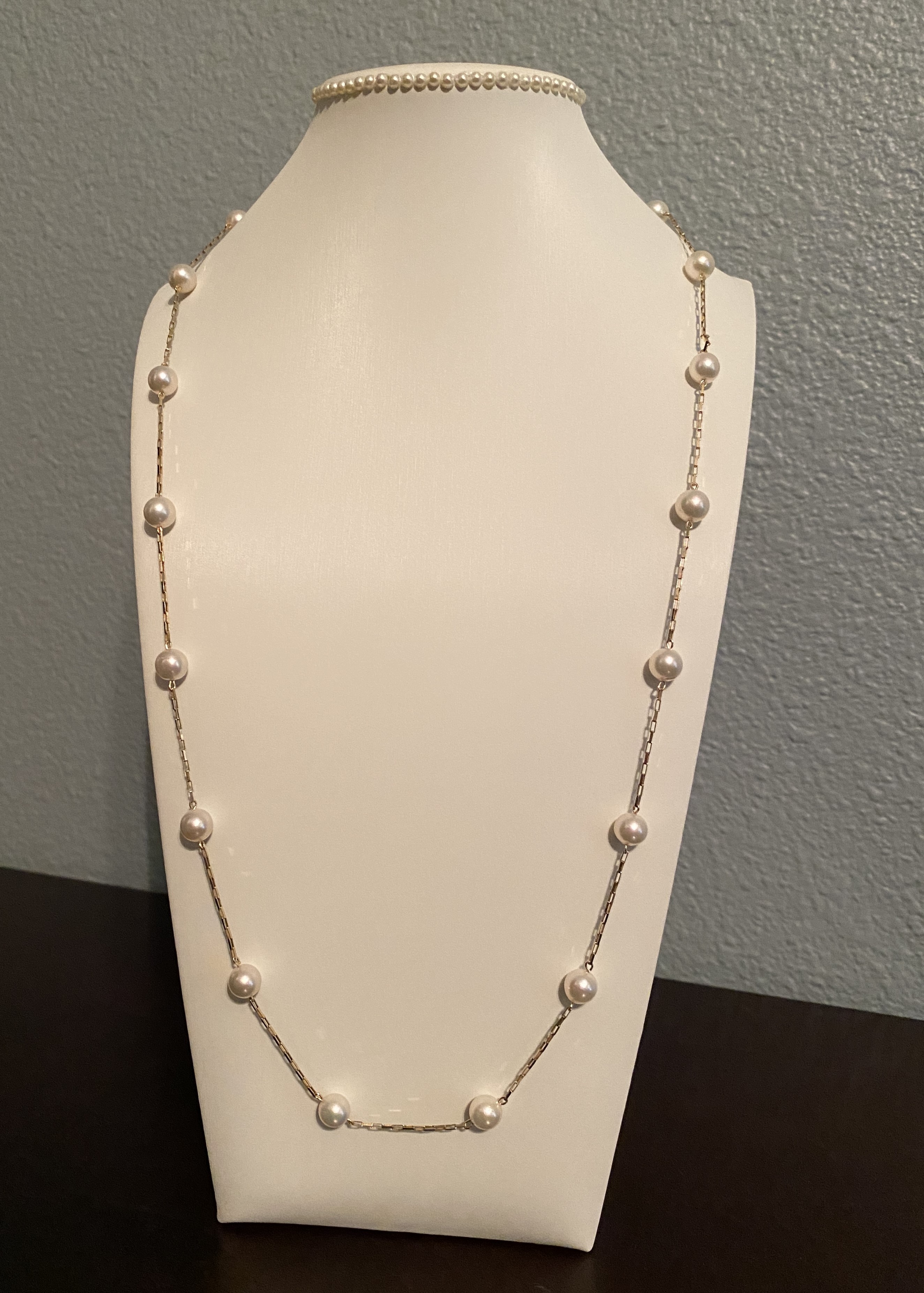 Also, this past week I attempted my first Tin Cup strand. I guess using 14K gold chain, 14K gold wire and high-end Akoya pearls, I went big for my first attempt. This lovely and unique chain was my inspiration. I carefully counted 11 links (1") and added a 7.5mm Akoya pearl with a 14K half-hard headpin, bent to accommodate the chain link (A similar "Mikimoto station necklace" was my inspiration and template). A couple of times I had to "unbend" the wire to get the ring more rounded so the chain links would flow inside the loop without hanging up. It was an enjoyable task, ending with a 28" Tin Cup strand that can be shortened by linking the clasp on any part of the chain between pearls. When worn shorter there is a "fun" tail to the necklace, that can be worn either in front or in back. I definitely got better and better at my wire bending along the way but the half-hard gold headpins were definitely the way to go. This delicate chain would break before the headpins give way.