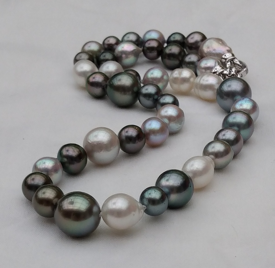 When I made that one I discovered that it's difficult to combine white and deep golden south sea pearls with tahitians. It requires some pretty dark tahitians. That's funny because white and golden south sea pearls looks lovely together. As do white south sea pearls and tahitians. If this looks good I have another Pelosi like strand. A pair of them. I have made a lot of pairs lately. First the dark tahitian and white strands. For some reason they are quite easy to photograph