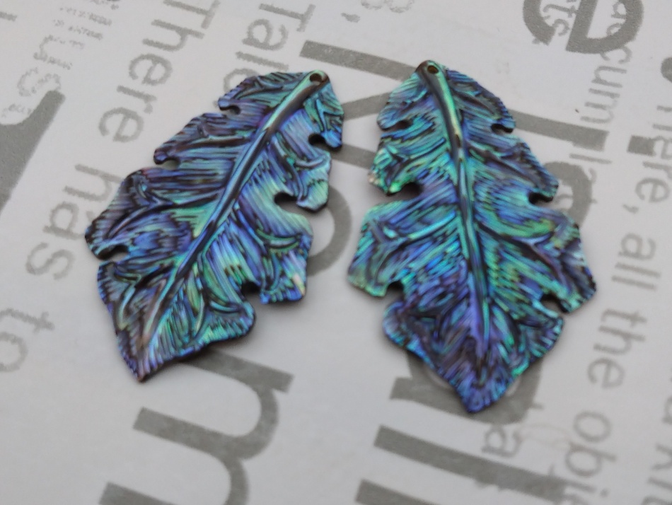 Then I want to do something with that pair of carved abalone (I think) shell oak leaves. They don't really go with any of my pearls, too vibrante blues and greens. They don't look good with my blue tahitians.