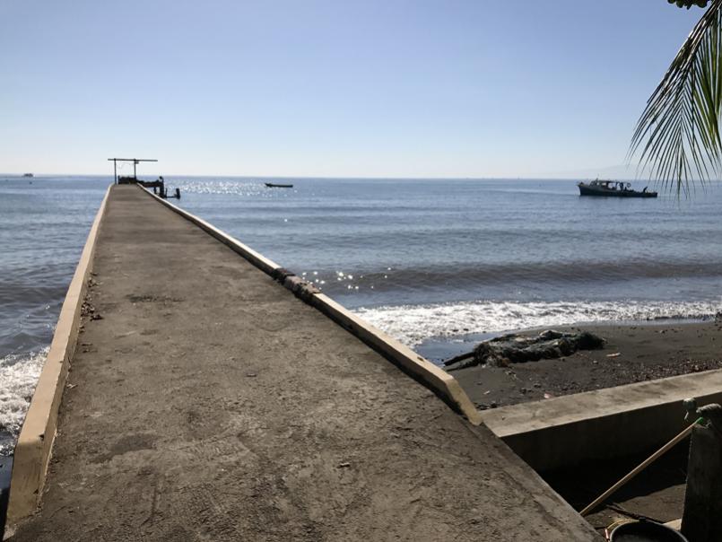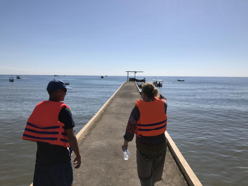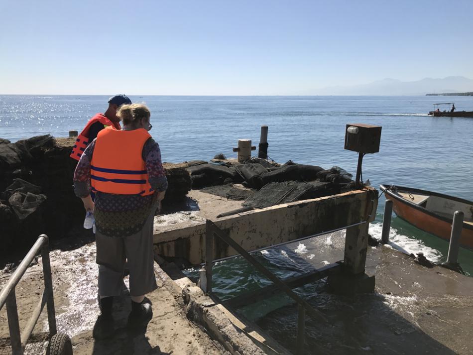 Finally, Nickolas, the Frenchman manager, was ready for us. The seas were not completely calm, but they were good enough for their workers to be working that day. And, safe enough for us to go see what they were doing. Life jackets on, we headed out onto the pier.