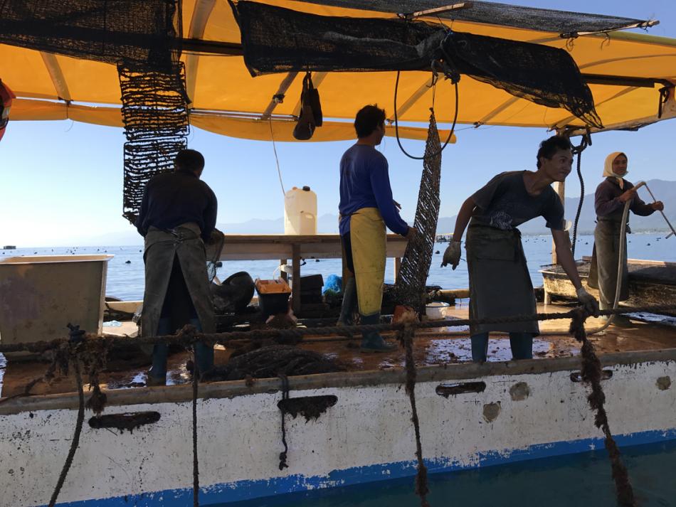 These are very small oysters, and they are clustered together in rows. As well as cleaning the young oysters, the workers are also checking the long lines to be sure that they aren't broken or in need of repair.