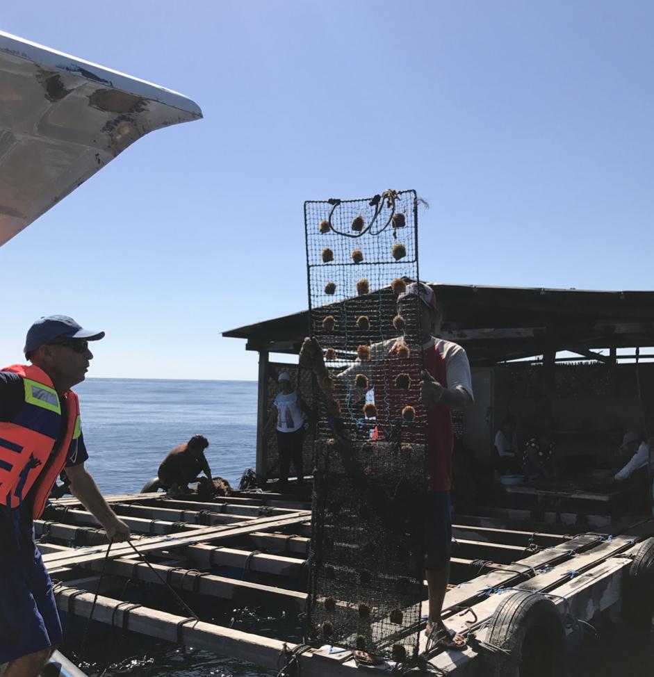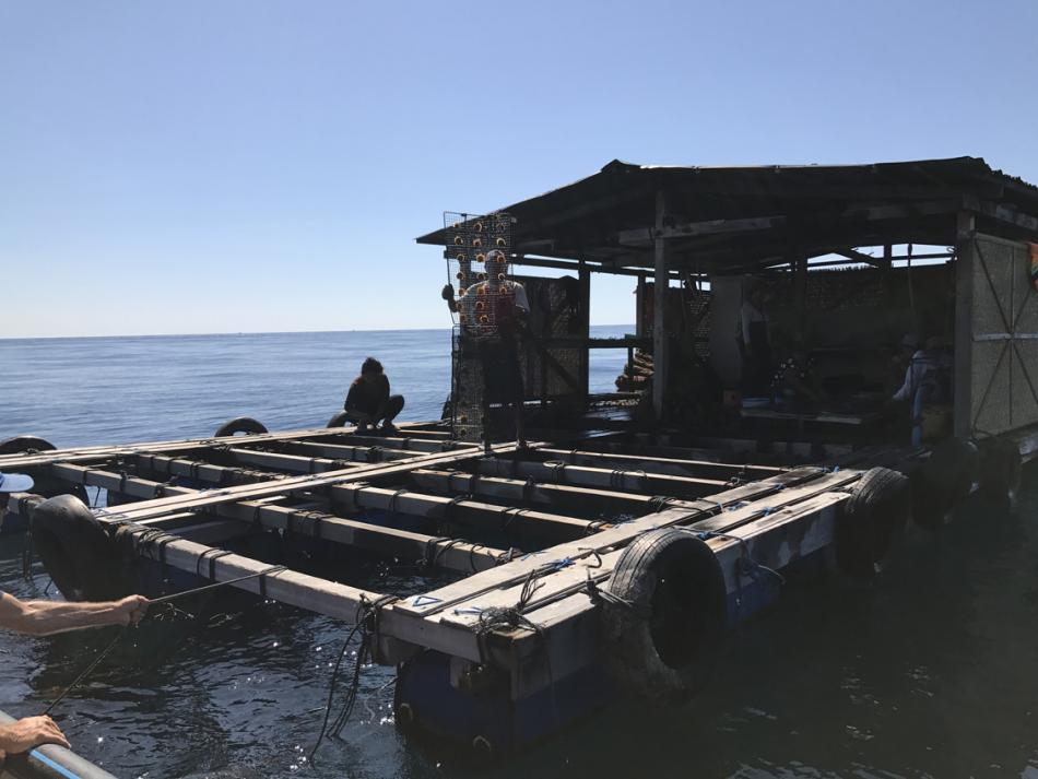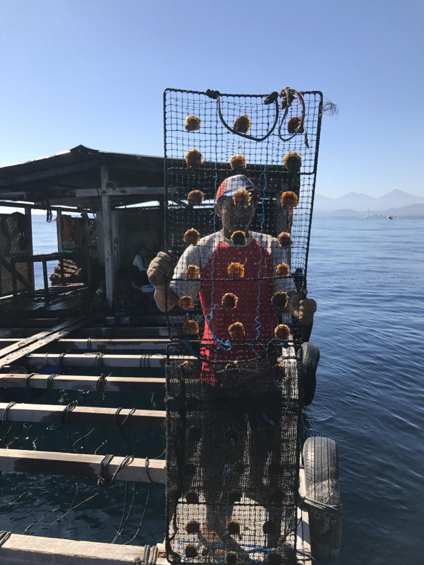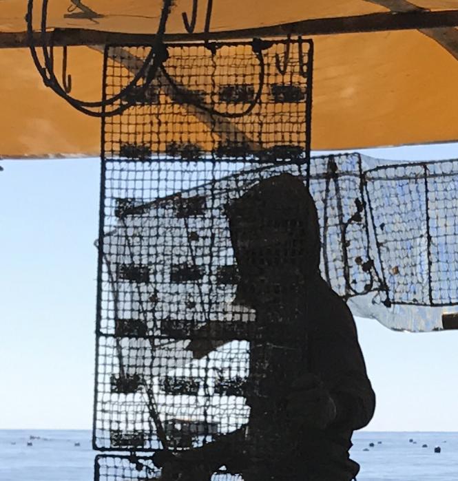 When the oysters are about 5-6 centimeters, they are attached on trays like these. At our request, a worker brings the oysters over so we can get some good pictures.