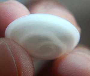 This miraculous 'pearl from the eye of a Nautilus' was sold to a London jeweler and subsequently sent to GemLab for certification (my assumption based upon GemLab director Thomas Hainschwang's description of an odd specimen with 'swirl' received just prior to our meeting in Tucson last February).…below are photos received from Bali of a found Nautilus pearl together with its mollusk, and a closeup of the bottom of the pearl with that eyecatching swirl. I'm not anatomically adept is the pearl coming out of the animal's EYE?