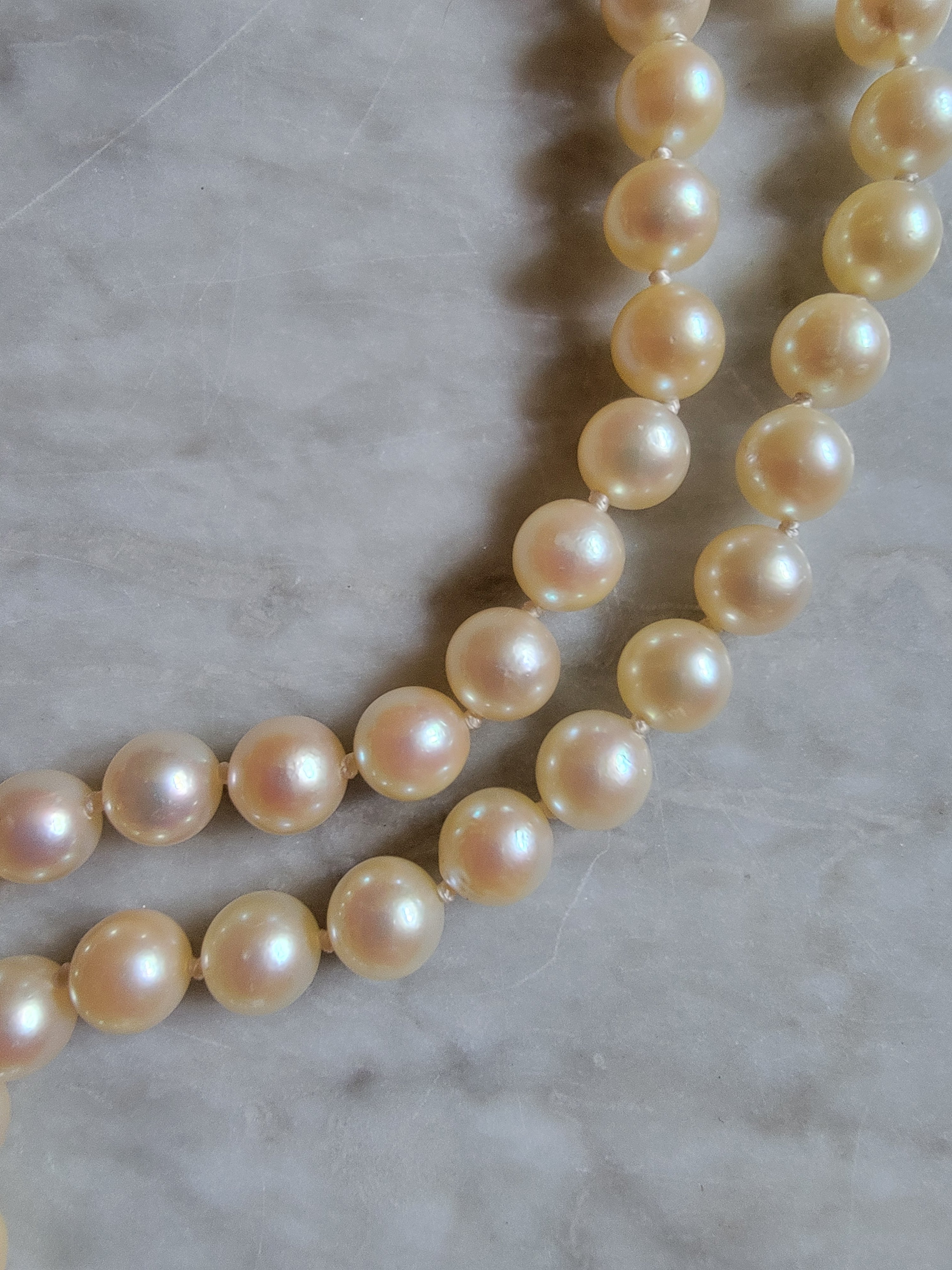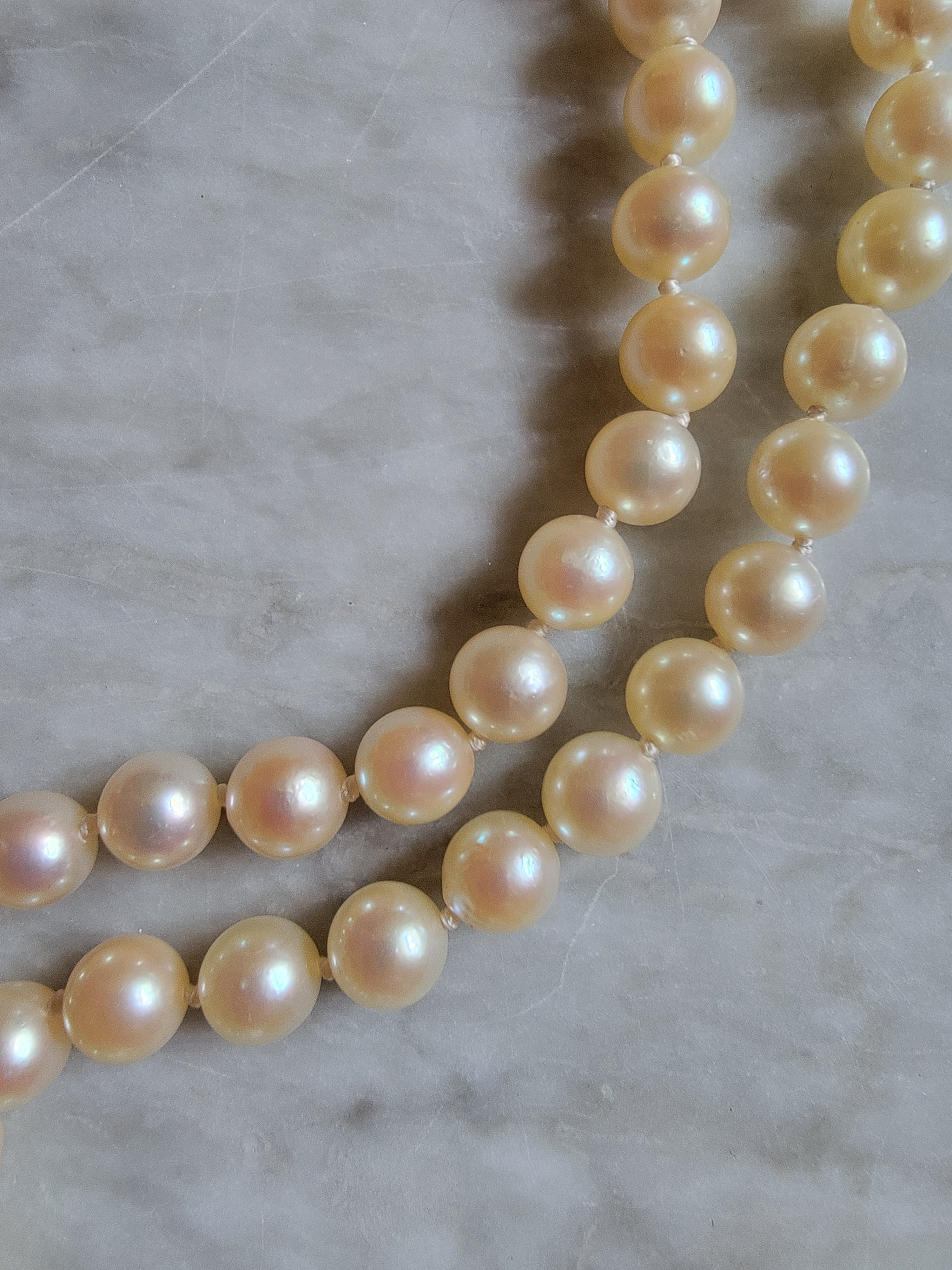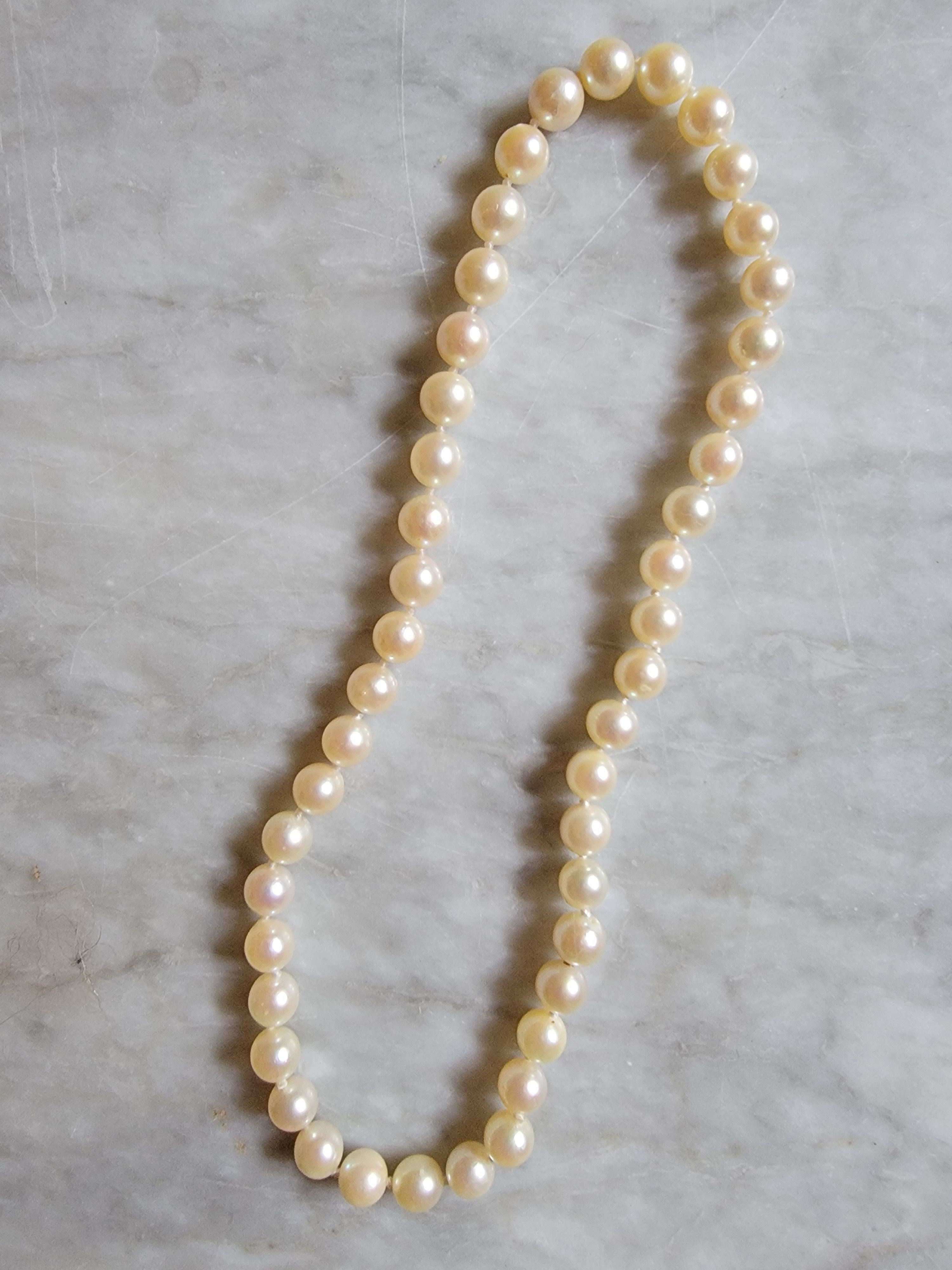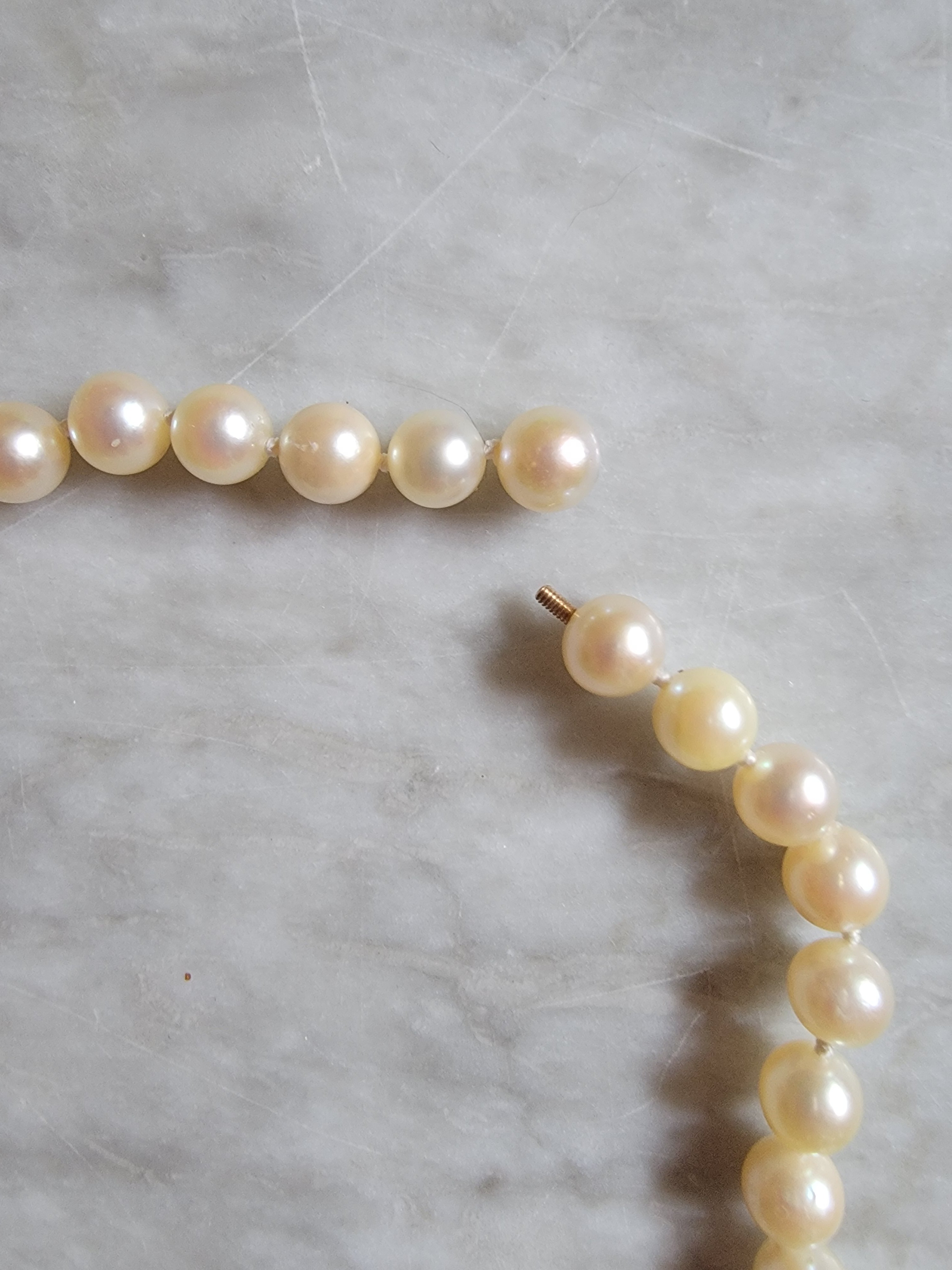 I'd love to know if my two guesses are correct- that they are Akoya pearls of middling quality, and that the necklace dates to the 1990s or early 2000s. Whatever the case, it was a great find for the price and I absolutely love the short choker length. I'd also love to know what I can do about the slight kinking that's happening throughout, which is still visible when it's worn.