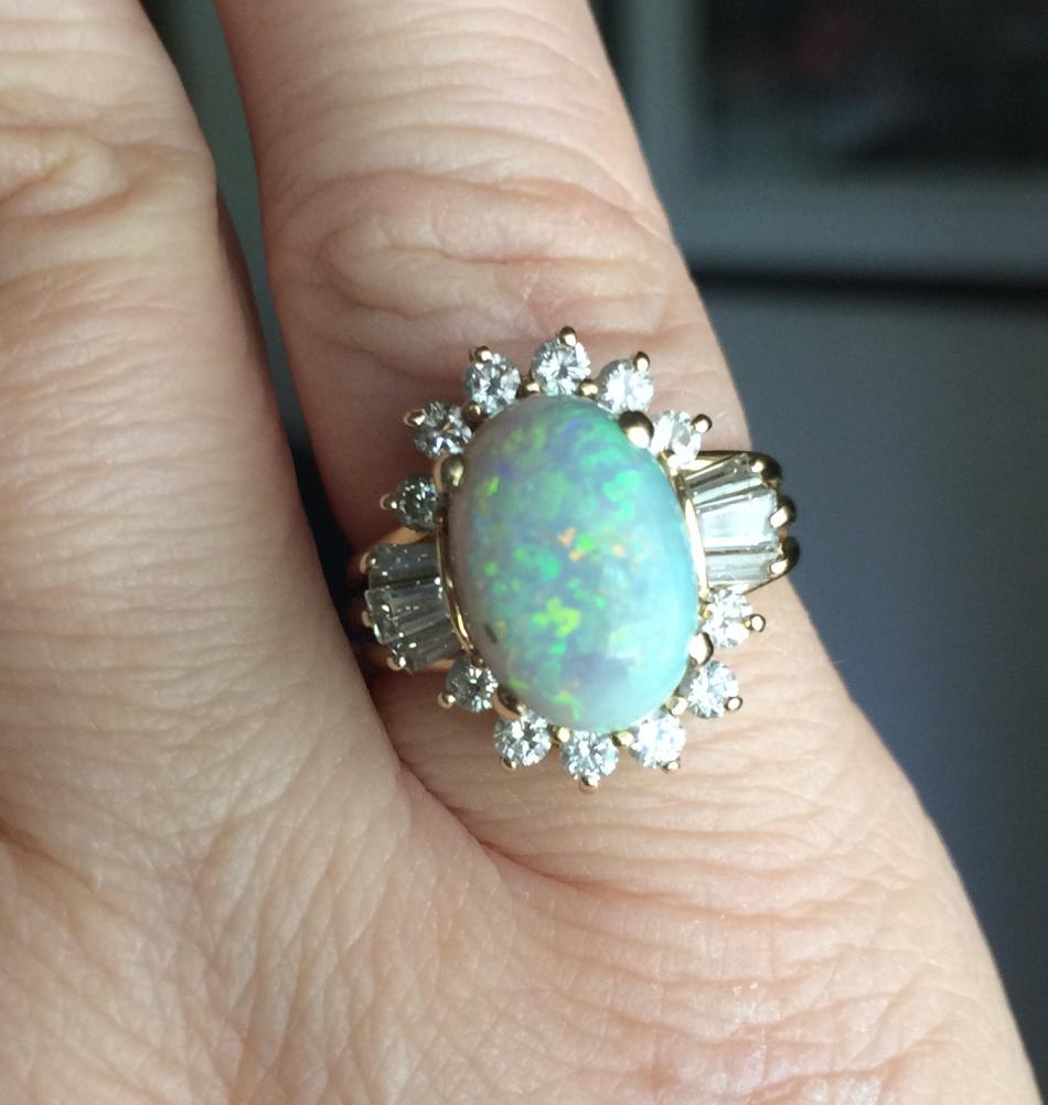 Her jeweler looked and looked and finally found an opal that would fit the ring. It's not as pretty as the original opal, and it has a black spot on the left side (which you'd never notice unless I pointed it out). But the ring looks gorgeous again.