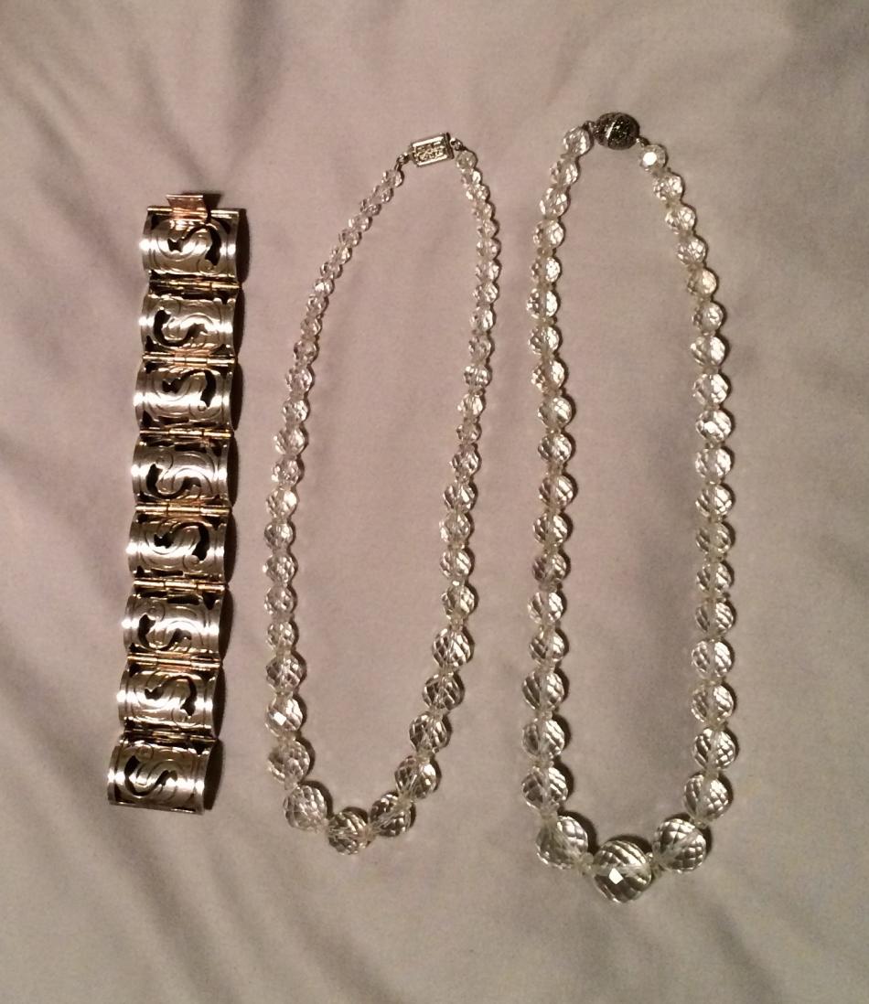 My grandmother and her sister had similar crystal necklaces in the 1920s. My mother remade them into one long necklace in the 1990s and then decided that it was a mistake. She had them restrung back to their original lengths, but she had lost one of the silver box clasps by then and replaced it with a ball clasp. Unfortunately, the necklaces are not strung correctly. The beads are not in the correct graduated order, so I'll have to restring them at some point. Sister had no interest in either necklace, so I took both of them.