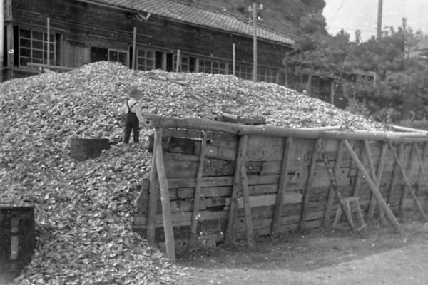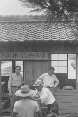 Sometime around 1953 Pacific Pearls Tokyo tried their hand at pearl farming. It was short-lived, but here are some of the photos. Rudolf standing in front of the farm.. and that's Fuji walking on the pile of Akoya shells, and as well fishing from the pier. Lastly Frieda with a handful of fresh pearls.