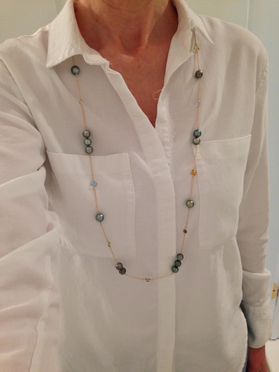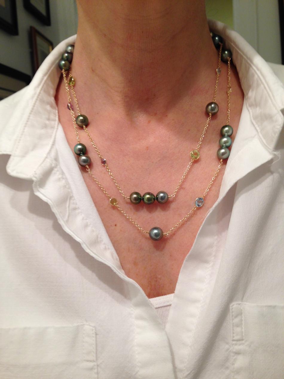 A little more info on the construction...I used 2.3mm (.63mm thick) jump rings to connect the bezel stations to the chain, then I wire wrapped the pearls onto the chain. I really do like the silicone beads because they add a nice stability to the piece. The multi-pearl links are very solid feeling, and the pearls are not spinning because the beads keep them in place.