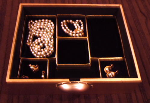 When dry, spray glue the drawer and place the velvet covered side pieces in, and then the wadding-and-velvet-covered base.