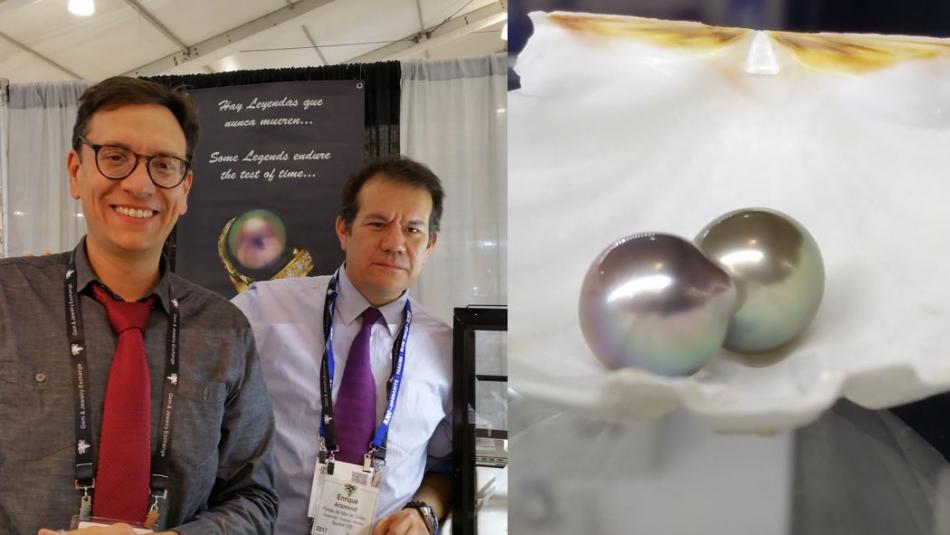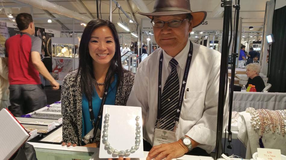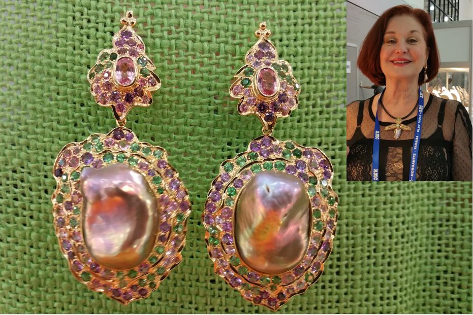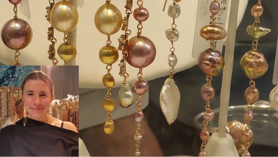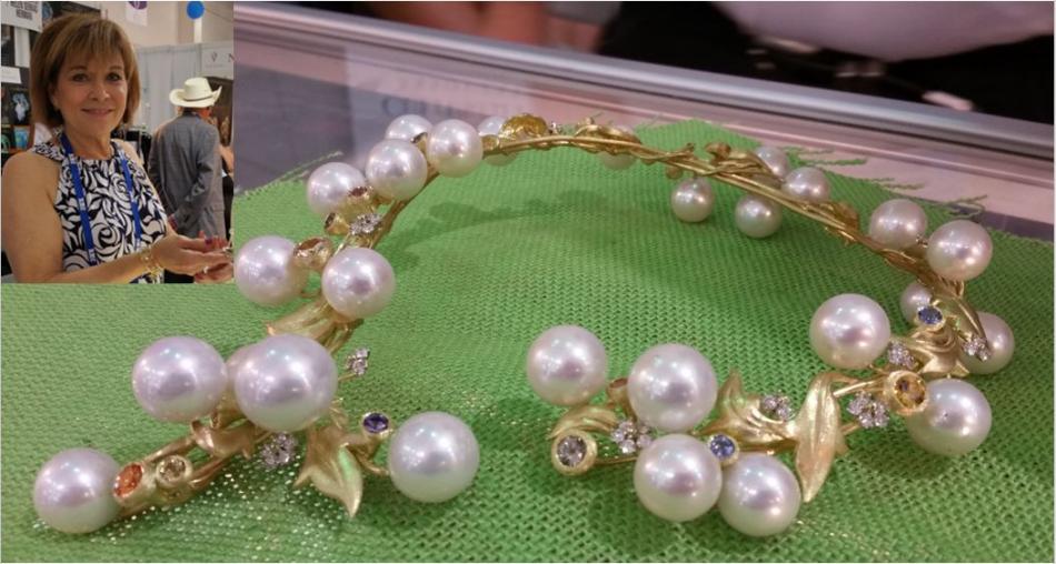Stopping by the CPAA (Cultured Pearl Association of America) awards/display, Paula Crevoshay posed for a photo. Her magnificent earrings received a commendation award. Another future Pearls of the Week, they will be featured in a video that lets the gems sparkle.