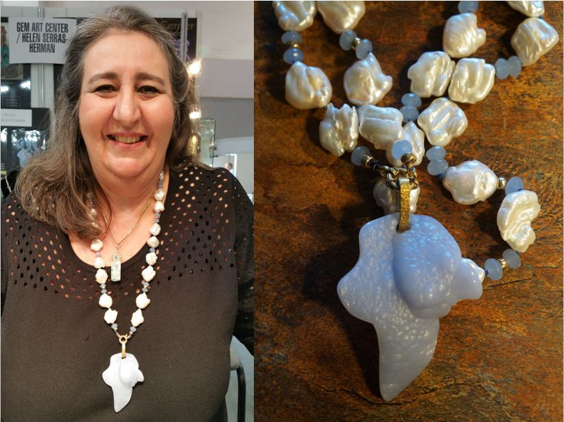 Helen Serras-Herman is an artist. The gem carving on her pearl and gem necklace is a regal example of her work, titled "Uranus, the Sky God". Helen is an FGA, has a Masters of Fine Art degree and has been inducted into the Lapidary Hall of Fame. You can read about her life on her website and check out her sculpture.