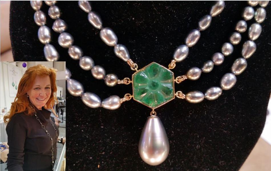 Then it was off to the show floor where I stopped by Atelier Marisa to see Marisa La Belle's latest designs. Here is a necklace with Tahitian keshi strands and drop pearl, centered around a gem carving made to look like a trapiche emerald. Later, you'll see the real trapiche emeralds in dazzling earrings that will be a "Pearls of the Week" feature on Pearl Guide.