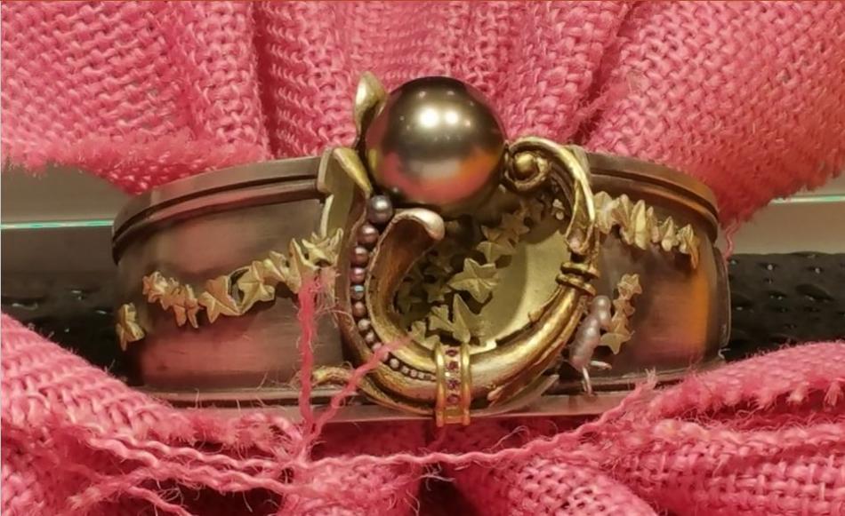 Another CPAA commendation award went to Michael Jensen for his intricate bracelet with green gold, exquisite tiny pearls and a whopping Tahitian pearl. I wanted to visit his booth at another show to hear the story behind his whimsical bracelet, but ran out of time.