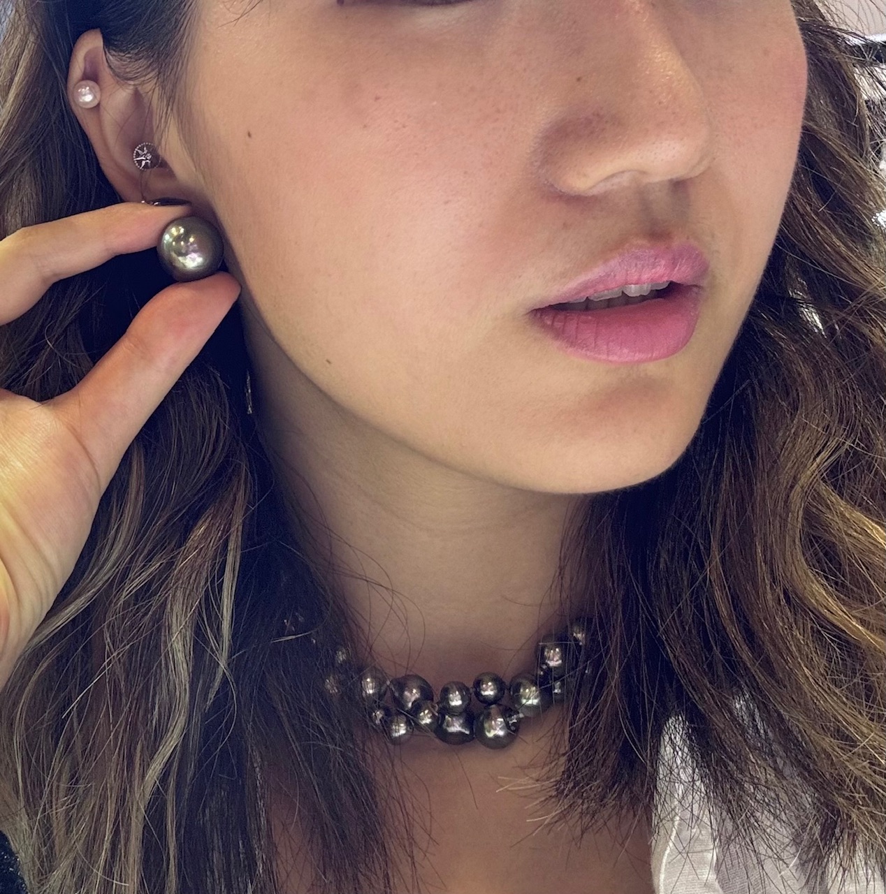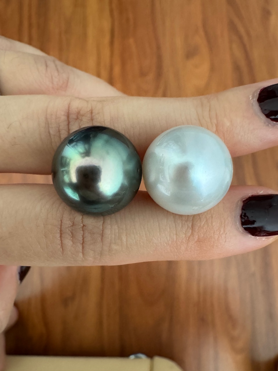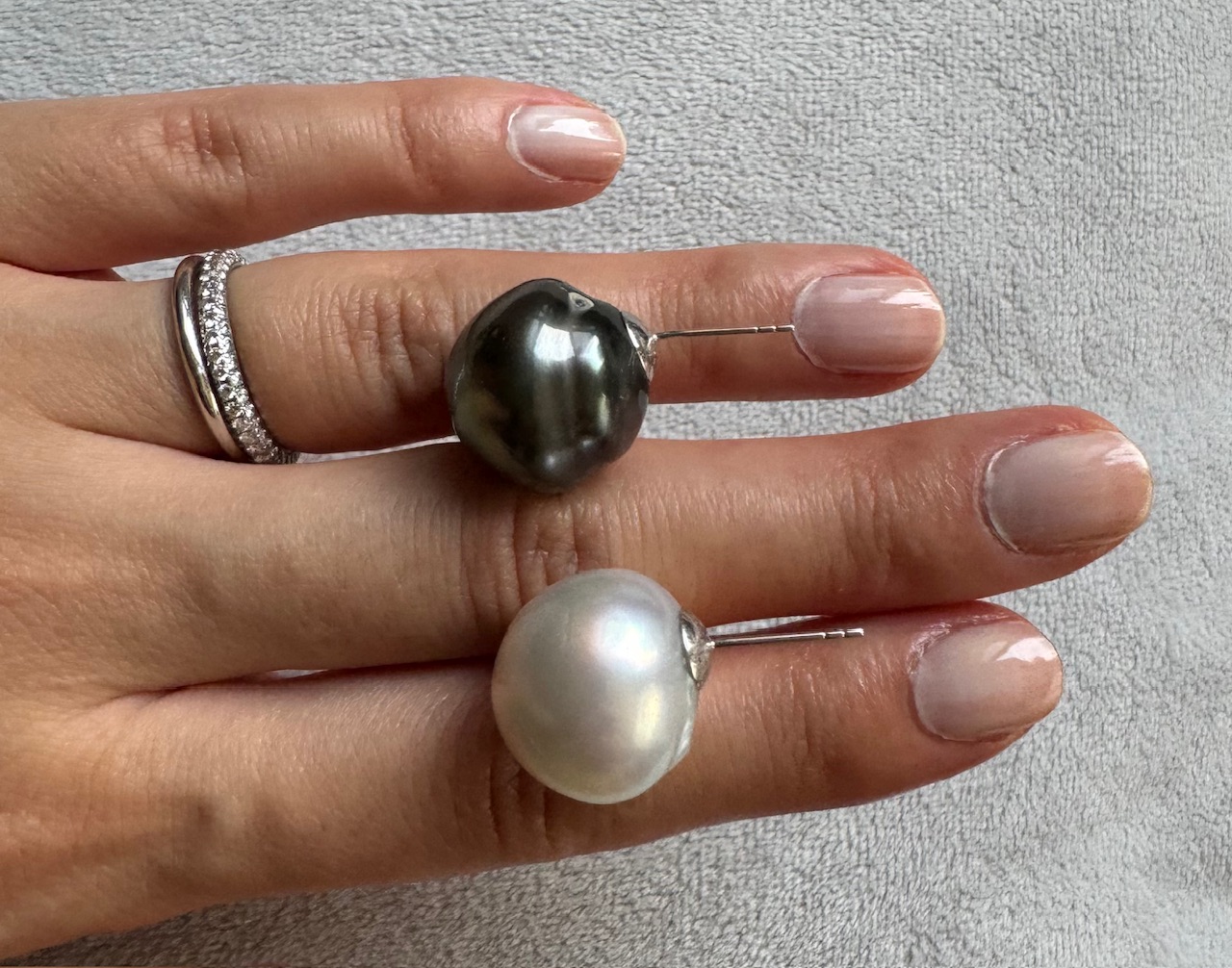 I’ve heard lots of people say that darker pearls look smaller, so it’s okay to have a larger Tahitian and a smaller white pearl as a mismatched set.