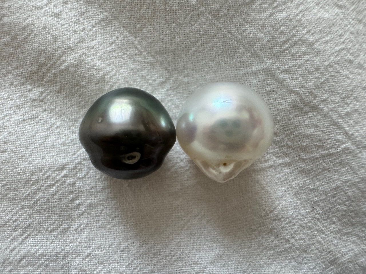 • The Tahitian is pretty lustrous for its size, the WSS not so much but I was happy to compromise on lustre for a similar size and shape to the Tahitian (which I bought first). Both have some blemishes, with the T being more blemished than the WSS