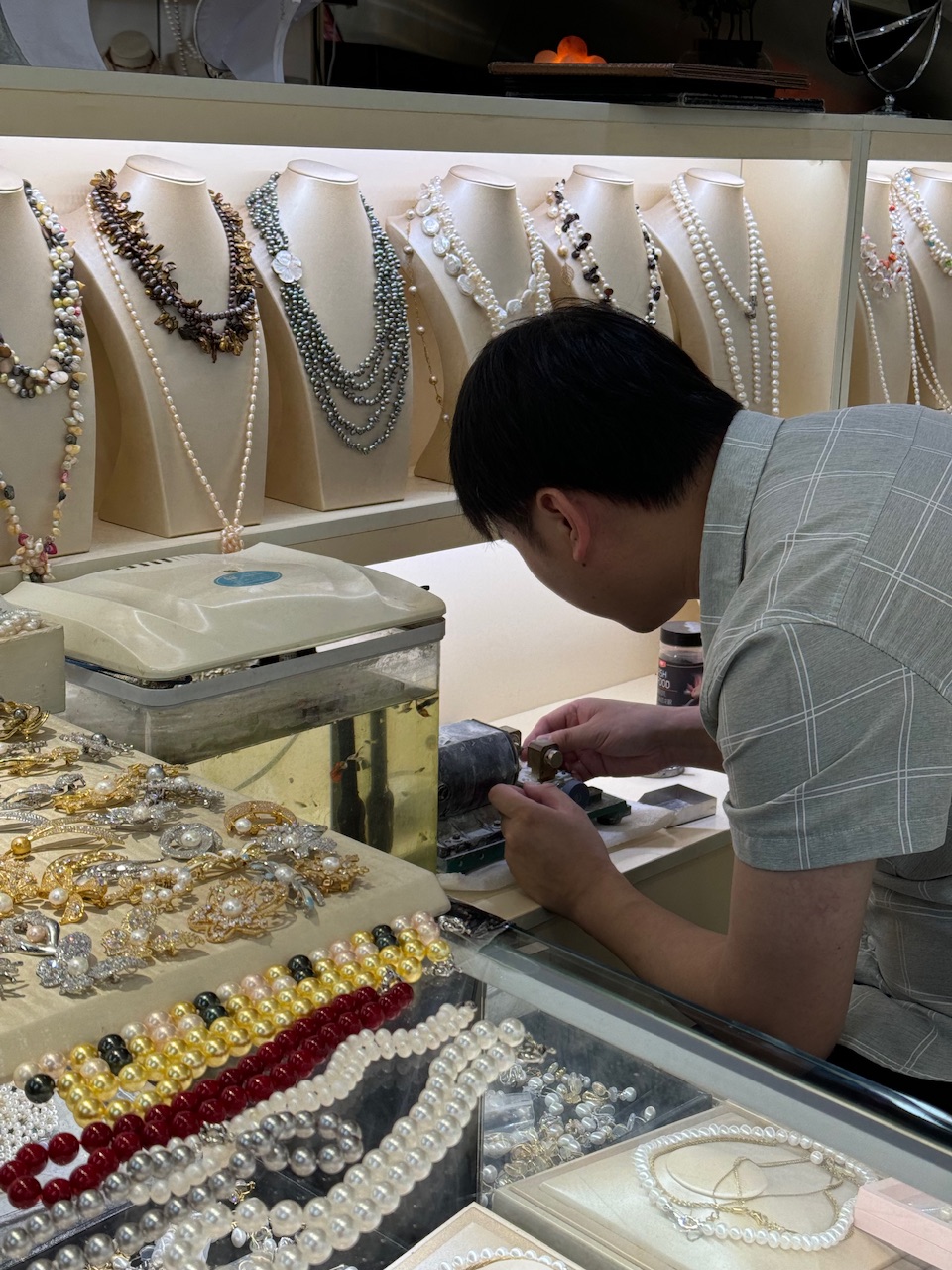 I went to Hongqiao pearl market in Beijing today and one of the vendors (who sold me my very first strand) helped me make the studs.