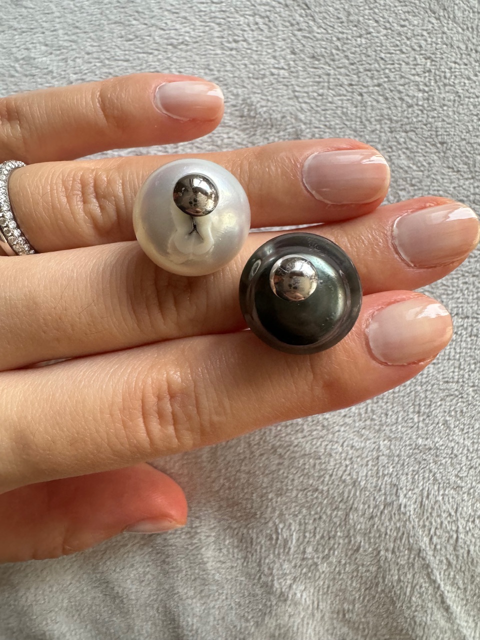 Inspired by @BWeaves ’s mismatched pairs, I went shopping for separate single black and white pearls that could form a pair. I wanted 15mm+ and got 16.5mm :devilish: