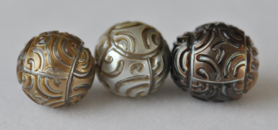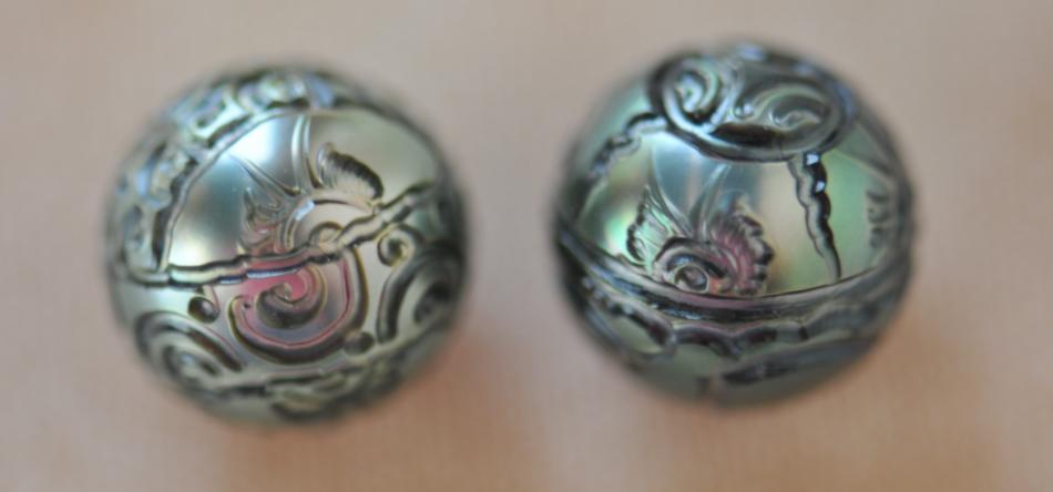Consider these intricate Tahitian pearl carvings, usually only done to save flawed cultured pearls for tourist trinkets, but done in larger amounts during the downturn of the economy. These pearls were carved more for beauty's sake.