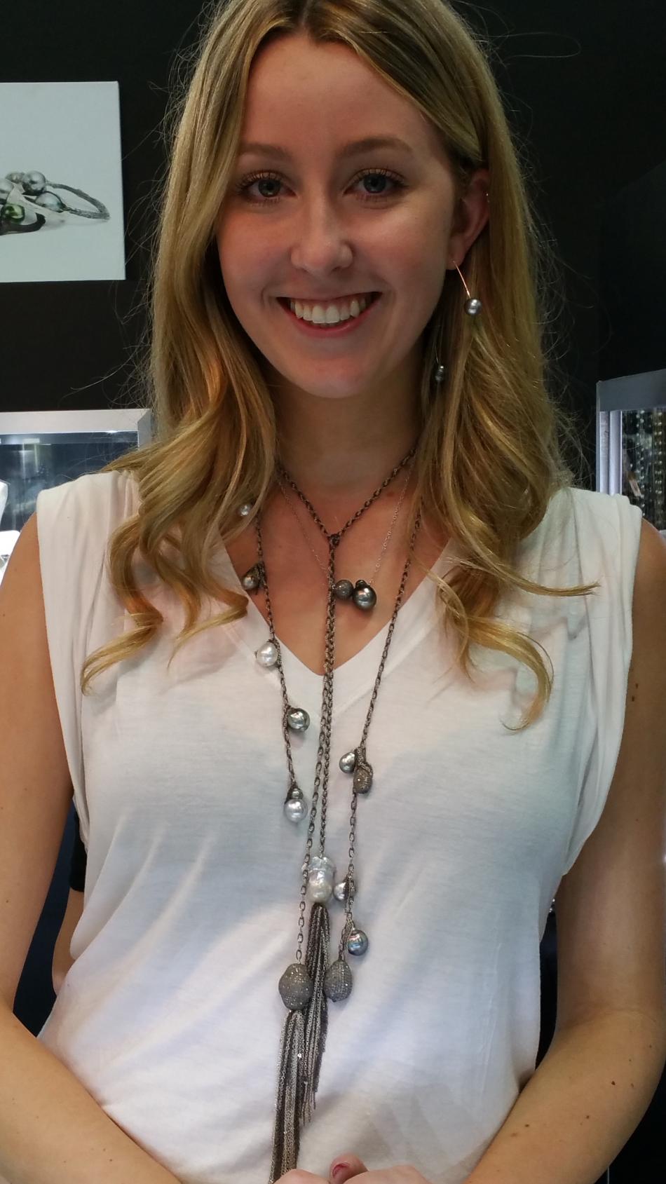 Elizabeth Poteracki charmed everyone wearing an abundance of Samira 13 pearls at the JCK Design center at the JCK show in Las Vegas.