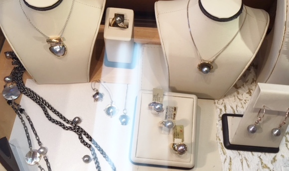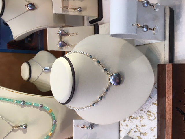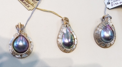Apologies for posting so late ~ getting photos from iphone was challenging. Trios was very busy when I got there, but Eric Braunwert, Kathe Mai's husband and owner of Columbia Gem House was available to chat. He allowed me to photograph the Cortez Pearls and brought from the back room the lovely Cortez mabes with the woven bezels shown in the last photo. Eric and Kathe have been supporters and distributors of Cortez Pearls since their earliest years. Columbia Gem House is committed to "fair trade and responsibly sourced gems," so a great source to be aware of, imo.