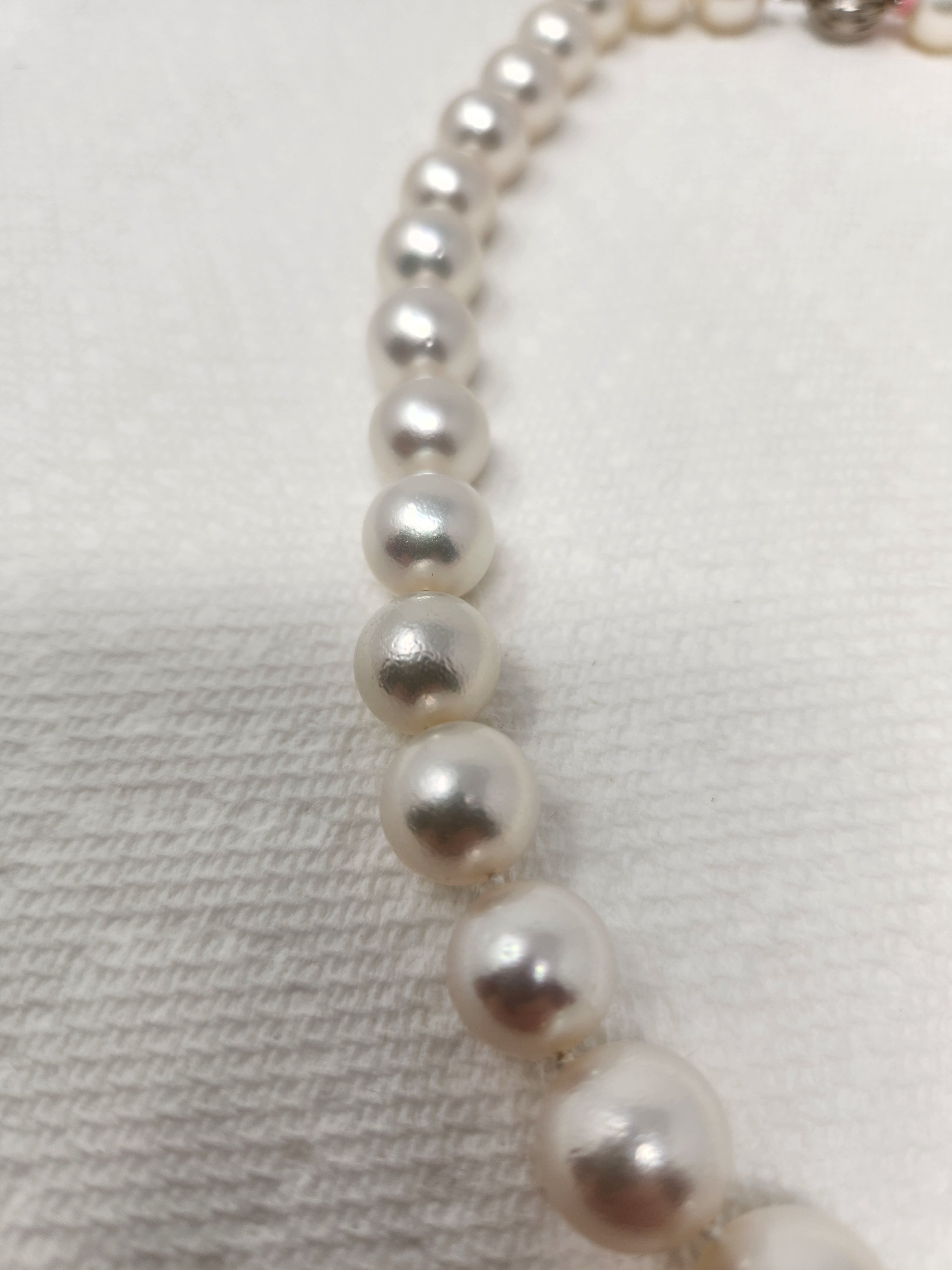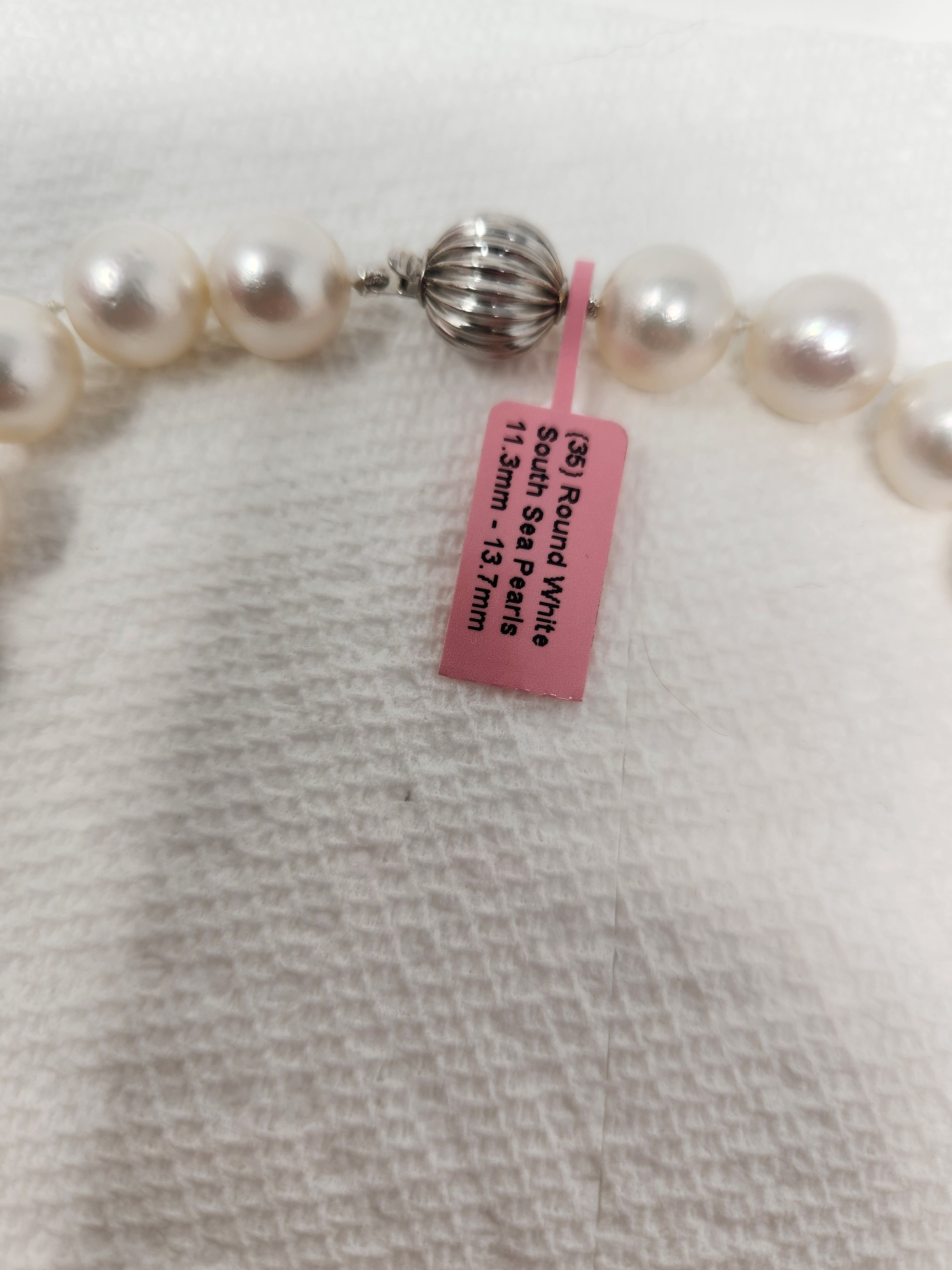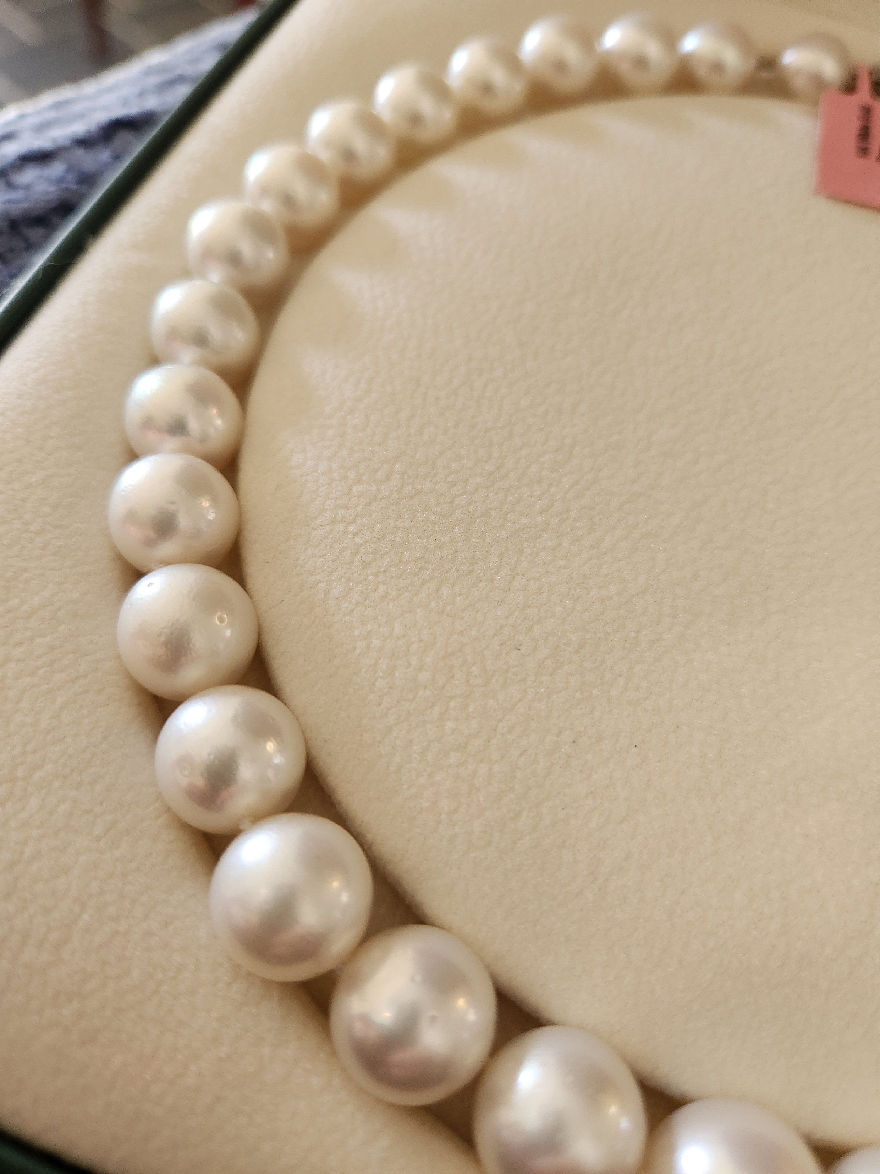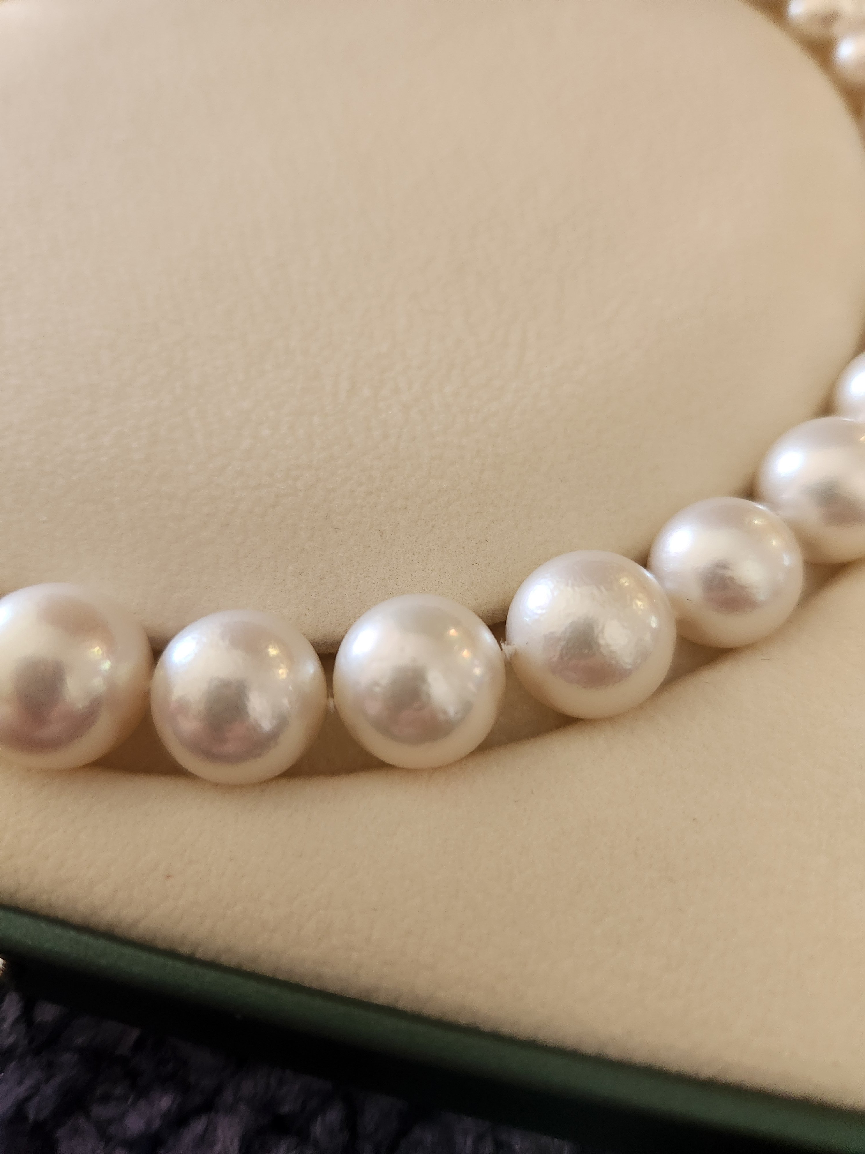 This necklace is supposed to be an estate South Sea necklace. The pearls are described as round 11.3 to 13.7mm with a rose overtone.The clasp is 14k white gold. It was purchased online, gifted to me, and can be returned.