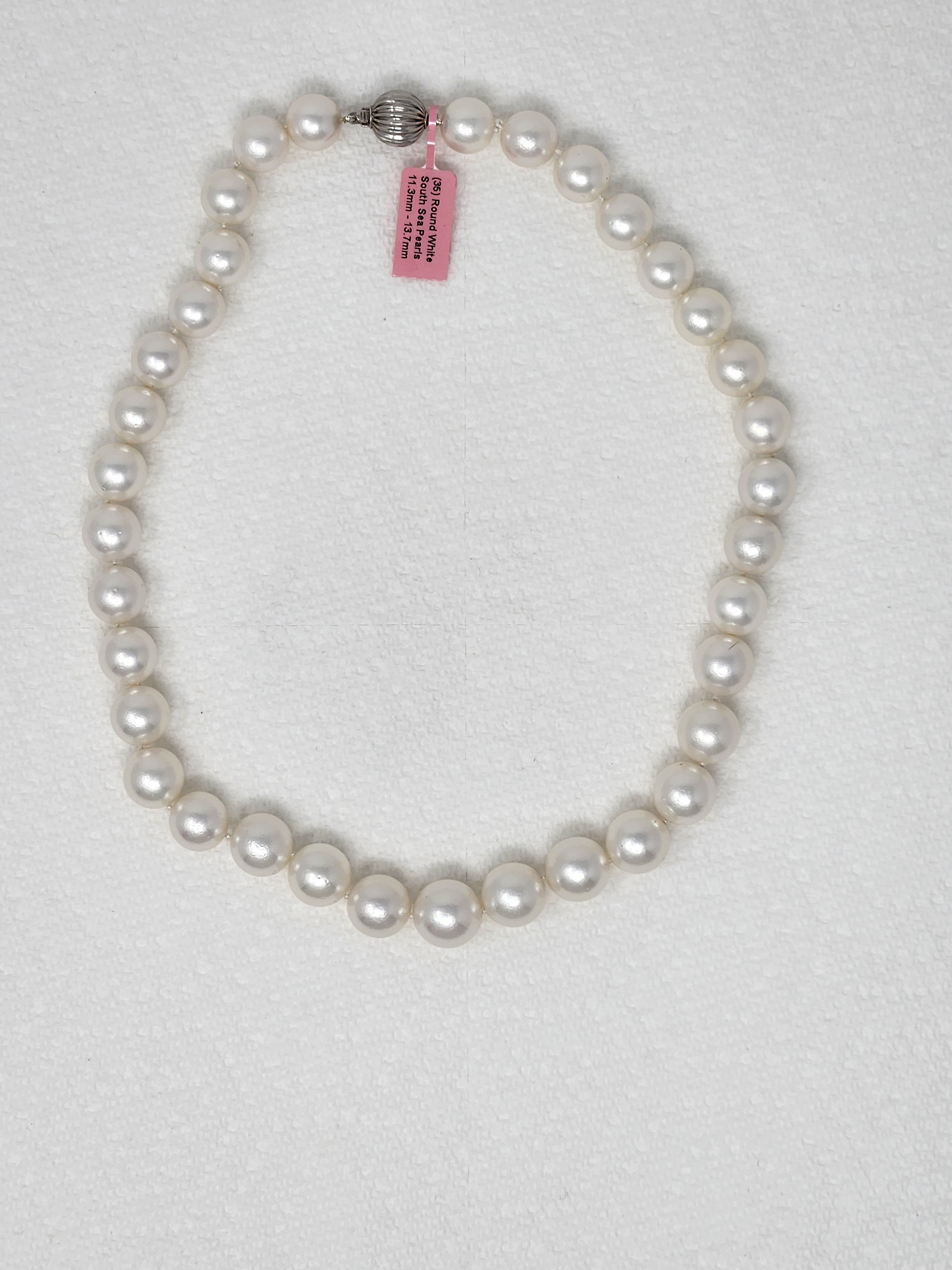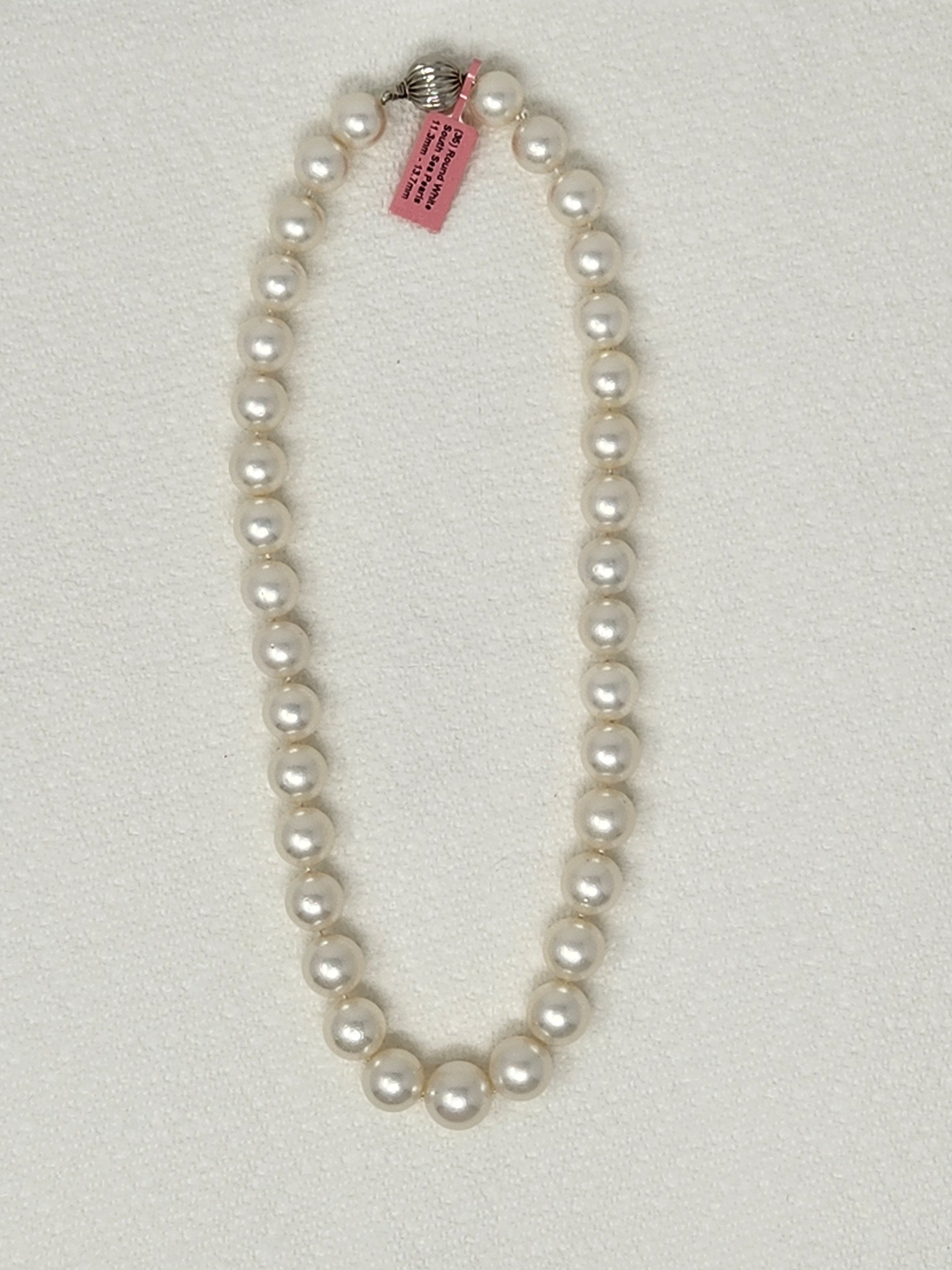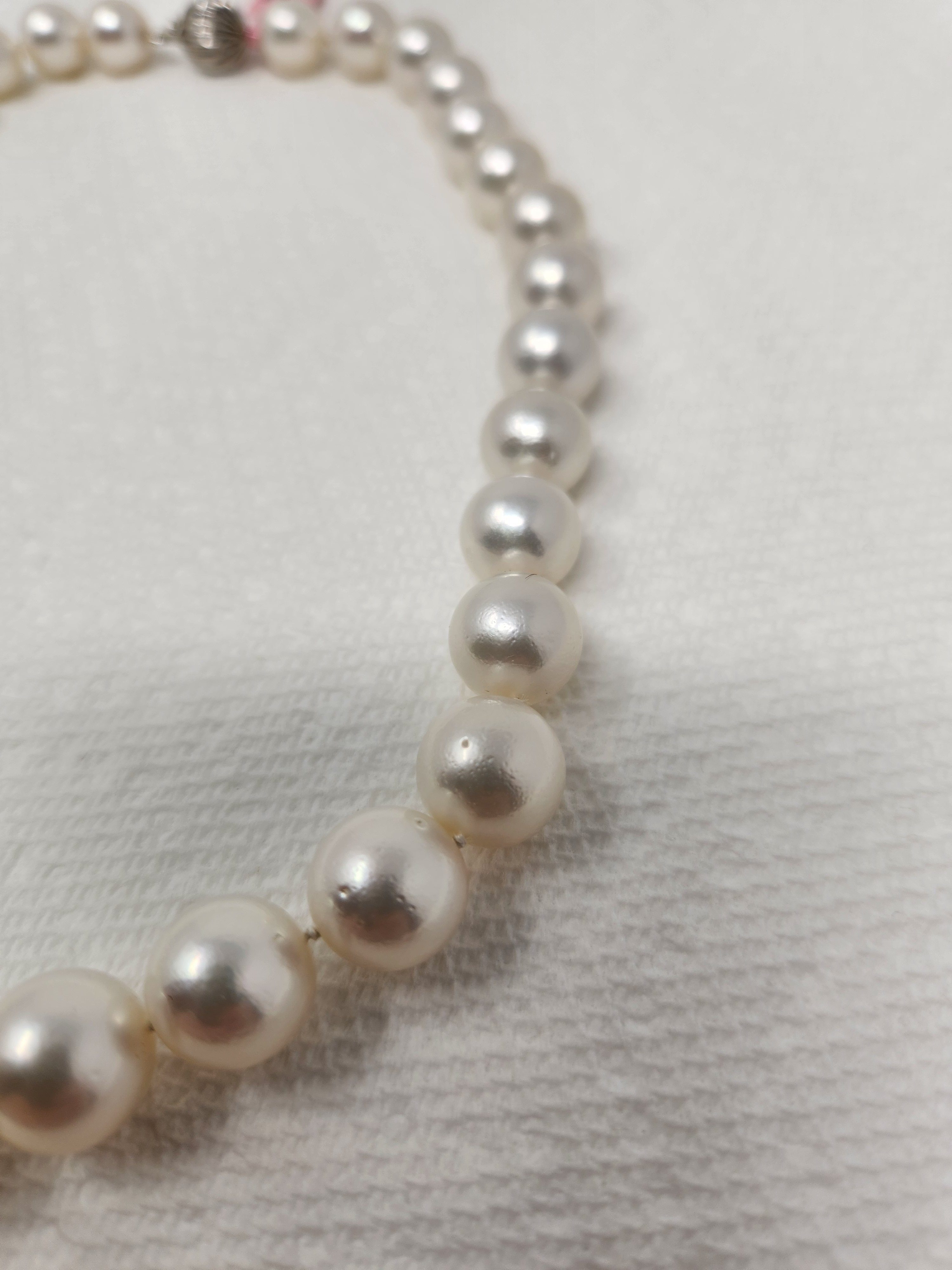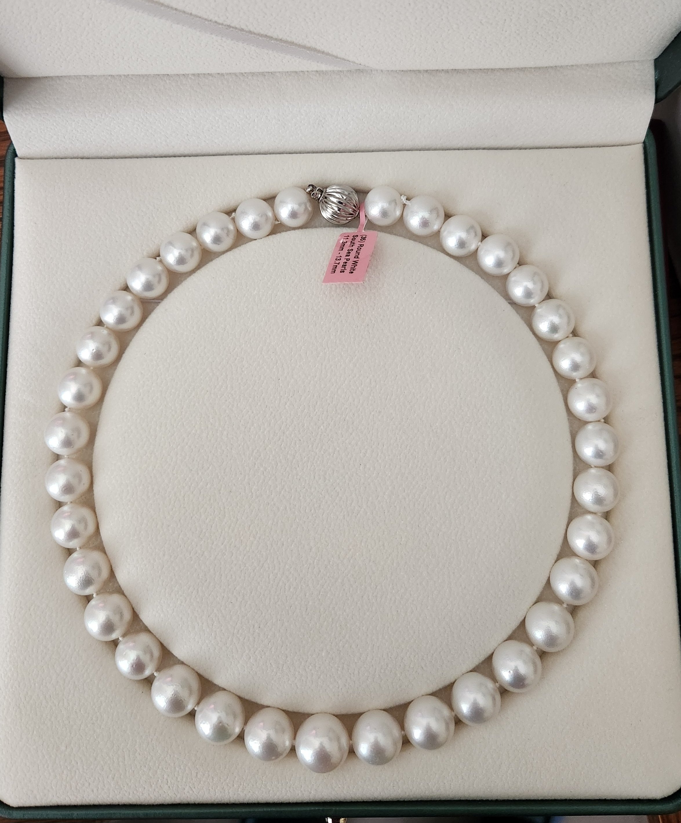 This necklace is supposed to be an estate South Sea necklace. The pearls are described as round 11.3 to 13.7mm with a rose overtone.The clasp is 14k white gold. It was purchased online, gifted to me, and can be returned.