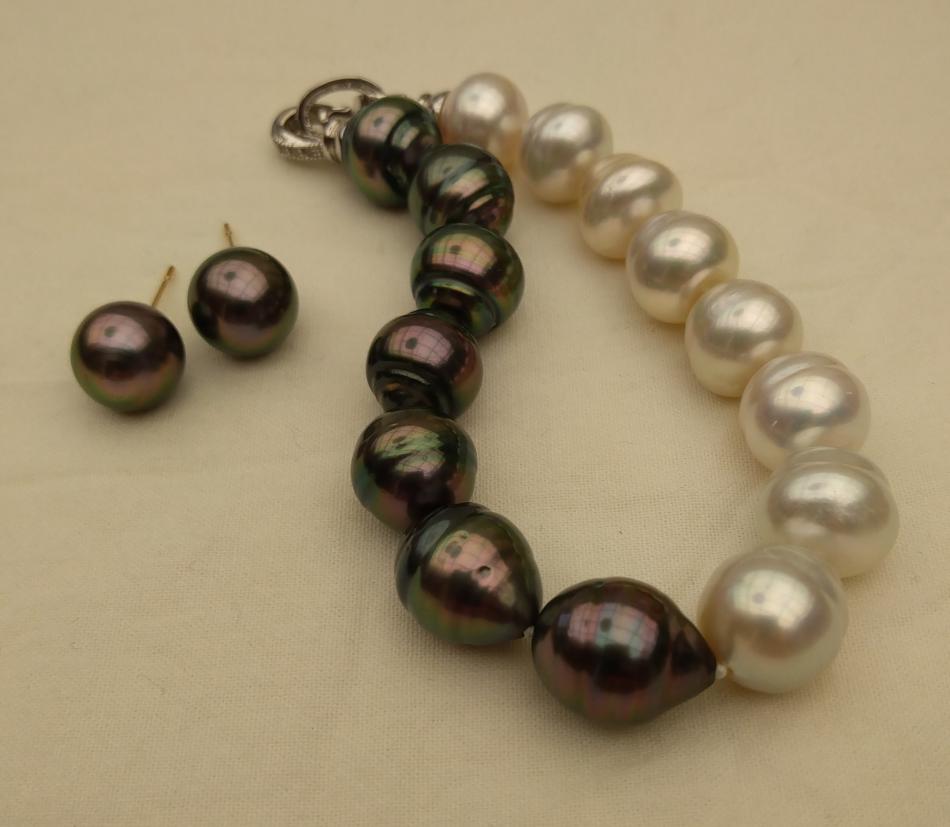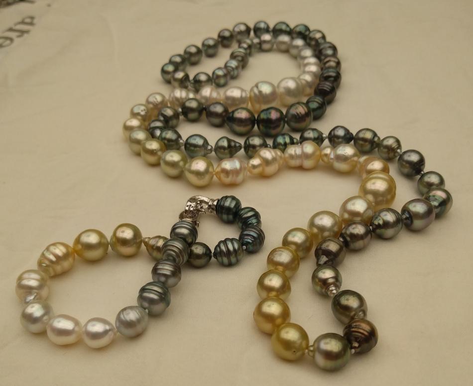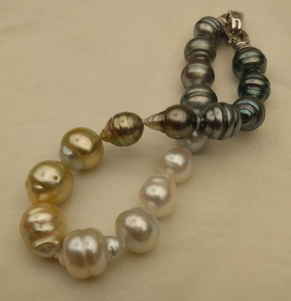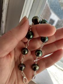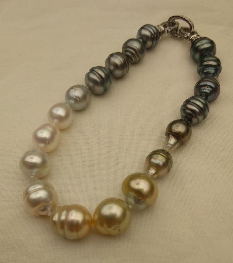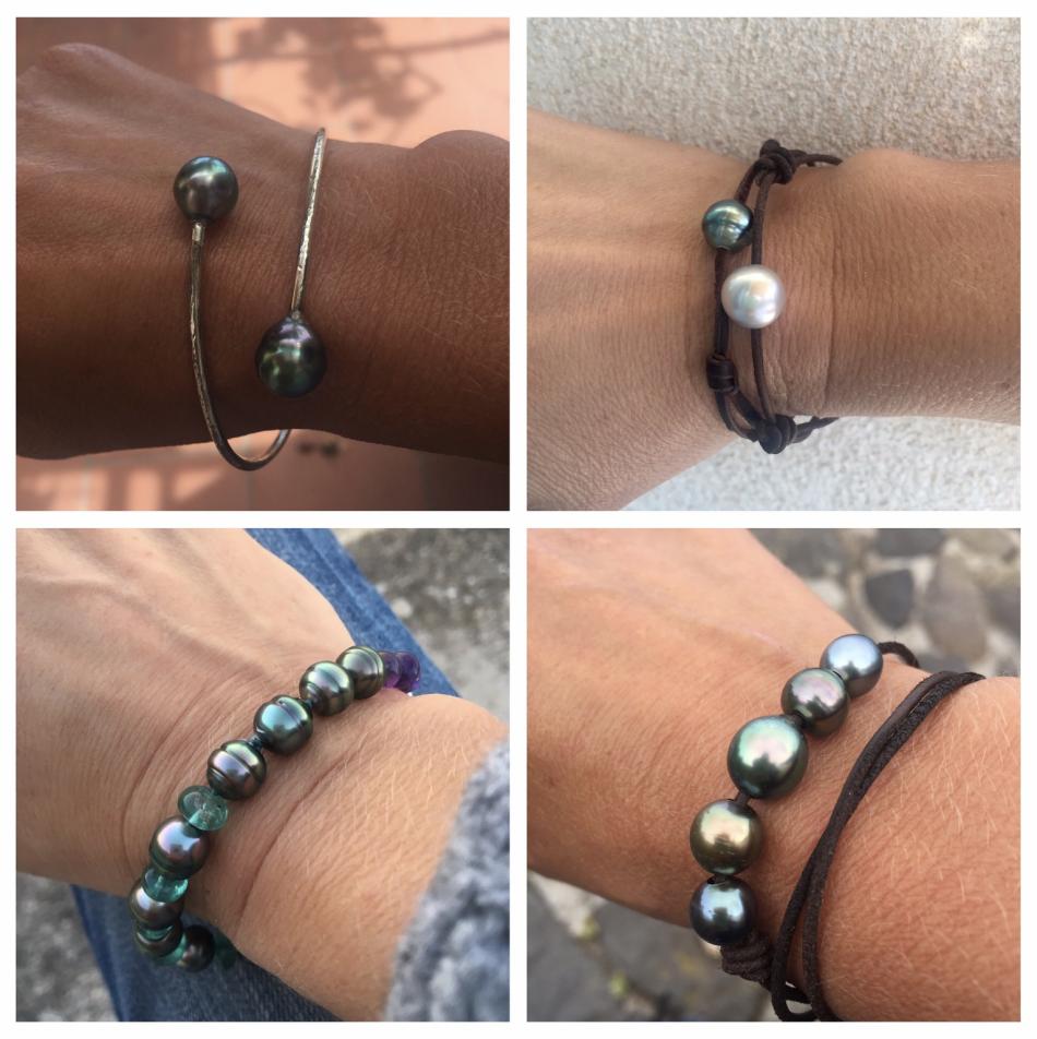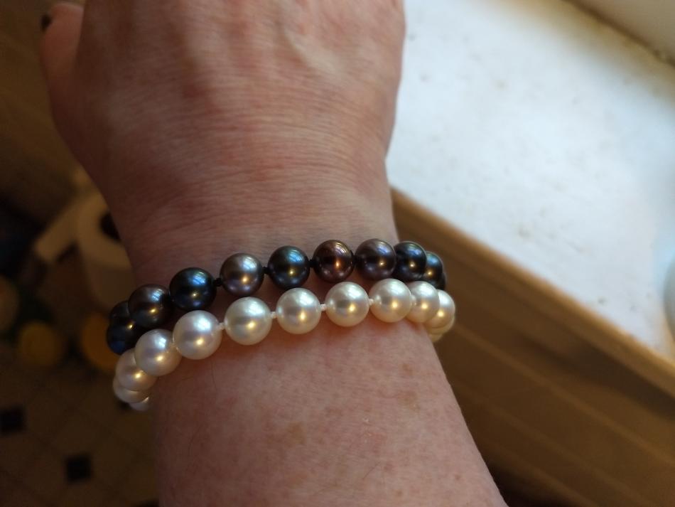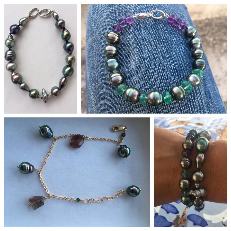I made these three 8,5 inches so that they sit nicely on my wrist. I also made a circled peacock tahitian and white south sea bracelet, the tahitians are from Druzydesign, don't remember where I got the white ones from.